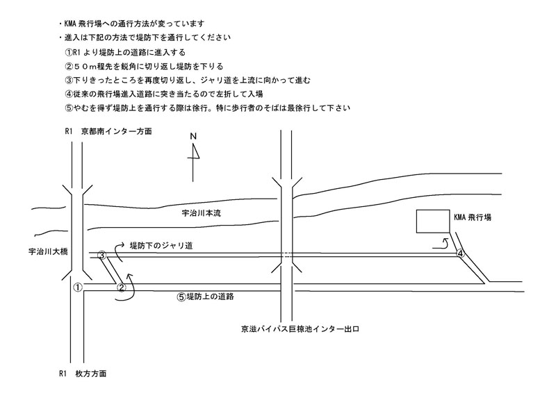 KMA関西模型飛行場では、競技開始までは堤防ゲートを開放しますが、それ以後は閉会式終了まで閉鎖致します。 従って競技途中の入出場は出来ません。 また、堤防上の道路は近隣の方々のジョギングや散歩の場となっていますので、 下の図のとおり、飛行場への入場は堤防上の道路を通らず、堤防下の河川敷を飛行場まで進んでください。 帰りも同じルートを逆行する形で退場してください。 参加者、見学者の皆さんにはご協力下さるようよろしくお願い致します。 ![]() |
