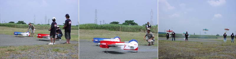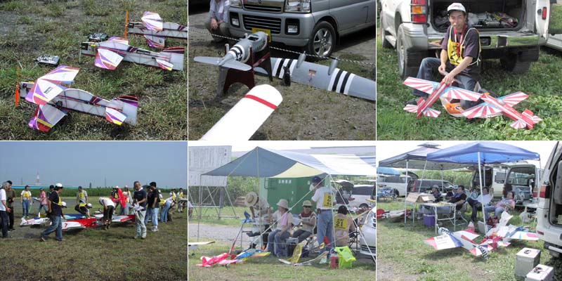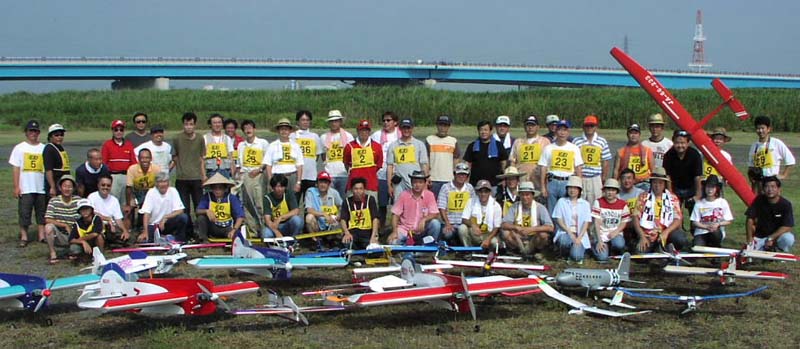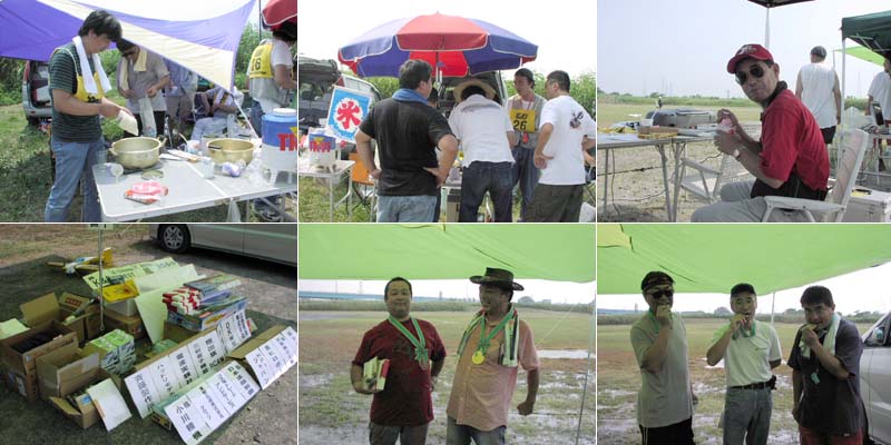 | 今年で2回目となるファンフライミーティング、4月に雨のため延期となった電動機大会と併せて「KMAファンフライ&電動ミーティング」として7月25日、京都市伏見区のKMA飛行場で開催されました。 午前9時に勢揃いした総勢39名の参加者は、猛暑を通り越して酷暑とも言える京都の夏空に、自慢の機体で秘技、珍技?の数々を披露、ギャラリーと一体になってフライトを楽しんでいました。 午前中、自由フライトを楽しんだ後、昼食時のメーカーデモフライトをはさんで午後は各人3分間のタイムラリーに挑戦、3分ちょうどで着陸した選手が2名もあらわれ、勝負は0.1秒を争うハイレベルなものとなりました。 午後2時過ぎ、雲行きがあやしくなってきたため急ぎ競技を終了、盛りだくさんの景品を抽選でお渡しし始めたのですが激しい雨、雷、強風が会場を急襲、やむなく一時車に避難、約30分後に再開し、入賞者のかたにメダルをお渡しして閉会としました。。 |