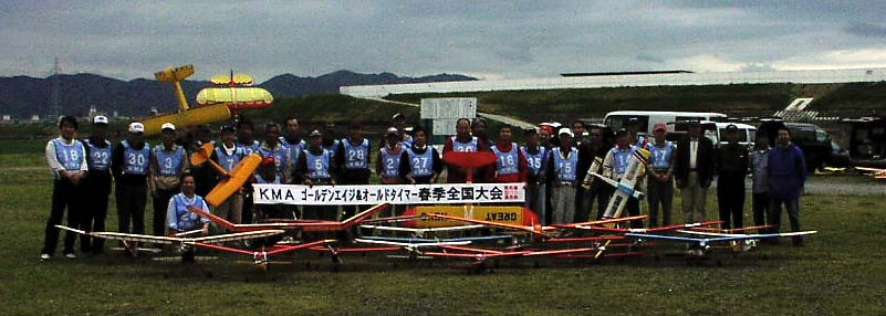 4月22日、KMAオリジナルの上記大会が、葦の新芽が萌えだして一面緑に染まった京都市伏見区のKMA 関西模型飛行場で開催された。 当日は雨との予報であったが朝には降り止んでおり、飛行場には関東、中部、北陸、近畿、山陰といつもなが ら多くの地域から、総勢42名の参加者が集まった。 予報では雨が近いとのことで、9時ちょうどからフライインを開始、4機の同時飛行で上空は絶え間なく懐か しい機体が優雅に大空を乱舞した。フライトを待つ間には、いつもどおり自慢のコレクションを持ち出す人、珍 しい機体にできる人だかり、イグニッションエンジンの音に集まる人、機体や装備品にいろいろと質問をする人 など、この大会ならではの風景があちこちで見られた。平均年齢は優に60歳を超えるこの大会ではあるが、そ れゆえにゆったりした歴史を感じさせる時間が過ぎていった。 飛行の方は、途中で降雨による中断があったものの全員1ラウンドのフライトをこなし、そのあと、2ラウンド 目として希望者のみ参加のタイムラリーを行った。 心配していた雨が昼前よりかなり強くなってきたため、1時過ぎにはフライトを終了、協賛各社よりいただいた 商品を抽選で全員に配り、早めの散会としました。 今回は雨のため十分にフライトを楽しむという訳にはいきませんでしたが、秋の大会は天気がいい(はず)です からぜひまたご参加ください。 入賞者: タイムラリー:オールドタイマーの部 1位 今儀勝一、2位 栗田信吾、3位 国山顕彦 ゴールデンエージの部 1位 赤塚勝彦、2位 東山 晋、3位 小木 進 |
