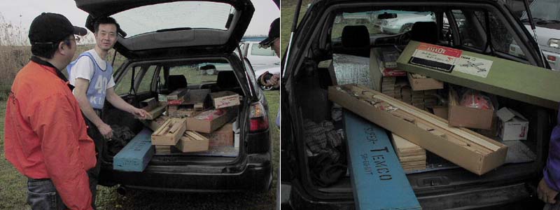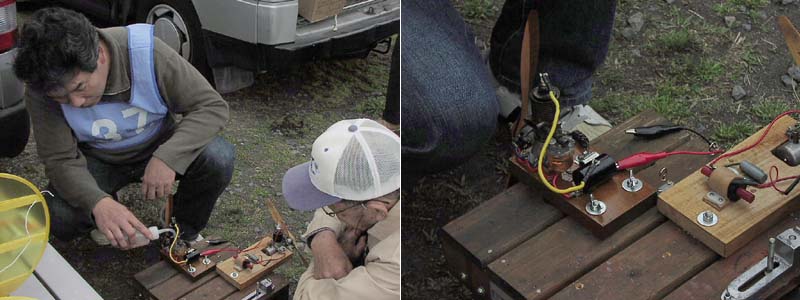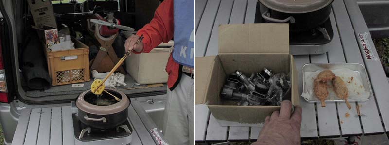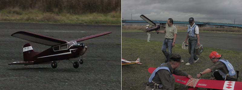 ![]() 写真左:菅原康文さんが持参した小川精機創業者小川重夫氏の愛機フグ号(レプリカ)。尾そりが着いてたんですね。 写真右:フライトを終えた菅原氏(右)と助手を務めた高松利充氏。2人は35年以上のラジコン仲間。 手前でエンジンを始動するのはベテラン大財さんと田井さん。ゴム止めの主翼が多いのもこの大会ならでは。 ![]() 左: はるばる千葉県から来られた今井彦三郎さん。右は愛知県一宮市からたくさんの仲間と来られた原 千春さん。 KMAオリジナルのこのイベントの雰囲気を楽しみに遠くから毎回駆けつけるマニアも多い。 あっ、それ僕が昔とばしたことがある、その機体、あの頃高くて買えなかったんだよねー、 などと懐かしい機体に思い出がよみがえる。これがこの大会の人気の一つ。 遠く山陰の鳥取から駆けつけた佐藤 潔さん(こちら向き)は日本のラジコンが 大きく世界に羽ばたき始めた頃の数々のキットのオリジナルのコレクションを持参。 当時を知るOK模型の高松さんと思い出話に花が咲く。 名古屋から参加の新井吉守さんは愛機アストロホッグを持参。 雨でドープ貼りの主翼がたるむのを嫌って、さっさと天ぷら屋さんに転身。 エンジンを揚げても食べられません!! ![]() ビンテージのイグニッション・ガソリンエンジンを始動する小木 進さん(左)と、それを見守る山村真平さん。 大ベテラン山村さんもKMAでは有名なイグニッションエンジンフリークです。 フライトよりもこんな時間を楽しみ参加されるかたが多いのはこの大会だけ。
