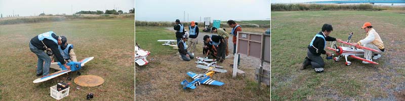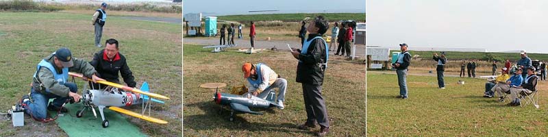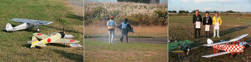 ![]() (左)KMA役員岡本氏零戦によるデモフライト (中)デモフライトに見入る選手たち (右)大ベテラン南部選手の機体「ウィルガ」 ![]() (左)猪上選手のフライベビー (中)ギャラリーの注目は精巧な小型機製作の山下氏 (右)スタントウーマンの人形を乗せたスーパーステアマン機の小川氏 ![]() (左)PT-17ステアマン機の椛島氏 (中)コルセアで参加の赤塚氏は愛知から (右)スケール競技のジャッジは左から岡本、伊藤、芝山の3氏 ![]() (左)伊藤機、零戦とスピリットオブセントルイス号 (中)赤塚氏コルセアがスタート (右)スケールの部入賞、左から2位由井、優勝小川、3位角田の各氏