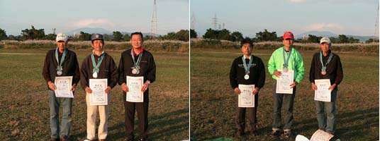 (左)タッチアンドゴーの部左から2位国山、優勝芝山、3位由井の各氏 (右)タイムトライアルの部左から2位小川、優勝栗田氏、3位国山の各氏 |