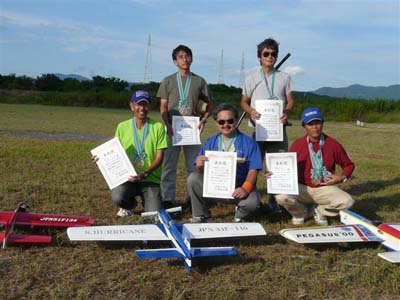 9月13日に京都市伏見区にあるKMA関西模型飛行場において、コントロールライン秋季競技大会が開催され、 関東から、九州まで31人の選手が集まりました。 競技は、F2Bオープンと、F2Bプロフィール、第2種曲技小型機、そして風船割の4種目です。参加者は、 ダブルエントリーなどして延人数は55名になりました。 風船割り競技では、塚本千景さんと江松莉子ちゃんの2名の女子選手が出場しました。 千景さん1個割って16点を獲得しました。 第2種小型機では、東海中部地区が優勢で、村田、末松、清水の3選手が、入賞しました。 F2Bプロフィールも、東海、中部地区が優勢で、村田、末松選手が1, 2位になり、関西の中山選手は3位でした。 Uコンの花形、F2Bオープン級は関東のベテラン原選手でした。東海、中部の末松、村田選手が2、3位となり、 関西の船本選手は惜しいところで4位になりました。 今回も参加選手は45〜55才の方が中心で、昔Uコンをやっていたという方たちでした。 江松幸弘さんの娘さんの莉子ちゃんが中学生で一番若くて、最年少者賞を貰いました。 入賞者 風船割り:1位 中林克夫、2位 杉山貢司、3位 蓑田尚人、同点3位 中尾 洋 第2種小型機; 1位 村田浩司、2位 末松茂樹 3位 清水英敏 F2Bプロフィール; 1位 末松茂樹、2位 村田浩司、3位 原田泰一 F2Bオープン; 1位 原 誉祠、2位 村田浩司、 3位 末松茂樹 (文、写真:竹林 悟) |