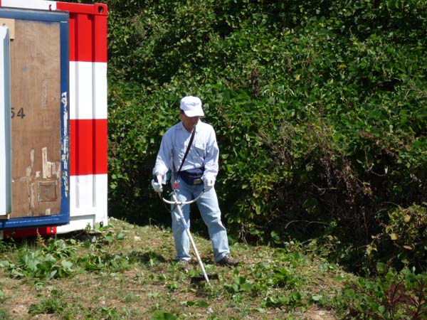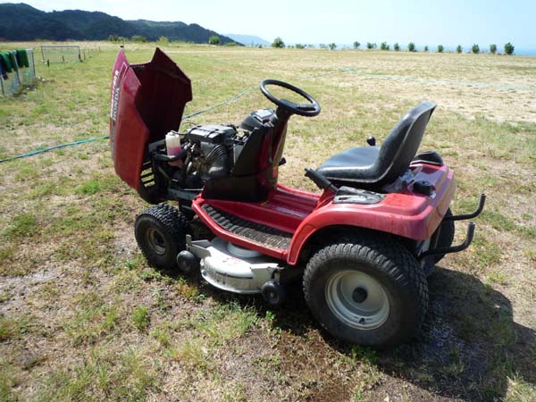 メンバーは岡田さん、橋本実さん、山本で、天候は晴れ、台風への吹き込みか涼しい北の風が斜面に沿って強く吹き上げ、冬の景色を思わせる海の色とともに、季節の移り変わりが確実に進んでいることを実感しました。 心配された芝ですが、先週末に降った雨のお陰か、かなり復活していました。また、飛行場西側の草地は全く問題なく青々としていました。 問題のポンプですが、水がほぼ満水状態でしたので問題なく散水することができました。ただ飛行場の端近くまではかなりの距離になりますのでホースの弱いところが外れて水漏れしたり、かなり苦労しました。 芝刈り機もこれまでずいぶん活躍してくれましたので、水を使ってたまったゴミ、埃を洗い流しましたが、あちこちメンテしなければならなくなってきたようです。 まず、パーキングブレーキのケーブルが切れているようで修理の必要があります。また、バッテリーの端子が青白く錆びてましたので橋本さんが清掃、CRCで処置をしてくれました。 替え刃は前回取り外したものを岡田さんに渡し、値段見合いですがそんなに高くなければ3セットほど買ってくれるようお願いしておきました。 涼しくなってきましたので、一度ゆっくりと点検整備しなければなりませんね。寒くなるとつらいですから。 それでは当日の様子を画像でご覧ください。 |