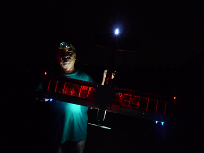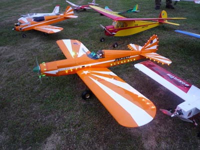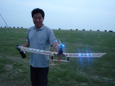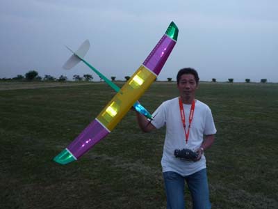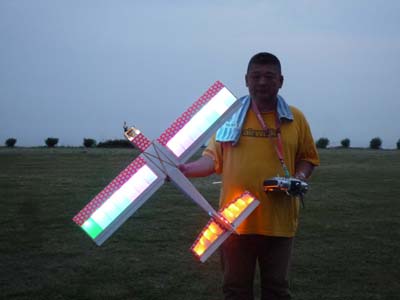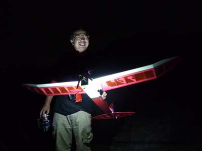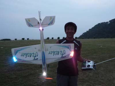 | 7月10日、KMA初の試みとしてナイトフライトミーティングを開催しました。 場所はKMA淡路市・貴船模型飛行場、私有地内の飛行場ですが静かな集落に近い場所での夜間行事と言うことで、事前にニューカテゴリー委員会役員が地元淡路警察署、地区消防団、地区自治会、飛行場のある造成地を管理する土地管理組合、老人ホームあわじ荘などに催しの趣旨と安全、騒音対策などの説明を行い、ご理解を得た上での実施です。 恐らく夜間飛行だけに絞ったイベントはあまり例がないということで、どれだけの参加者があるか心配しましたが、何と13人の勇気ある?マニアが20機近い機体を持参してKMA初のイベントを盛り上げてくれました。 集まった機種はモーターグライダーやファンフライ機、電動スポーツ機などの電動モデルが大多数を占めましたが、ヘリやエンジン機も加わり多彩なラインアップとなりました。 今回のイベントの目的の一つである夜間飛行のノウハウ収集という意味で興味のあった照明方法ですが、定石どうりLED(発光ダイオード)を機体各所にちりばめた「パチンコ屋タイプ」(名古屋パチンコ仕様はLED136個ちりばめてました!!)、主翼や尾翼の中にLEDを仕込んで光らせる「あんどんタイプ」(守山ラブホ仕様?)、実車用高輝度LEDバンドで要所要所を棒状に明るく目立たせて曲技飛行での激しい姿勢変化でも機体を見失わないように考慮した「大阪通天閣タイプ」、強力なパワーLEDで自分を照らす「セルフ・ライトアップタイプ」、そして目からウロコの「100均・光りん棒貼っただけタイプ」などさまざまなアイデアと苦労が見受けられました。 スケジュールは午後3時受付、朝から有志の皆さんで草刈をしていただいた素晴らしい滑走路で日没にかけてテスト飛行と慣熟飛行を行い、午後7時15分の日没あたりから点灯飛行に移りました。当日の天候は曇り、ほぼ無風、月齢27の闇夜というナイトフライトを行うには文句の無い条件が揃いました。 薄暮から暗くなるに従い、周囲の明るさに応じておのおの自分の判断でフライトを楽しみ、8時を過ぎてからは我こそはと自信のあるフライヤーが真っ暗闇の中で美しい光跡を残して華麗なフライトを行い、ギャラリーと一体になってファンタスティックな情景を楽しみました。 ほぼ予定どおりの午後9時過ぎ、全く事故も無く無事に飛行を終了、全員大満足で早くも次回の開催をリクエストされるなど、ニューカテゴリー委員会の当初の予想を遙かに超えた新鮮さ、楽しさを満喫出来た催しとなりました。 最後になりましたが、当日朝早くから飛行場整備をしていただいた有志のかたがた、今回の開催にご理解を頂いた地元諸団体のかたがた、そして協賛いただいたOK摸型様、カシオペア様に心からお礼を申し上げます。 (文:KMA 山本修造 ) |