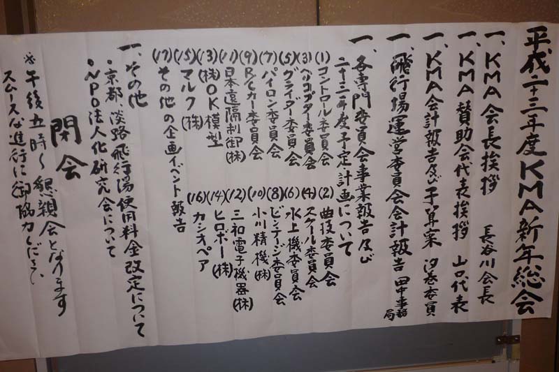 最初に行われた総会では、昨年度の会計報告・予算案、昨年度の事業報告及び今年度の行事予定が提案、承認されました。 ラジコン人口が減少しつつあると言われる昨今ですが、KMAは京都市伏見区の関西模型飛行場、兵庫県淡路市の淡路市・貴船模型飛行場の2拠点を中心にますますイベントの充実、発展を遂げていることが報告からうかがえました。 総会の後は宴会場に場所を替えて懇親会となります。KMA加盟クラブのメンバー、KMA役員、そしてラジコン模型関係のご来賓にも多数ご参加いただき、年に1回の顔合わせというメンバーも多く、いつもどおり交流の輪が広がっていました。 (文:山本修造 写真:株式会社放送出版プランニングセンター 北川さん、山本修造) |