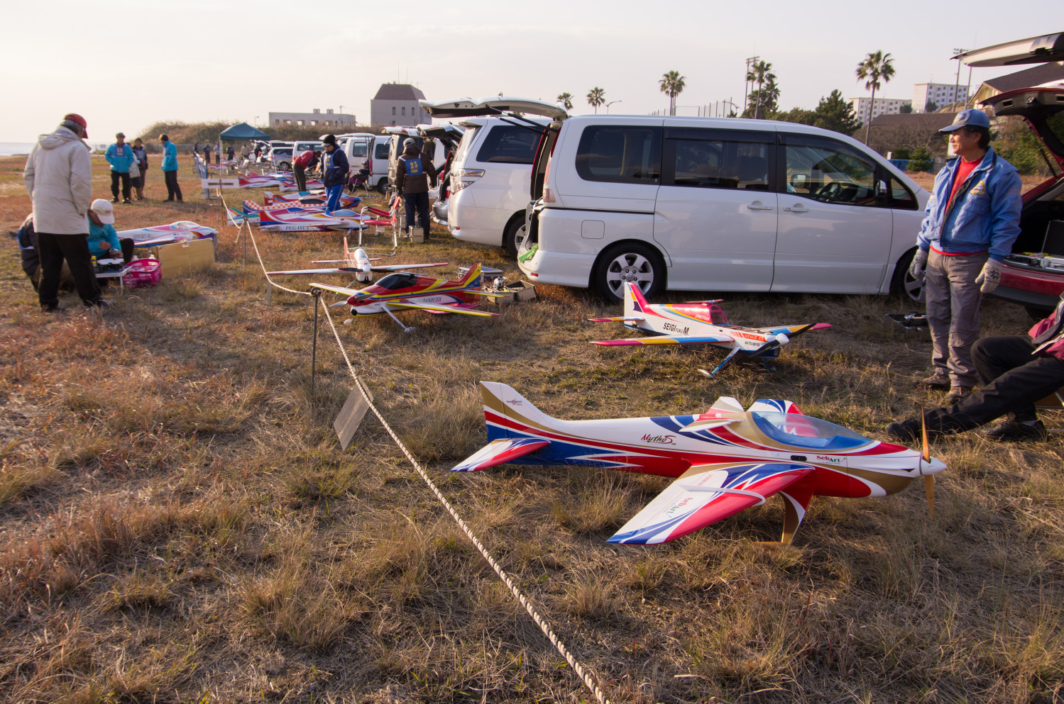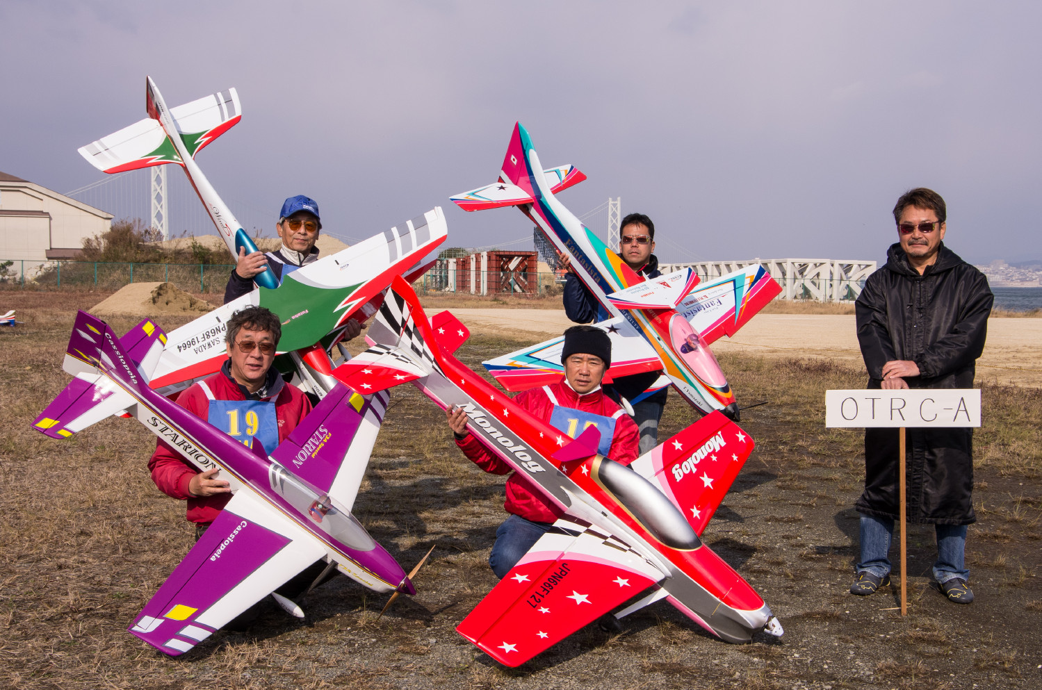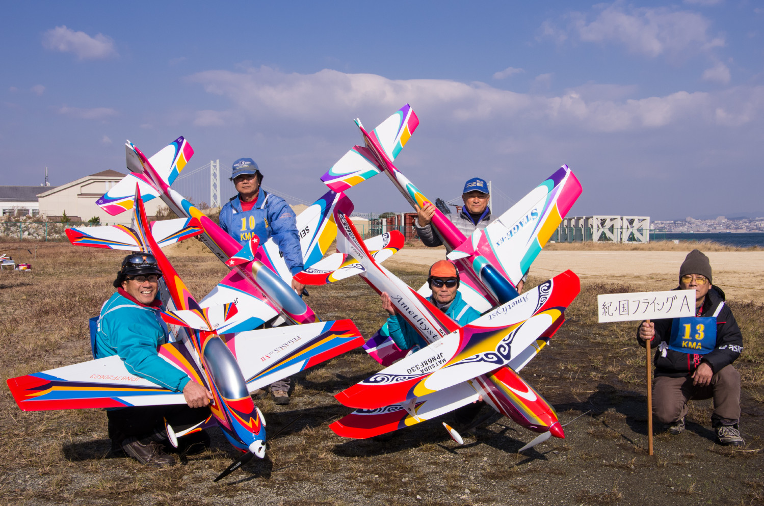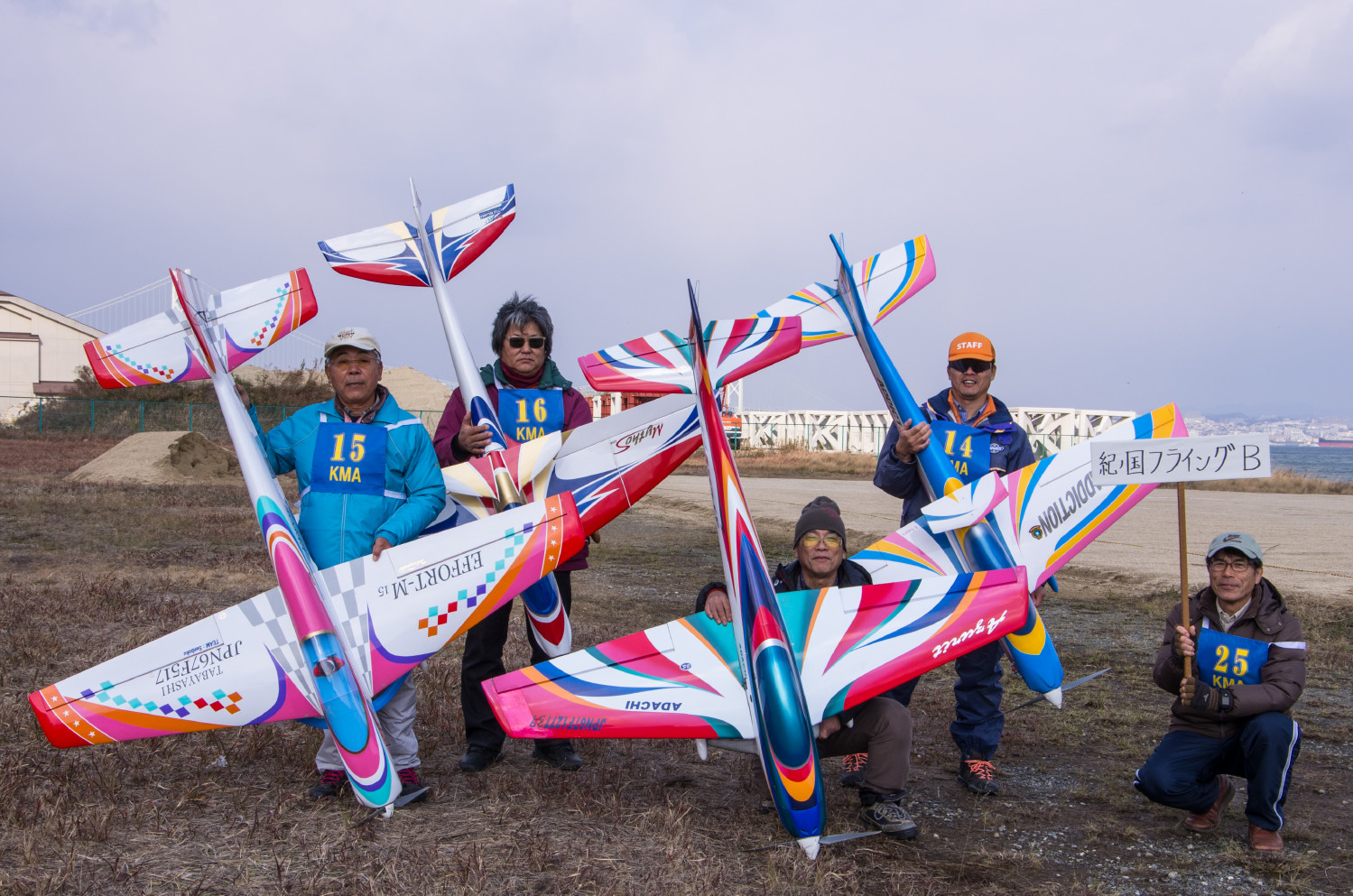 | 11月10日に予定されていましたこの大会、当日は台風のような低気圧の影響にて早朝から強風と雨の天候のもと、皆さんが集まってくれました。テントを建てるも強風のため、4人で押さえていなければならないくらいです。開催が危ぶまれ、出場者の皆様と協議の結果、12月15日に順延することになりました。 12月14日(前日)の滑走路整備では滑走路の中央まで延びた雨による侵食。着陸でここに脚を捕られればスタント機の固定脚はもぎ取られ、最悪は転倒するくらいの溝でした。練習飛行に来られていた金森さんにお手伝いいただき、何とか問題ないレベルに修復しました。ありがとうございました。この日も風が強く着陸はかなり難しい状況で、明日も同じくらいの風が吹く予報ですが、弱くなることを祈って帰宅しました。 そして12月15日です。天気は晴れですが、朝から強風が吹いています。地上で7〜8mくらいでしょう。上空では軽く10mを超えているようです。油断をするとスピンなどでは、あっという間に50mくらいは流されます。方向は、少し左よりの後ろ風です。難しい着陸になることが予想されます。 今年は7チーム(4名/チーム)が集まりました。ほとんどが電動機(22機)でエンジン機は6機のみでした。優勝候補のOTRC-Aは日程変更のため、大幅にメンバーが変わり、選手権メンバーが少なくなっていました。OTRC-Bは4人全員エンジン機です。OTRC会長は親子で参加していました。成績は息子の勝利でした。フライト順はくじ引きで決め、太陽がフレームから出て、まぶしくない状態になってからスタートです。一番手はブルーウイングBの清水選手です。やはり風が強いのがわかります。出場者は飛びから風を読もうと真剣なまなざしで見つめておりました。そんな中、一番手ではブルーウイングAの金森選手、紀の国フライングAの沖平選手が風を感じさせない見事なフライトを見せていました。後ろ風が強いためか、途中でかなりパワーダウンする電動機が続出しています。ブルーウイングAの2番手の内藤選手は前半、見事な飛行をしていたのに、後半パワーダウンで崩れました。惜しいフライトでした。OTRC-Aの三間選手もしかりで、実力を発揮できなかった一人でした。前日練習で脚を壊し、70電動クラスで出場された山本選手、エンジンを壊して同じく70電動機だったOTRC-Aの加藤選手など実力を発揮できなかった方々が多かった大会でした。 3番手では田林選手が、パワーダウンで、あわや海への不時着かと思わせるも、見事な操縦で滑走路へ。みんな拍手喝采でした。4番手ではブルーウイングAの桝田選手が出場者中で最高得点をたたき出し、次点の金森選手とともにブルーウイングAを2位に導いていました。 そんな状況の中、紀の国フライングAチームの4名は安定したフライトを見せ、高得点をたたき出し見事に優勝となり、今年から新しくなった優勝カップをさらっていきました。2位はブルーウイングAチーム、3位はOTRC-Aチームでした。 詳細な結果はこちらをご覧ください。 今年は7チームが集まっていただきありがとうございました。ぜひ来年は8チームを目指してもっと楽しく、盛り上げて生きたいと思います。寒い中、ジャッジを務めていただきました岡田様、中田様、また本部にて集計など実施いただきました山原様、藤本様には感謝いたします。 (文と写真:KMA曲技委員長 神戸祥明) |