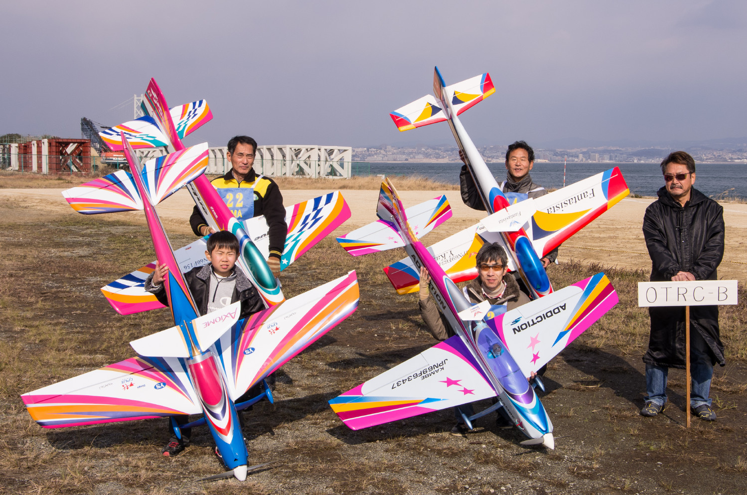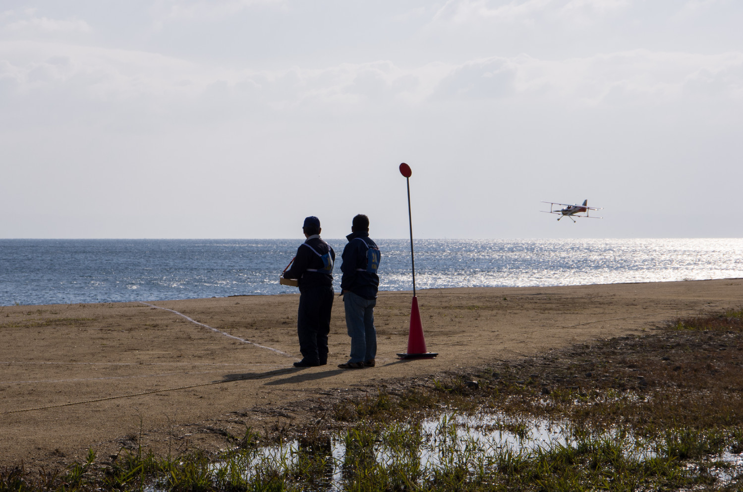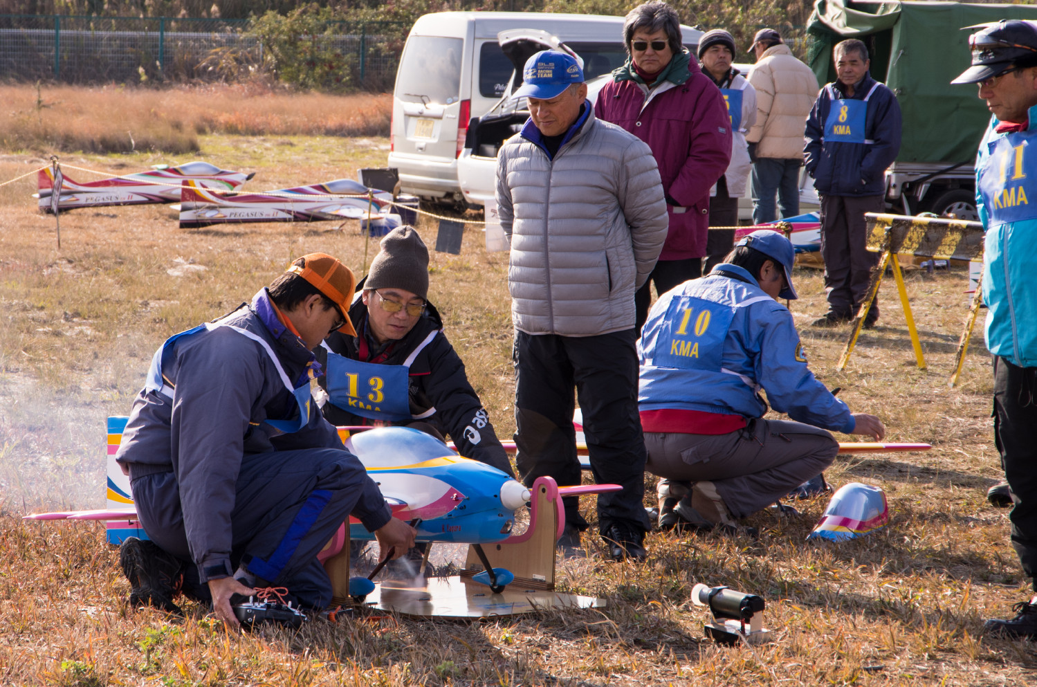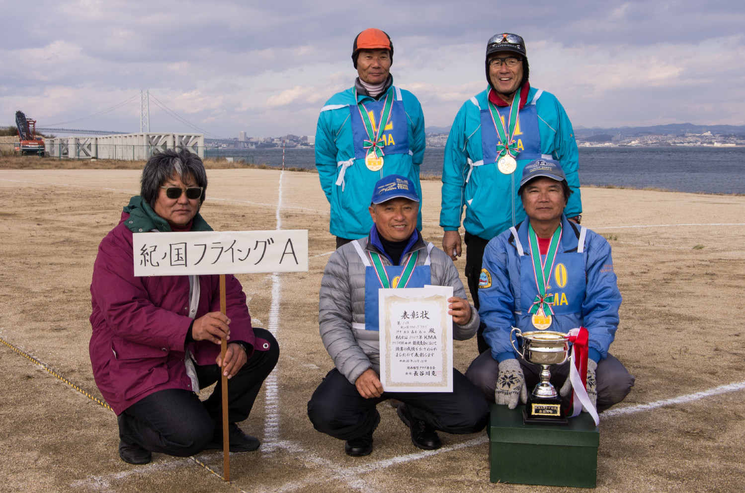 | 11月10日に予定されていましたこの大会、当日は台風のような低気圧の影響にて早朝から強風と雨の天候のもと、皆さんが集まってくれました。テントを建てるも強風のため、4人で押さえていなければならないくらいです。開催が危ぶまれ、出場者の皆様と協議の結果、12月15日に順延することになりました。 12月14日(前日)の滑走路整備では滑走路の中央まで延びた雨による侵食。着陸でここに脚を捕られればスタント機の固定脚はもぎ取られ、最悪は転倒するくらいの溝でした。練習飛行に来られていた金森さんにお手伝いいただき、何とか問題ないレベルに修復しました。ありがとうございました。この日も風が強く着陸はかなり難しい状況で、明日も同じくらいの風が吹く予報ですが、弱くなることを祈って帰宅しました。 そして12月15日です。天気は晴れですが、朝から強風が吹いています。地上で7〜8mくらいでしょう。上空では軽く10mを超えているようです。油断をするとスピンなどでは、あっという間に50mくらいは流されます。方向は、少し左よりの後ろ風です。難しい着陸になることが予想されます。 今年は7チーム(4名/チーム)が集まりました。ほとんどが電動機(22機)でエンジン機は6機のみでした。優勝候補のOTRC-Aは日程変更のため、大幅にメンバーが変わり、選手権メンバーが少なくなっていました。OTRC-Bは4人全員エンジン機です。OTRC会長は親子で参加していました。成績は息子の勝利でした。フライト順はくじ引きで決め、太陽がフレームから出て、まぶしくない状態になってからスタートです。一番手はブルーウイングBの清水選手です。やはり風が強いのがわかります。出場者は飛びから風を読もうと真剣なまなざしで見つめておりました。そんな中、一番手ではブルーウイングAの金森選手、紀の国フライングAの沖平選手が風を感じさせない見事なフライトを見せていました。後ろ風が強いためか、途中でかなりパワーダウンする電動機が続出しています。ブルーウイングAの2番手の内藤選手は前半、見事な飛行をしていたのに、後半パワーダウンで崩れました。惜しいフライトでした。OTRC-Aの三間選手もしかりで、実力を発揮できなかった一人でした。前日練習で脚を壊し、70電動クラスで出場された山本選手、エンジンを壊して同じく70電動機だったOTRC-Aの加藤選手など実力を発揮できなかった方々が多かった大会でした。 3番手では田林選手が、パワーダウンで、あわや海への不時着かと思わせるも、見事な操縦で滑走路へ。みんな拍手喝采でした。4番手ではブルーウイングAの桝田選手が出場者中で最高得点をたたき出し、次点の金森選手とともにブルーウイングAを2位に導いていました。 そんな状況の中、紀の国フライングAチームの4名は安定したフライトを見せ、高得点をたたき出し見事に優勝となり、今年から新しくなった優勝カップをさらっていきました。2位はブルーウイングAチーム、3位はOTRC-Aチームでした。 詳細な結果はこちらをご覧ください。 今年は7チームが集まっていただきありがとうございました。ぜひ来年は8チームを目指してもっと楽しく、盛り上げて生きたいと思います。寒い中、ジャッジを務めていただきました岡田様、中田様、また本部にて集計など実施いただきました山原様、藤本様には感謝いたします。 (文と写真:KMA曲技委員長 神戸祥明) |