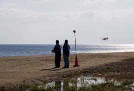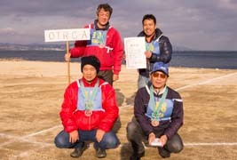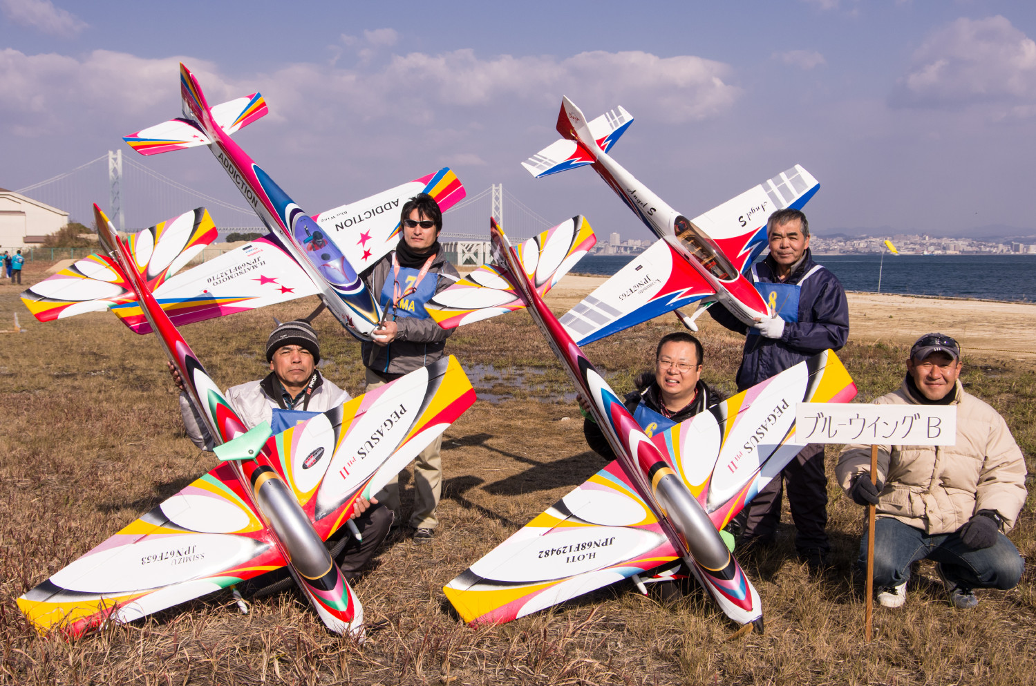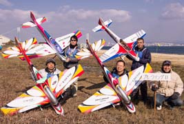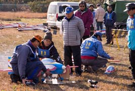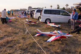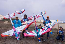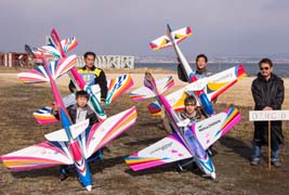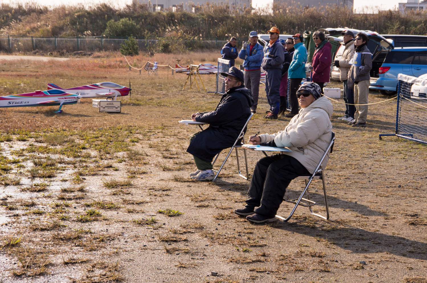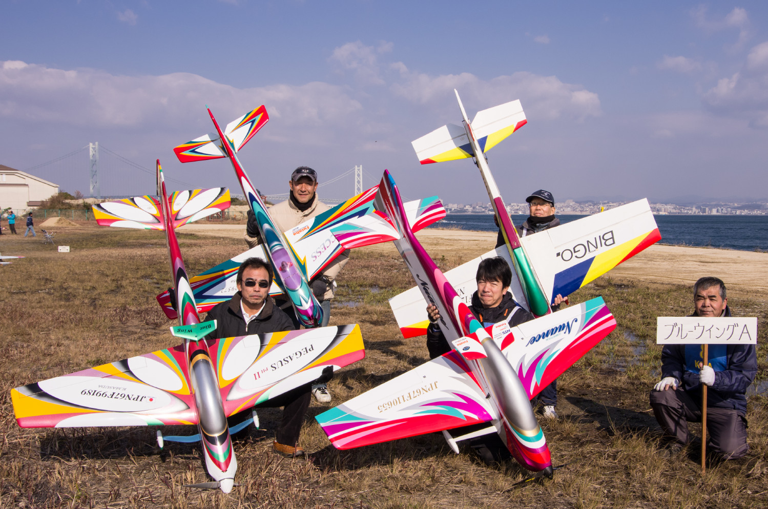 | 11月10日に予定されていましたこの大会、当日は台風のような低気圧の影響にて早朝から強風と雨の天候のもと、皆さんが集まってくれました。テントを建てるも強風のため、4人で押さえていなければならないくらいです。開催が危ぶまれ、出場者の皆様と協議の結果、12月15日に順延することになりました。 12月14日(前日)の滑走路整備では滑走路の中央まで延びた雨による侵食。着陸でここに脚を捕られればスタント機の固定脚はもぎ取られ、最悪は転倒するくらいの溝でした。練習飛行に来られていた金森さんにお手伝いいただき、何とか問題ないレベルに修復しました。ありがとうございました。この日も風が強く着陸はかなり難しい状況で、明日も同じくらいの風が吹く予報ですが、弱くなることを祈って帰宅しました。 そして12月15日です。天気は晴れですが、朝から強風が吹いています。地上で7〜8mくらいでしょう。上空では軽く10mを超えているようです。油断をするとスピンなどでは、あっという間に50mくらいは流されます。方向は、少し左よりの後ろ風です。難しい着陸になることが予想されます。 今年は7チーム(4名/チーム)が集まりました。ほとんどが電動機(22機)でエンジン機は6機のみでした。優勝候補のOTRC-Aは日程変更のため、大幅にメンバーが変わり、選手権メンバーが少なくなっていました。OTRC-Bは4人全員エンジン機です。OTRC会長は親子で参加していました。成績は息子の勝利でした。フライト順はくじ引きで決め、太陽がフレームから出て、まぶしくない状態になってからスタートです。一番手はブルーウイングBの清水選手です。やはり風が強いのがわかります。出場者は飛びから風を読もうと真剣なまなざしで見つめておりました。そんな中、一番手ではブルーウイングAの金森選手、紀の国フライングAの沖平選手が風を感じさせない見事なフライトを見せていました。後ろ風が強いためか、途中でかなりパワーダウンする電動機が続出しています。ブルーウイングAの2番手の内藤選手は前半、見事な飛行をしていたのに、後半パワーダウンで崩れました。惜しいフライトでした。OTRC-Aの三間選手もしかりで、実力を発揮できなかった一人でした。前日練習で脚を壊し、70電動クラスで出場された山本選手、エンジンを壊して同じく70電動機だったOTRC-Aの加藤選手など実力を発揮できなかった方々が多かった大会でした。 3番手では田林選手が、パワーダウンで、あわや海への不時着かと思わせるも、見事な操縦で滑走路へ。みんな拍手喝采でした。4番手ではブルーウイングAの桝田選手が出場者中で最高得点をたたき出し、次点の金森選手とともにブルーウイングAを2位に導いていました。 そんな状況の中、紀の国フライングAチームの4名は安定したフライトを見せ、高得点をたたき出し見事に優勝となり、今年から新しくなった優勝カップをさらっていきました。2位はブルーウイングAチーム、3位はOTRC-Aチームでした。 詳細な結果はこちらをご覧ください。 今年は7チームが集まっていただきありがとうございました。ぜひ来年は8チームを目指してもっと楽しく、盛り上げて生きたいと思います。寒い中、ジャッジを務めていただきました岡田様、中田様、また本部にて集計など実施いただきました山原様、藤本様には感謝いたします。 (文と写真:KMA曲技委員長 神戸祥明) |