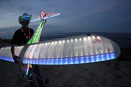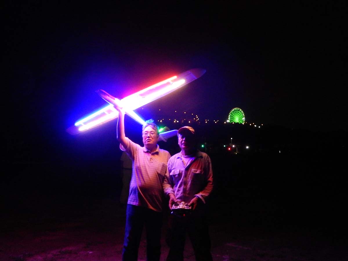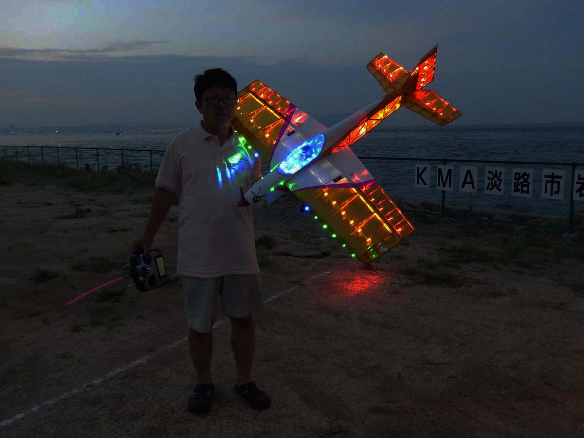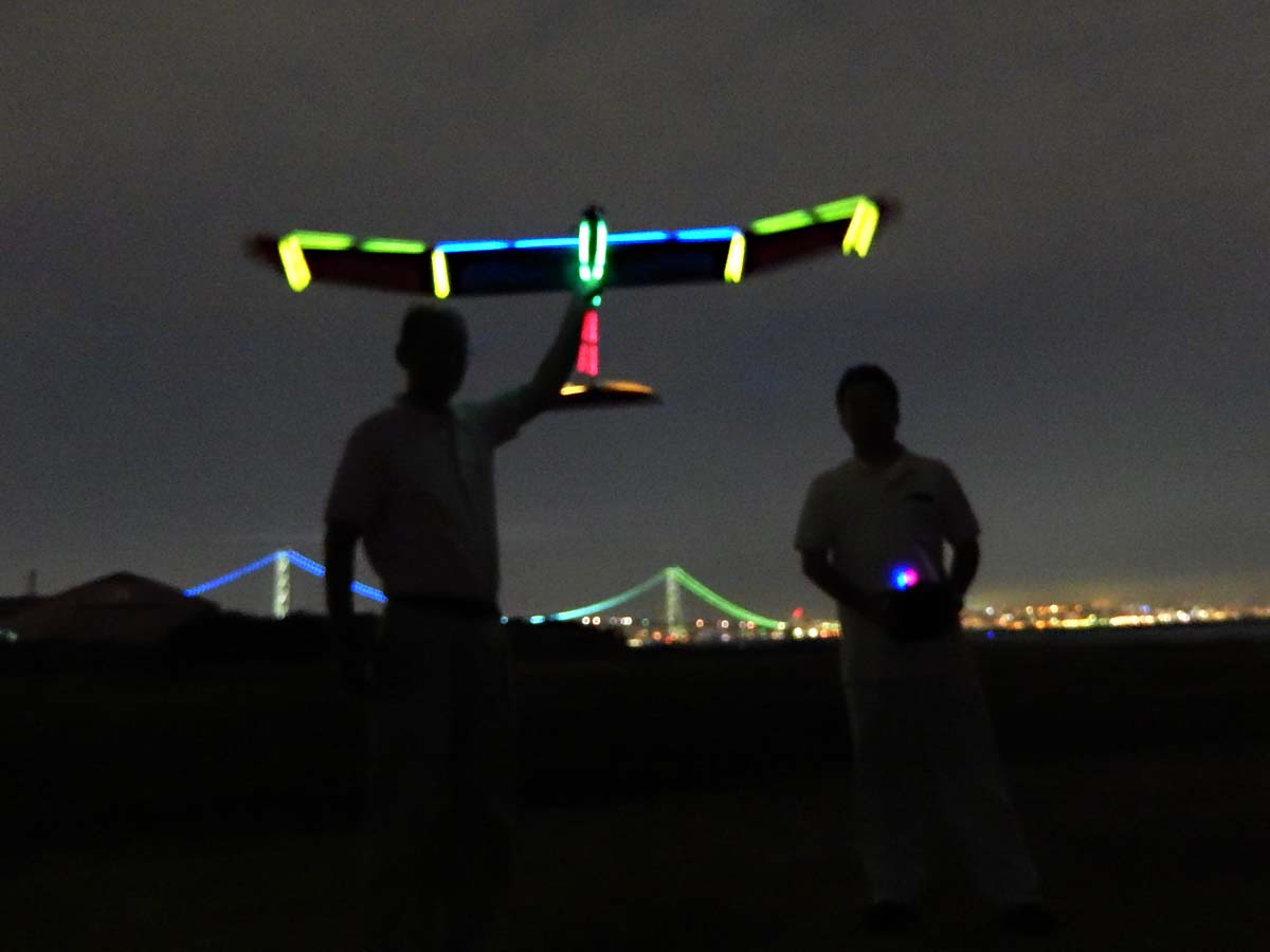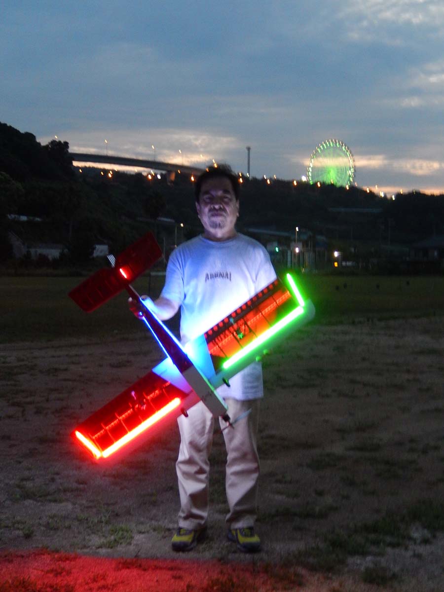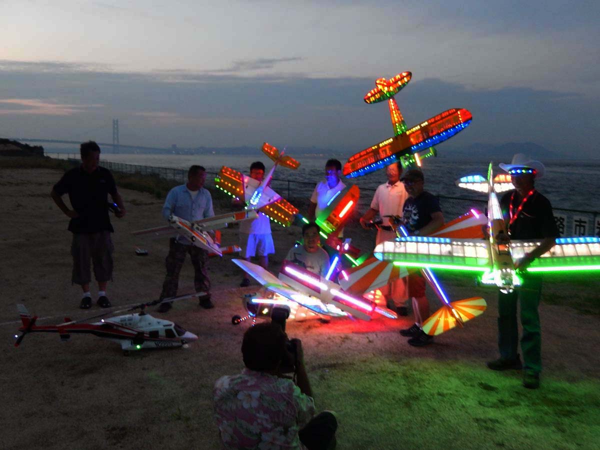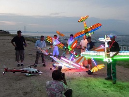 | 「やはり夏の夜はこれに限りますなー」と2014年7月12日 兵庫県淡路市のKMA淡路市・岩屋模型飛行場で、KMAニューカテゴリー研究会が主宰する上記催しが開催されました。 迎えて4回目となるこのイベント、直前に台風が来るとの事でやきもきさせられましたが予想外に早く通り過ぎ、当日は朝から真夏の日差しが照りつける好天となりました。 いつも通り、皆さん趣向を凝らした愛機を持って、早い人は朝のうちから三々五々飛行場に集まり、日の高いうちにテスト飛行やLEDライトの準備に余念がありませんでした。 また会場のあちこちでは情報交換などに輪が出来、それぞれの機体のウンチクを聞くなど、この大会ならではの風景も見られました。 この時期、日没は7時過ぎですが本当に暗くなるのはまだまだ先です。 それでも待ちかねたメンバーが次々とライトを点灯してナイトフライトを始めました。最近のLEDは高輝度タイプが多く、少々周りが明るくても機体は明るく光り輝き本番の美しさを期待させます。。 日没とともに飛行場から見える明石海峡大橋と淡路SAの観覧車もライトアップを開始、周囲もどんどん暗くなってきた午後8時頃、ナイトフライトの雰囲気も盛り上がって来たところで皆さん続々と本番?のデモンストレーションを開始しました。 機体は電動飛行機、エンジン機、モーターグライダー、ヘリとt多種多彩で、それぞれ個性的な光の帯を夜空に描きます。 幸か不幸か上空は雲が多く、月の光も遮られて機体のイルミネーションが描く光の帯が鮮やかに浮かび上がり、フライヤーもギャラリーも真夏の夜のフライトに酔いしれていました。 また、遠景に浮かび上がる明石海峡大橋のライトアップとのコラボも楽しく、過去に貴船飛行場で行った真の闇の中とは雰囲気の異なる、華麗な舞台での飛行となりました。 皆さん、あまりの美しさ、楽しさに時間のたつのを忘れてフライトは続き、結局予定の9時を30分オーバーするまで飛ばし続けました。 心配された事故もなく、全機無事に夜の飛行場からの離発着をこなし、またぜひ次回もこの地で開催をということでお開きとしました。 ・参加者と機体の照明データなどはこちらからご覧ください。なお、データは申込時点のものです。 (お断り) このイベントは 誰でも、何処ででもラジコン模型による夜間飛行をすることを勧めるものではありません。 (社)関西模型クラブ連合会が専用飛行場で、参加者がラジコン保険等に加入していること、無線機は日本ラジコン電波安全協会で認証を受けた製品に限ること、当日参加者の機材、操縦技術等を事前に審査するなど、万全の安全性確保の施策を行ったうえで夜間飛行を実施したものです。 (写真:駒宮康隆、山本修造 文:山本修造) |