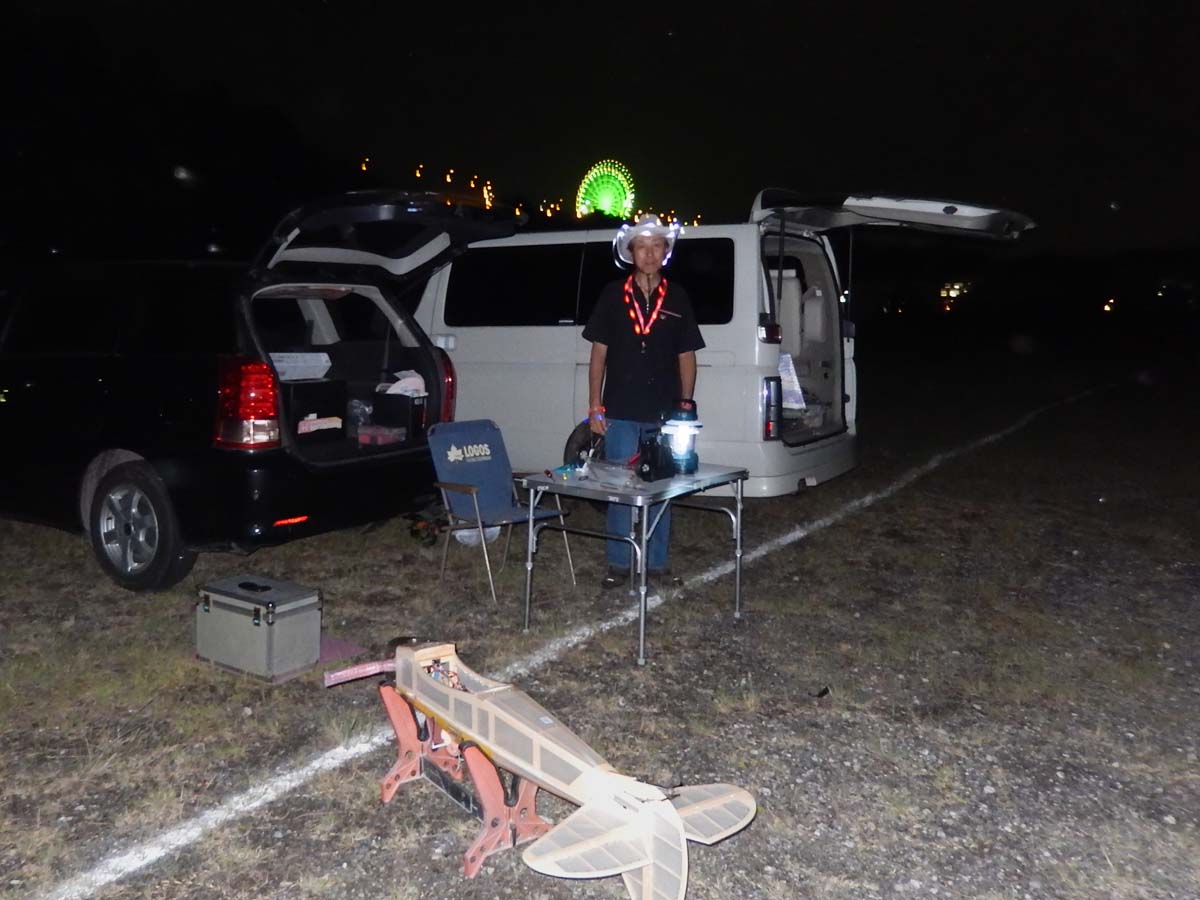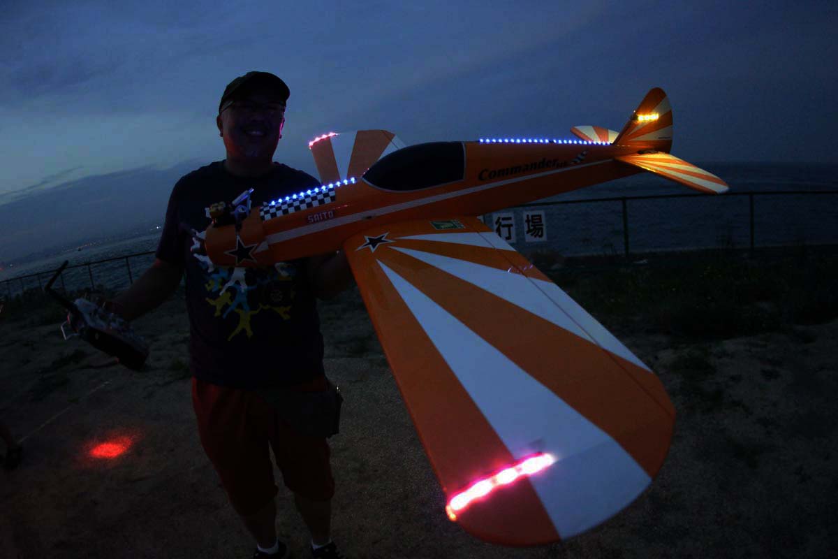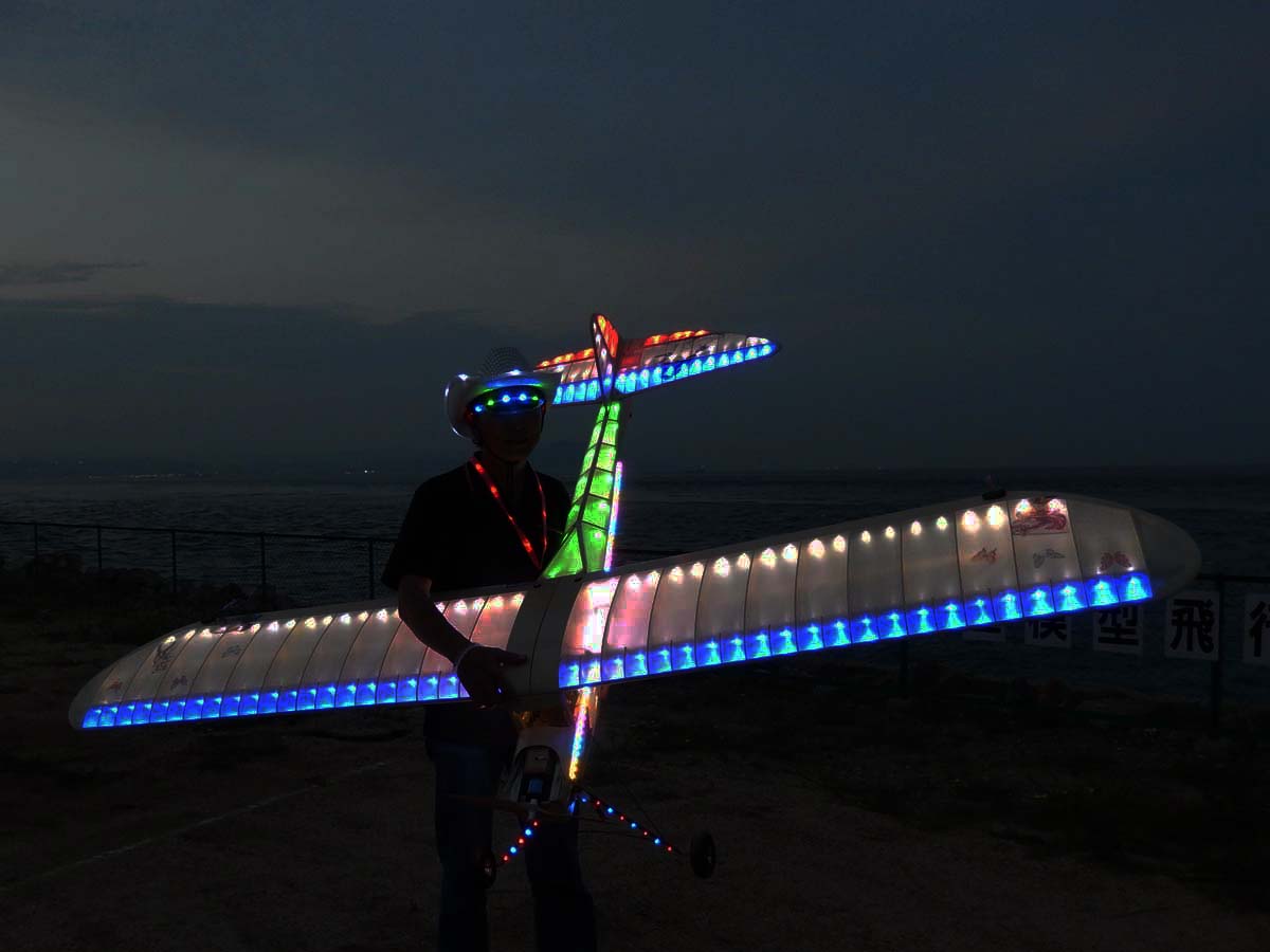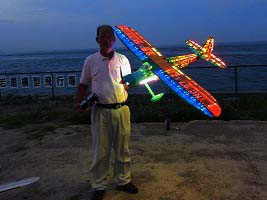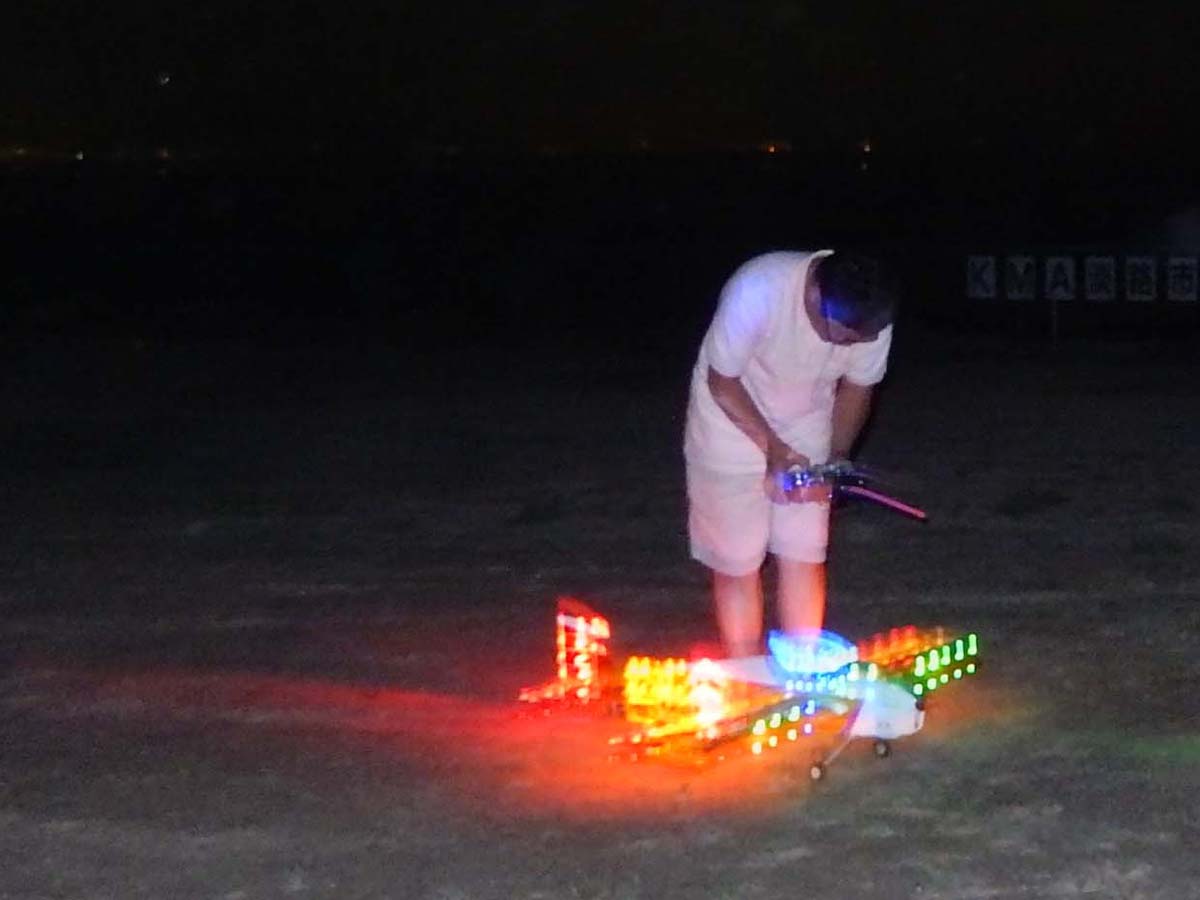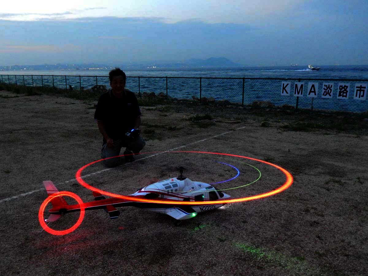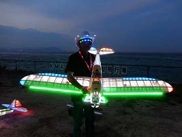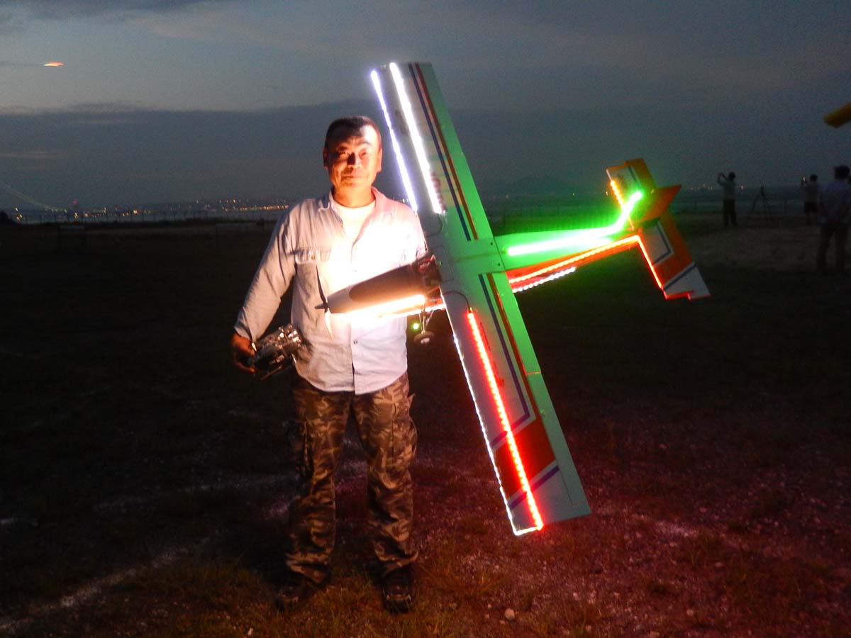 | 「やはり夏の夜はこれに限りますなー」と2014年7月12日 兵庫県淡路市のKMA淡路市・岩屋模型飛行場で、KMAニューカテゴリー研究会が主宰する上記催しが開催されました。 迎えて4回目となるこのイベント、直前に台風が来るとの事でやきもきさせられましたが予想外に早く通り過ぎ、当日は朝から真夏の日差しが照りつける好天となりました。 いつも通り、皆さん趣向を凝らした愛機を持って、早い人は朝のうちから三々五々飛行場に集まり、日の高いうちにテスト飛行やLEDライトの準備に余念がありませんでした。 また会場のあちこちでは情報交換などに輪が出来、それぞれの機体のウンチクを聞くなど、この大会ならではの風景も見られました。 この時期、日没は7時過ぎですが本当に暗くなるのはまだまだ先です。 それでも待ちかねたメンバーが次々とライトを点灯してナイトフライトを始めました。最近のLEDは高輝度タイプが多く、少々周りが明るくても機体は明るく光り輝き本番の美しさを期待させます。。 日没とともに飛行場から見える明石海峡大橋と淡路SAの観覧車もライトアップを開始、周囲もどんどん暗くなってきた午後8時頃、ナイトフライトの雰囲気も盛り上がって来たところで皆さん続々と本番?のデモンストレーションを開始しました。 機体は電動飛行機、エンジン機、モーターグライダー、ヘリとt多種多彩で、それぞれ個性的な光の帯を夜空に描きます。 幸か不幸か上空は雲が多く、月の光も遮られて機体のイルミネーションが描く光の帯が鮮やかに浮かび上がり、フライヤーもギャラリーも真夏の夜のフライトに酔いしれていました。 また、遠景に浮かび上がる明石海峡大橋のライトアップとのコラボも楽しく、過去に貴船飛行場で行った真の闇の中とは雰囲気の異なる、華麗な舞台での飛行となりました。 皆さん、あまりの美しさ、楽しさに時間のたつのを忘れてフライトは続き、結局予定の9時を30分オーバーするまで飛ばし続けました。 心配された事故もなく、全機無事に夜の飛行場からの離発着をこなし、またぜひ次回もこの地で開催をということでお開きとしました。 ・参加者と機体の照明データなどはこちらからご覧ください。なお、データは申込時点のものです。 (お断り) このイベントは 誰でも、何処ででもラジコン模型による夜間飛行をすることを勧めるものではありません。 (社)関西模型クラブ連合会が専用飛行場で、参加者がラジコン保険等に加入していること、無線機は日本ラジコン電波安全協会で認証を受けた製品に限ること、当日参加者の機材、操縦技術等を事前に審査するなど、万全の安全性確保の施策を行ったうえで夜間飛行を実施したものです。 (写真:駒宮康隆、山本修造 文:山本修造) |