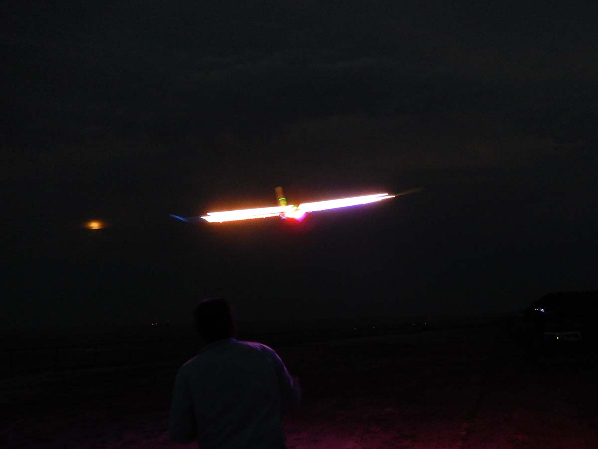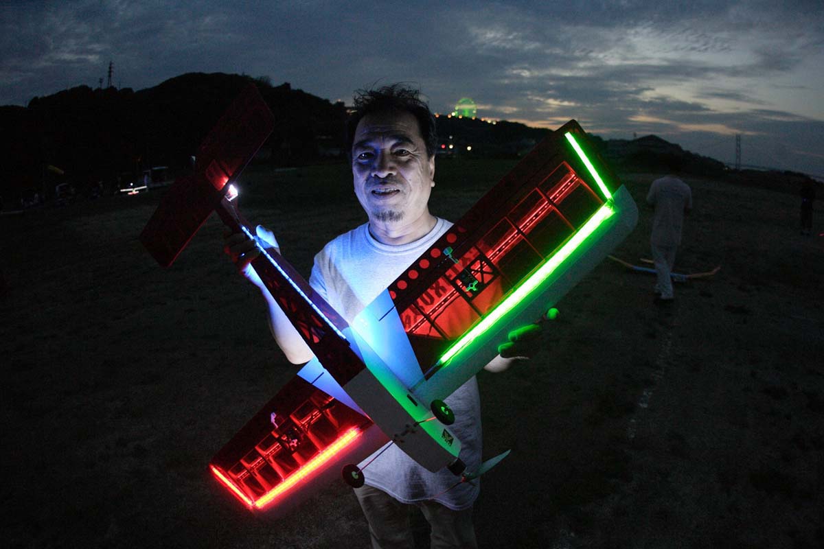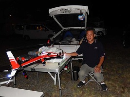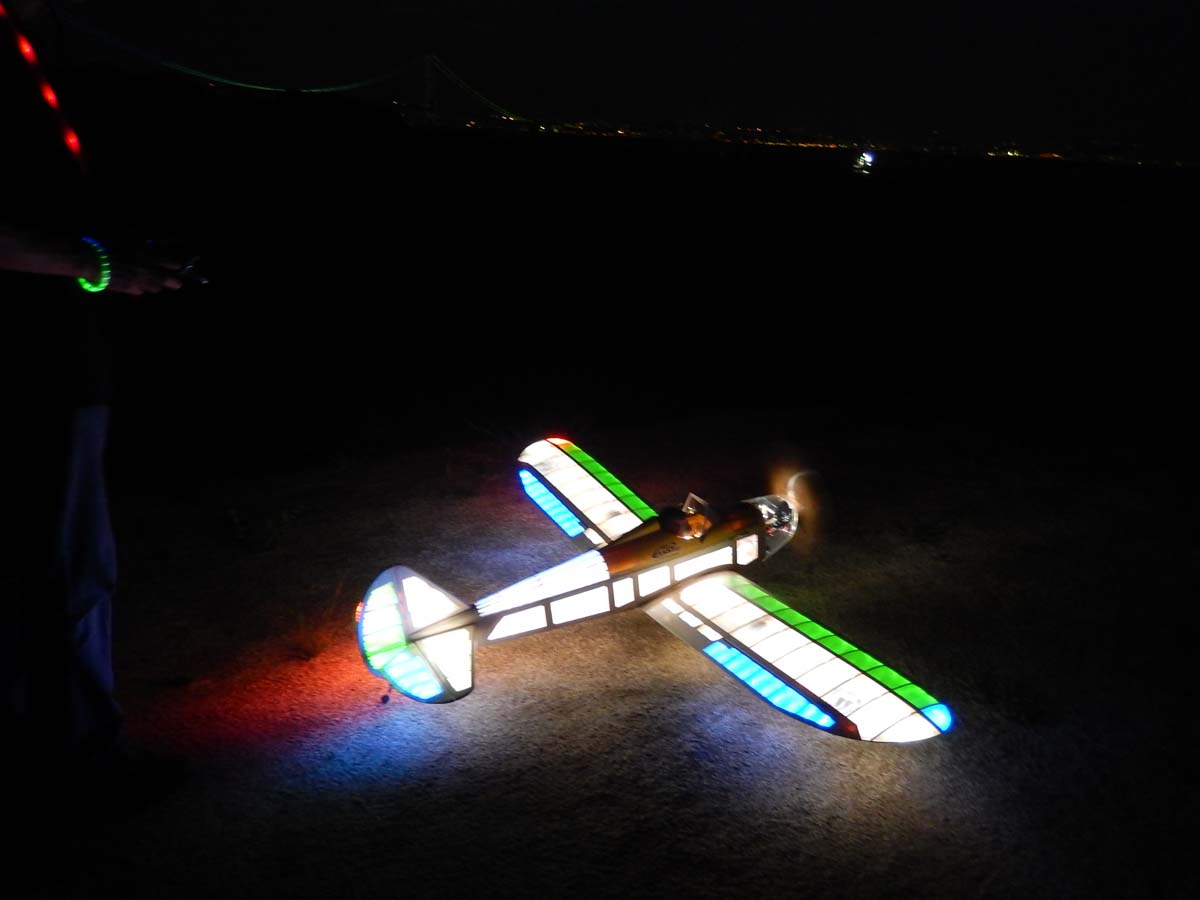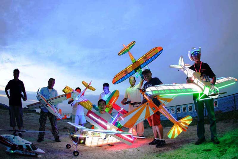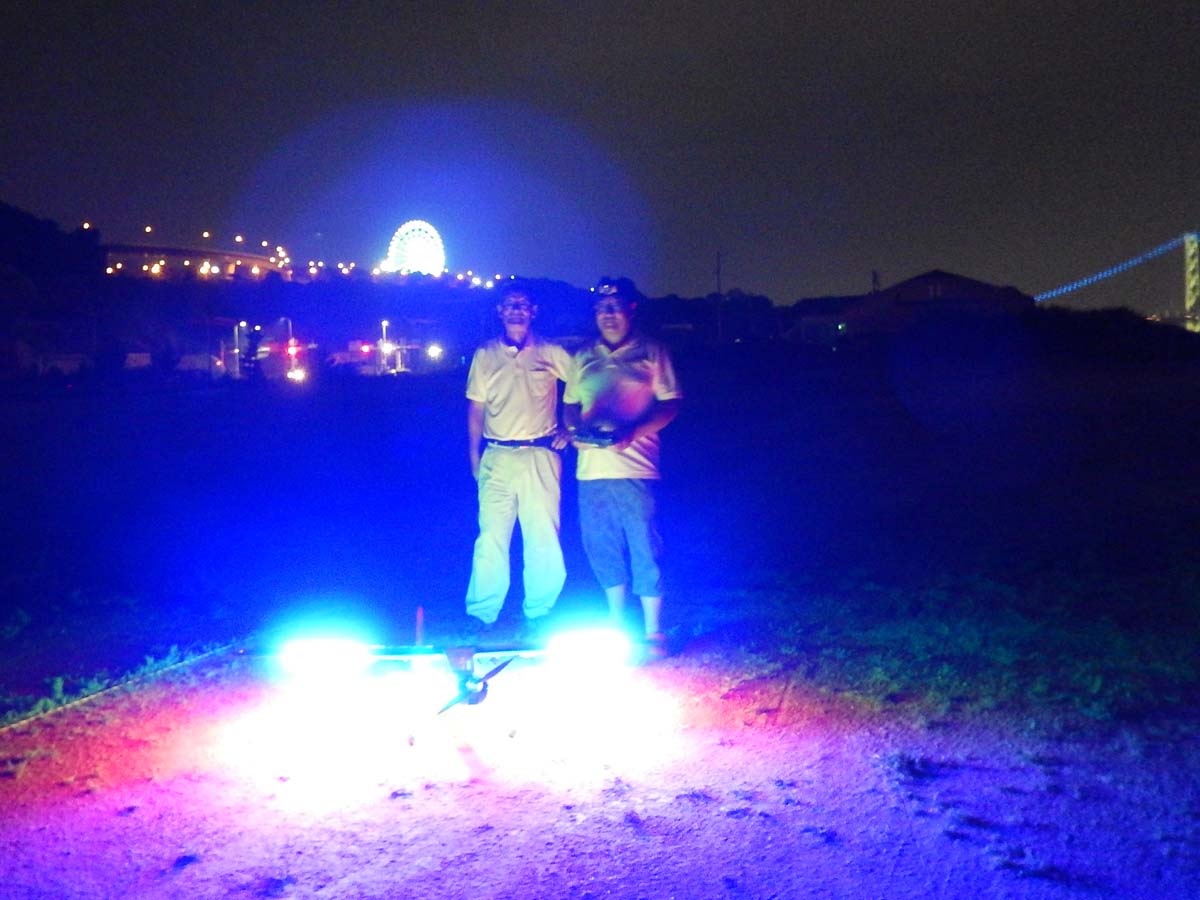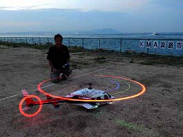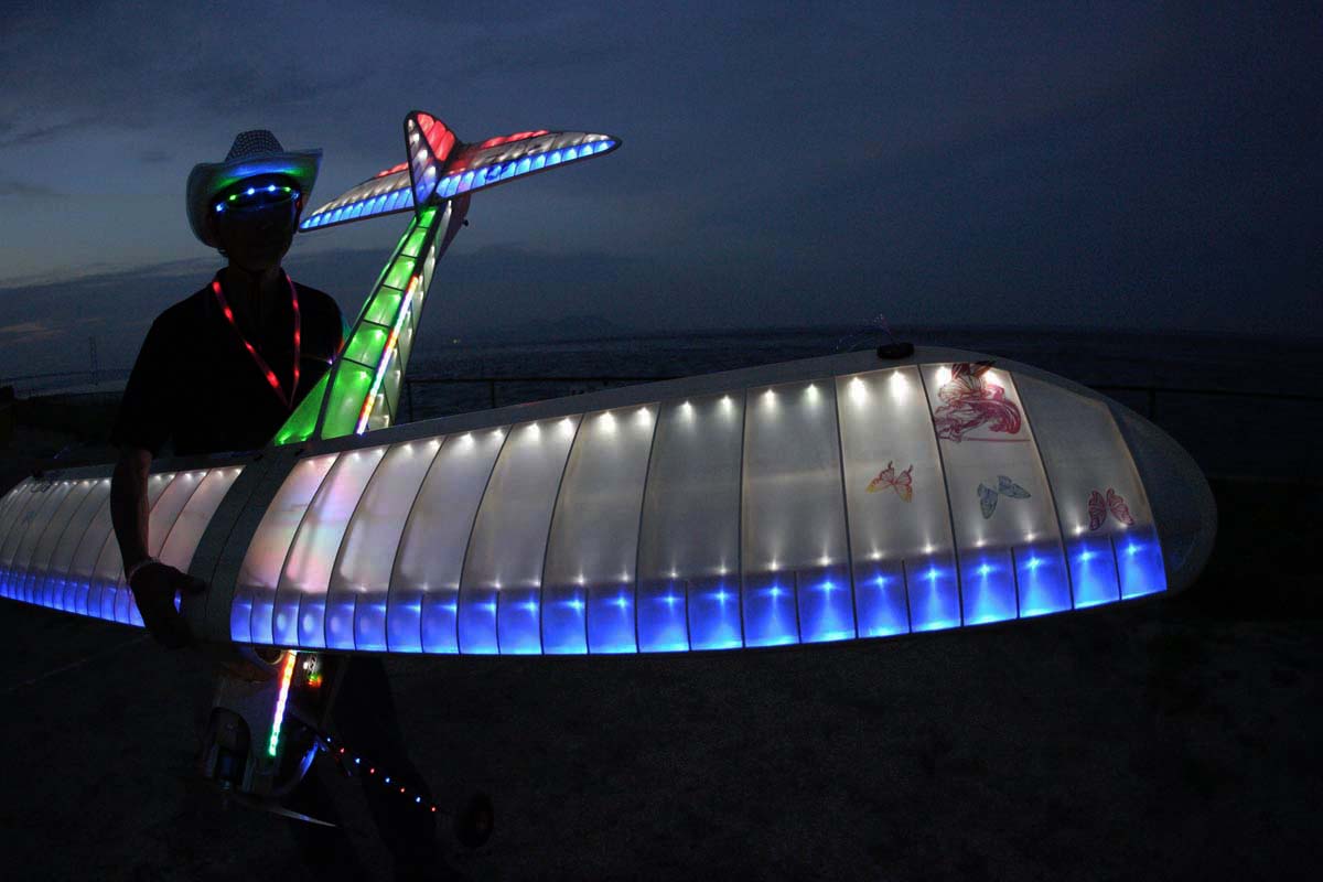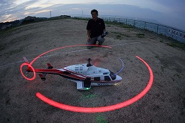 | 「やはり夏の夜はこれに限りますなー」と2014年7月12日 兵庫県淡路市のKMA淡路市・岩屋模型飛行場で、KMAニューカテゴリー研究会が主宰する上記催しが開催されました。 迎えて4回目となるこのイベント、直前に台風が来るとの事でやきもきさせられましたが予想外に早く通り過ぎ、当日は朝から真夏の日差しが照りつける好天となりました。 いつも通り、皆さん趣向を凝らした愛機を持って、早い人は朝のうちから三々五々飛行場に集まり、日の高いうちにテスト飛行やLEDライトの準備に余念がありませんでした。 また会場のあちこちでは情報交換などに輪が出来、それぞれの機体のウンチクを聞くなど、この大会ならではの風景も見られました。 この時期、日没は7時過ぎですが本当に暗くなるのはまだまだ先です。 それでも待ちかねたメンバーが次々とライトを点灯してナイトフライトを始めました。最近のLEDは高輝度タイプが多く、少々周りが明るくても機体は明るく光り輝き本番の美しさを期待させます。。 日没とともに飛行場から見える明石海峡大橋と淡路SAの観覧車もライトアップを開始、周囲もどんどん暗くなってきた午後8時頃、ナイトフライトの雰囲気も盛り上がって来たところで皆さん続々と本番?のデモンストレーションを開始しました。 機体は電動飛行機、エンジン機、モーターグライダー、ヘリとt多種多彩で、それぞれ個性的な光の帯を夜空に描きます。 幸か不幸か上空は雲が多く、月の光も遮られて機体のイルミネーションが描く光の帯が鮮やかに浮かび上がり、フライヤーもギャラリーも真夏の夜のフライトに酔いしれていました。 また、遠景に浮かび上がる明石海峡大橋のライトアップとのコラボも楽しく、過去に貴船飛行場で行った真の闇の中とは雰囲気の異なる、華麗な舞台での飛行となりました。 皆さん、あまりの美しさ、楽しさに時間のたつのを忘れてフライトは続き、結局予定の9時を30分オーバーするまで飛ばし続けました。 心配された事故もなく、全機無事に夜の飛行場からの離発着をこなし、またぜひ次回もこの地で開催をということでお開きとしました。 ・参加者と機体の照明データなどはこちらからご覧ください。なお、データは申込時点のものです。 (お断り) このイベントは 誰でも、何処ででもラジコン模型による夜間飛行をすることを勧めるものではありません。 (社)関西模型クラブ連合会が専用飛行場で、参加者がラジコン保険等に加入していること、無線機は日本ラジコン電波安全協会で認証を受けた製品に限ること、当日参加者の機材、操縦技術等を事前に審査するなど、万全の安全性確保の施策を行ったうえで夜間飛行を実施したものです。 (写真:駒宮康隆、山本修造 文:山本修造) |