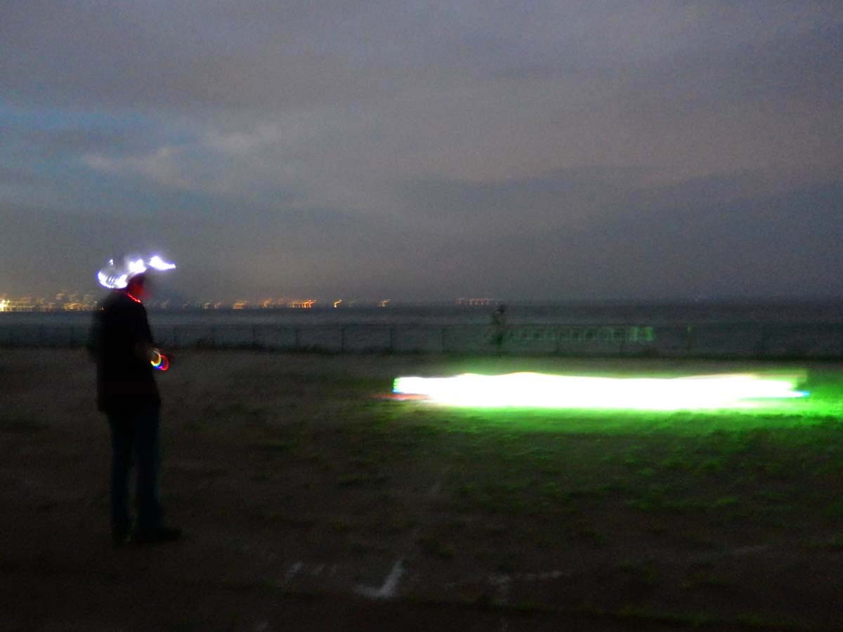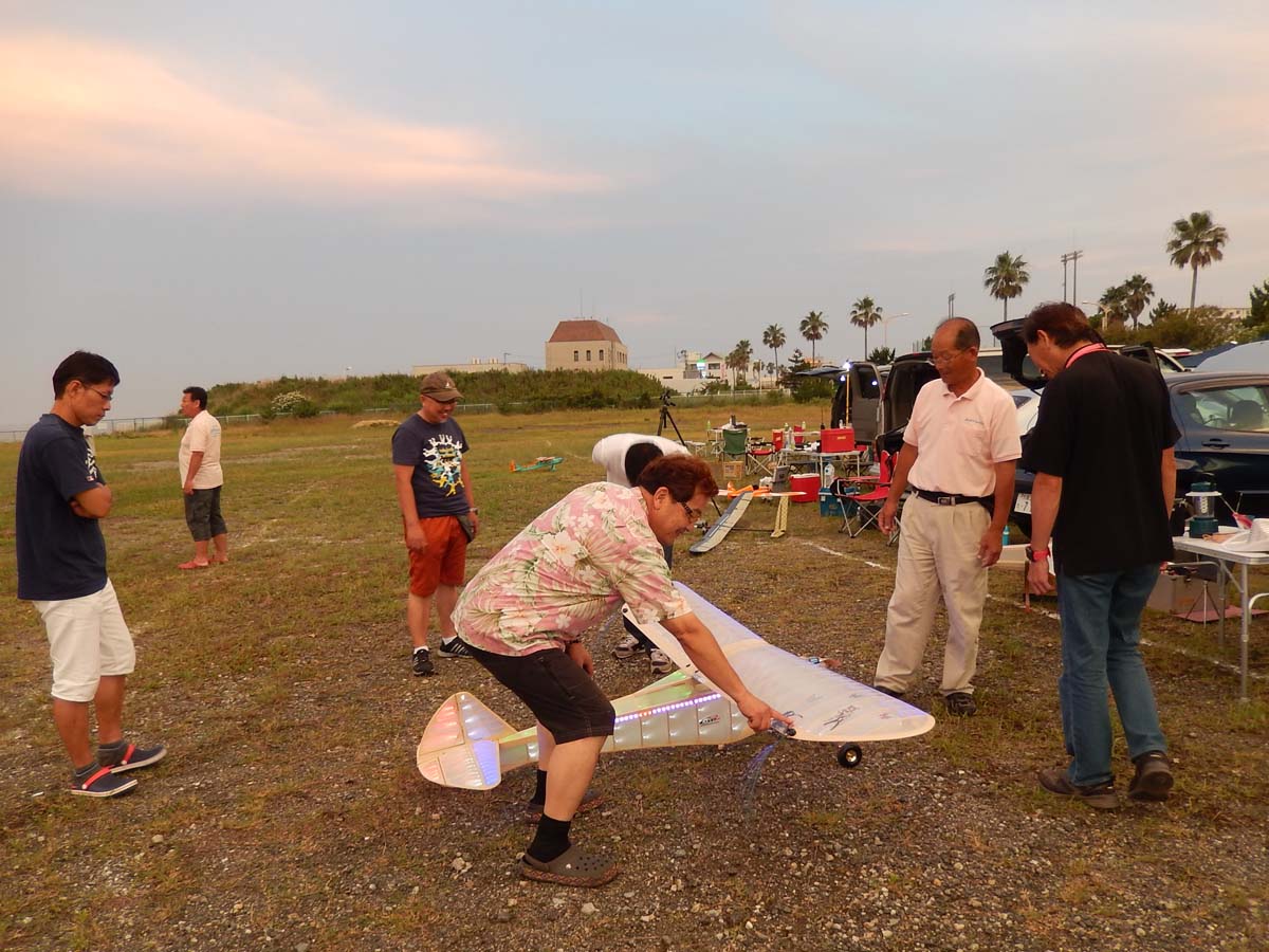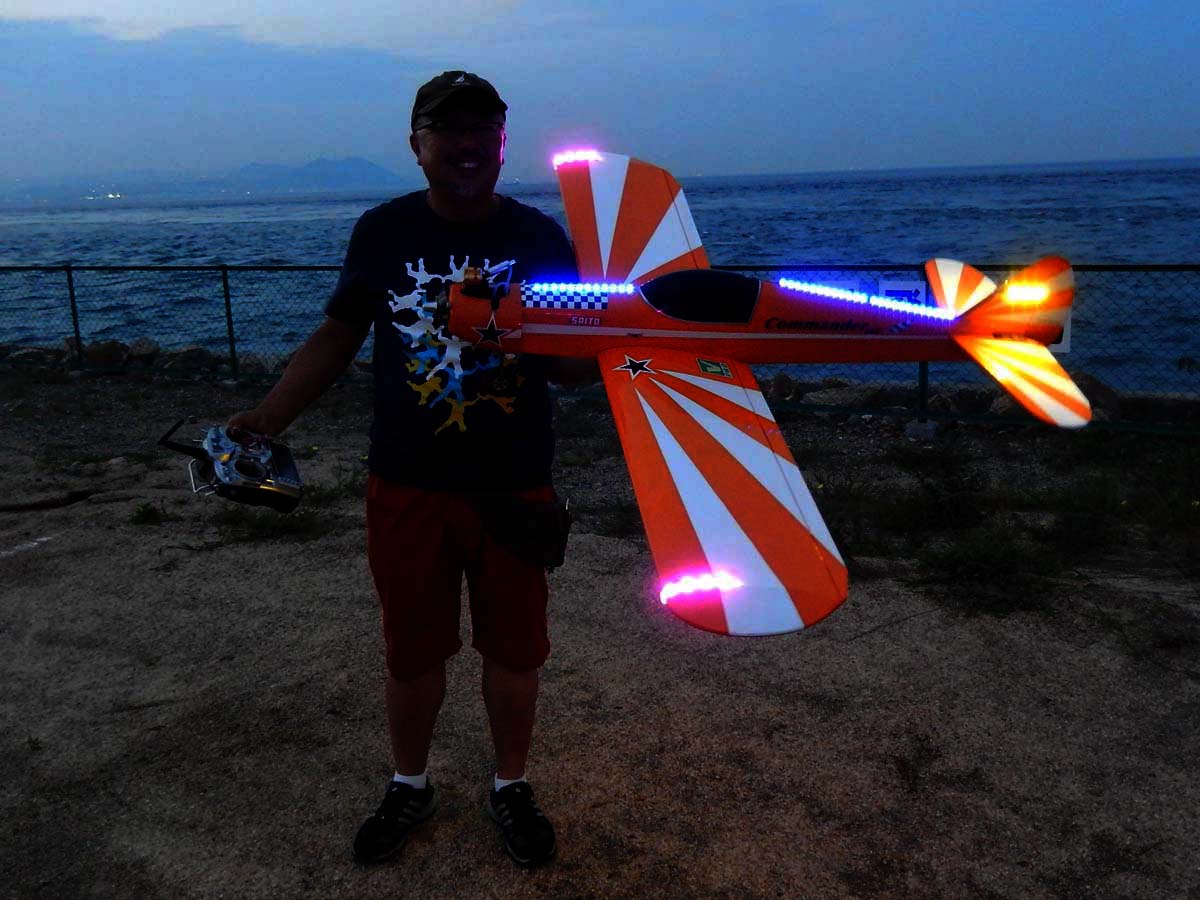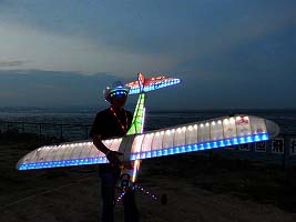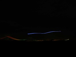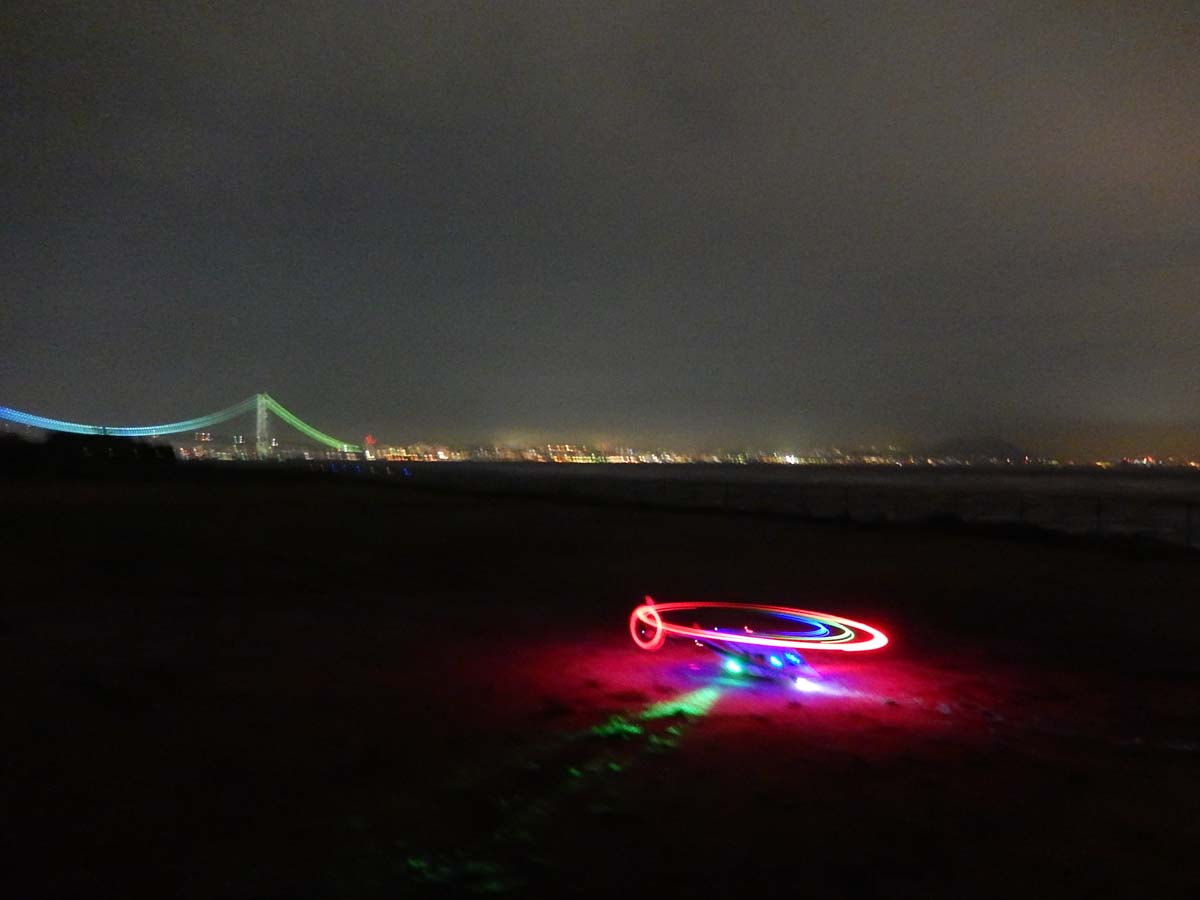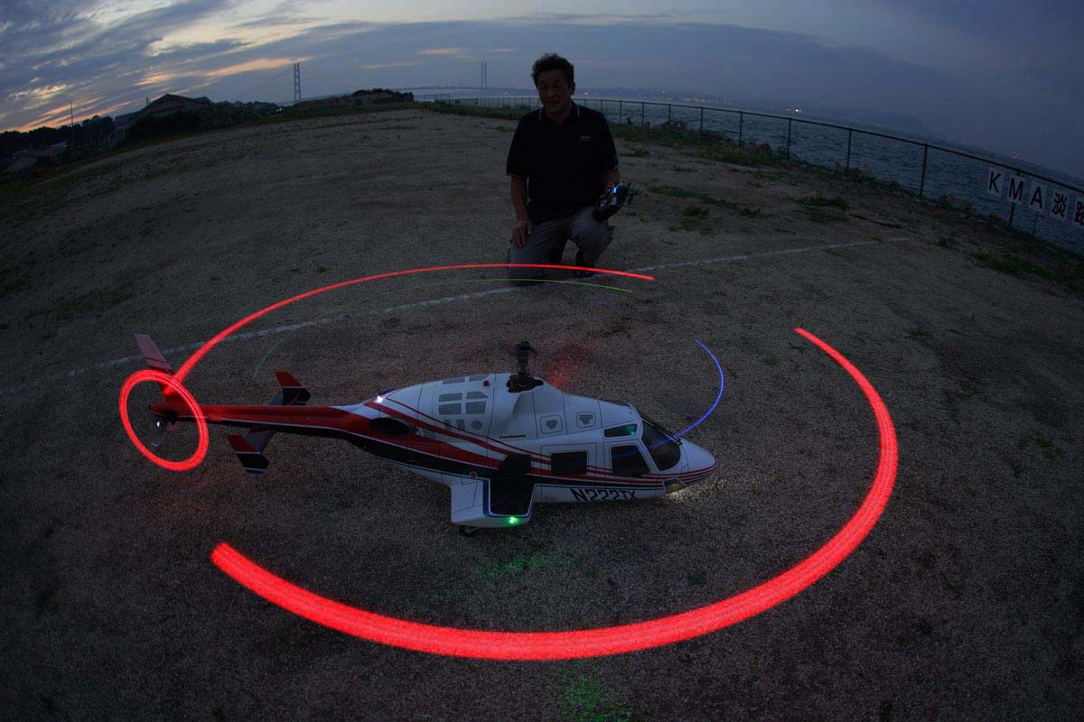 | 「やはり夏の夜はこれに限りますなー」と2014年7月12日 兵庫県淡路市のKMA淡路市・岩屋模型飛行場で、KMAニューカテゴリー研究会が主宰する上記催しが開催されました。 迎えて4回目となるこのイベント、直前に台風が来るとの事でやきもきさせられましたが予想外に早く通り過ぎ、当日は朝から真夏の日差しが照りつける好天となりました。 いつも通り、皆さん趣向を凝らした愛機を持って、早い人は朝のうちから三々五々飛行場に集まり、日の高いうちにテスト飛行やLEDライトの準備に余念がありませんでした。 また会場のあちこちでは情報交換などに輪が出来、それぞれの機体のウンチクを聞くなど、この大会ならではの風景も見られました。 この時期、日没は7時過ぎですが本当に暗くなるのはまだまだ先です。 それでも待ちかねたメンバーが次々とライトを点灯してナイトフライトを始めました。最近のLEDは高輝度タイプが多く、少々周りが明るくても機体は明るく光り輝き本番の美しさを期待させます。。 日没とともに飛行場から見える明石海峡大橋と淡路SAの観覧車もライトアップを開始、周囲もどんどん暗くなってきた午後8時頃、ナイトフライトの雰囲気も盛り上がって来たところで皆さん続々と本番?のデモンストレーションを開始しました。 機体は電動飛行機、エンジン機、モーターグライダー、ヘリとt多種多彩で、それぞれ個性的な光の帯を夜空に描きます。 幸か不幸か上空は雲が多く、月の光も遮られて機体のイルミネーションが描く光の帯が鮮やかに浮かび上がり、フライヤーもギャラリーも真夏の夜のフライトに酔いしれていました。 また、遠景に浮かび上がる明石海峡大橋のライトアップとのコラボも楽しく、過去に貴船飛行場で行った真の闇の中とは雰囲気の異なる、華麗な舞台での飛行となりました。 皆さん、あまりの美しさ、楽しさに時間のたつのを忘れてフライトは続き、結局予定の9時を30分オーバーするまで飛ばし続けました。 心配された事故もなく、全機無事に夜の飛行場からの離発着をこなし、またぜひ次回もこの地で開催をということでお開きとしました。 ・参加者と機体の照明データなどはこちらからご覧ください。なお、データは申込時点のものです。 (お断り) このイベントは 誰でも、何処ででもラジコン模型による夜間飛行をすることを勧めるものではありません。 (社)関西模型クラブ連合会が専用飛行場で、参加者がラジコン保険等に加入していること、無線機は日本ラジコン電波安全協会で認証を受けた製品に限ること、当日参加者の機材、操縦技術等を事前に審査するなど、万全の安全性確保の施策を行ったうえで夜間飛行を実施したものです。 (写真:駒宮康隆、山本修造 文:山本修造) |