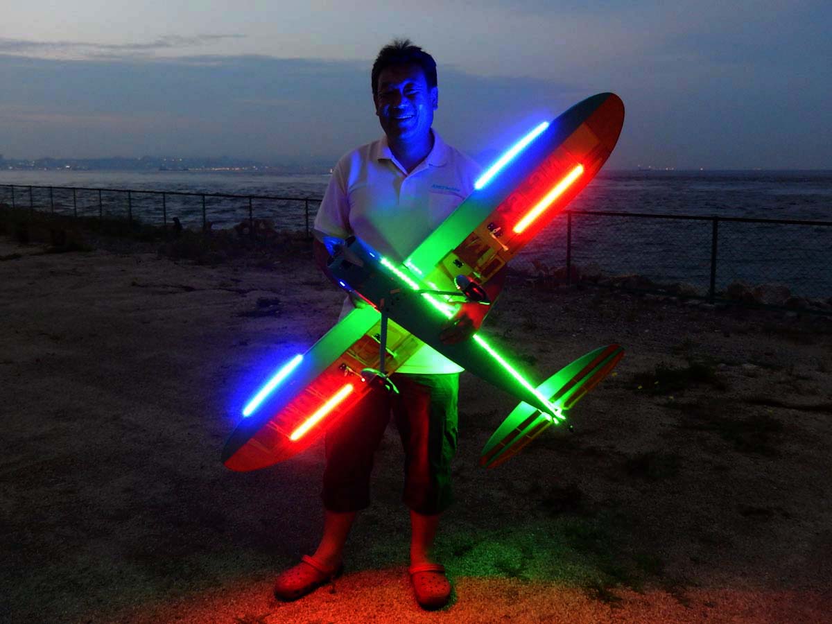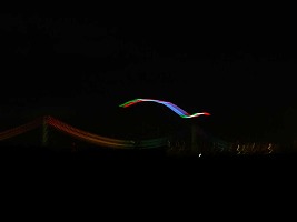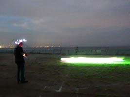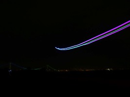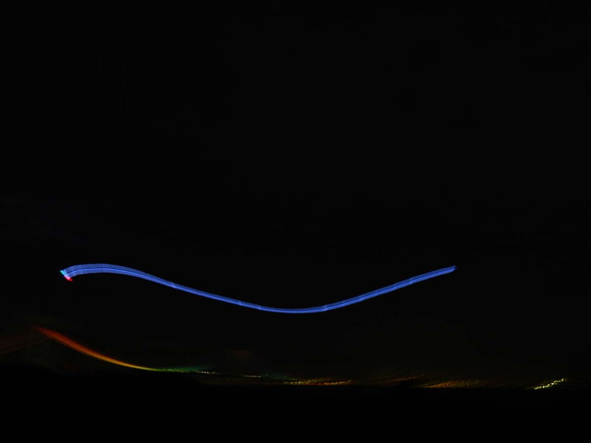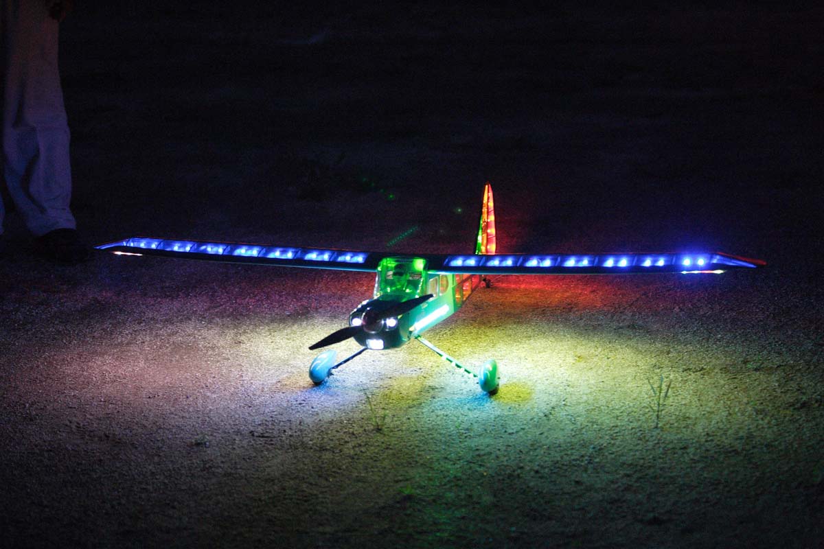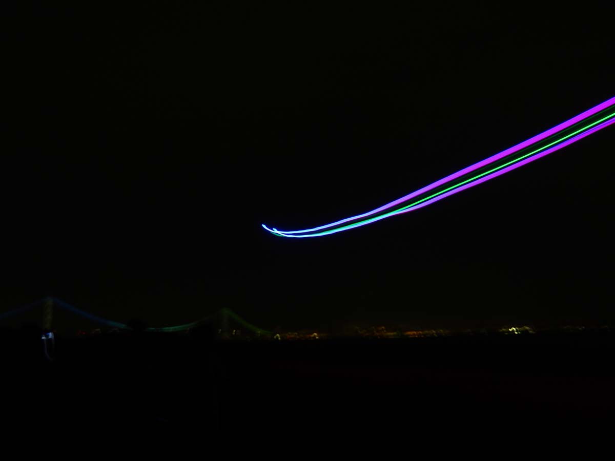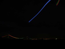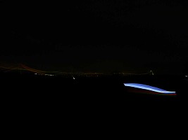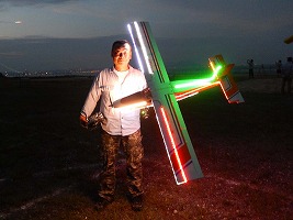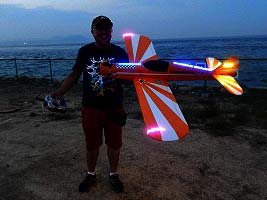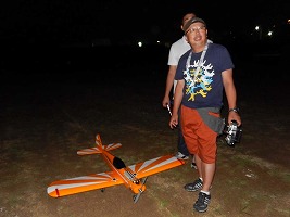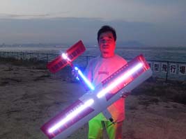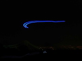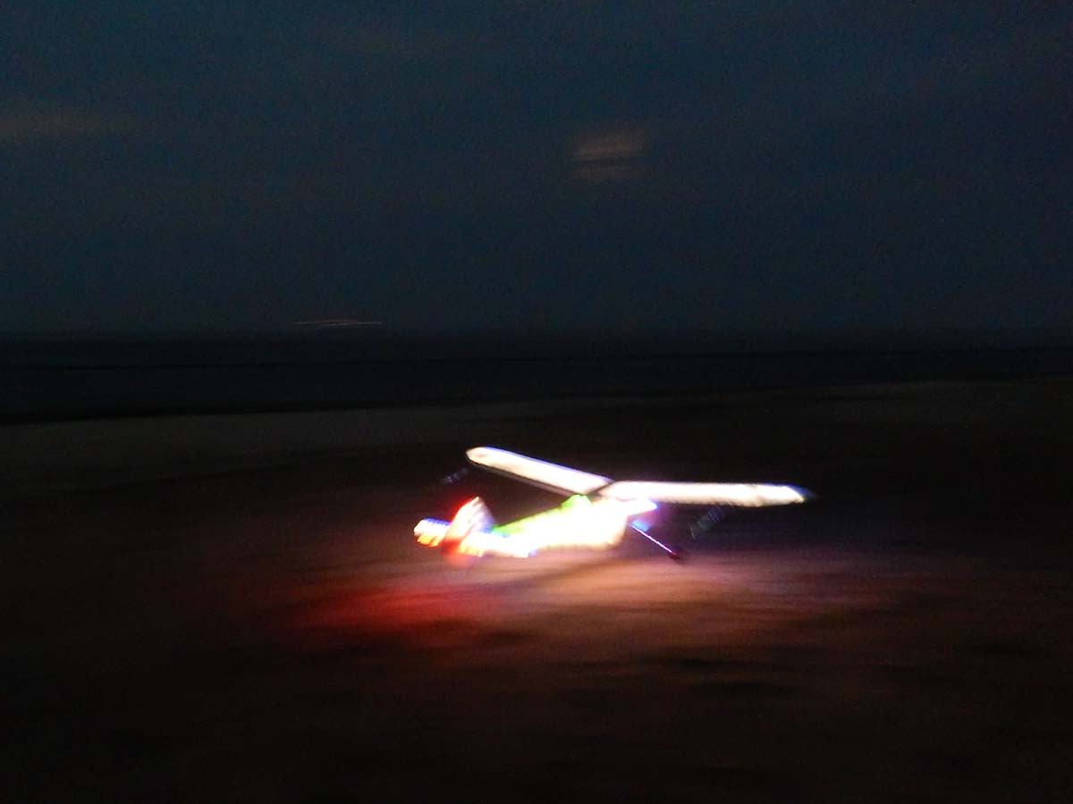 | 「やはり夏の夜はこれに限りますなー」と2014年7月12日 兵庫県淡路市のKMA淡路市・岩屋模型飛行場で、KMAニューカテゴリー研究会が主宰する上記催しが開催されました。 迎えて4回目となるこのイベント、直前に台風が来るとの事でやきもきさせられましたが予想外に早く通り過ぎ、当日は朝から真夏の日差しが照りつける好天となりました。 いつも通り、皆さん趣向を凝らした愛機を持って、早い人は朝のうちから三々五々飛行場に集まり、日の高いうちにテスト飛行やLEDライトの準備に余念がありませんでした。 また会場のあちこちでは情報交換などに輪が出来、それぞれの機体のウンチクを聞くなど、この大会ならではの風景も見られました。 この時期、日没は7時過ぎですが本当に暗くなるのはまだまだ先です。 それでも待ちかねたメンバーが次々とライトを点灯してナイトフライトを始めました。最近のLEDは高輝度タイプが多く、少々周りが明るくても機体は明るく光り輝き本番の美しさを期待させます。。 日没とともに飛行場から見える明石海峡大橋と淡路SAの観覧車もライトアップを開始、周囲もどんどん暗くなってきた午後8時頃、ナイトフライトの雰囲気も盛り上がって来たところで皆さん続々と本番?のデモンストレーションを開始しました。 機体は電動飛行機、エンジン機、モーターグライダー、ヘリとt多種多彩で、それぞれ個性的な光の帯を夜空に描きます。 幸か不幸か上空は雲が多く、月の光も遮られて機体のイルミネーションが描く光の帯が鮮やかに浮かび上がり、フライヤーもギャラリーも真夏の夜のフライトに酔いしれていました。 また、遠景に浮かび上がる明石海峡大橋のライトアップとのコラボも楽しく、過去に貴船飛行場で行った真の闇の中とは雰囲気の異なる、華麗な舞台での飛行となりました。 皆さん、あまりの美しさ、楽しさに時間のたつのを忘れてフライトは続き、結局予定の9時を30分オーバーするまで飛ばし続けました。 心配された事故もなく、全機無事に夜の飛行場からの離発着をこなし、またぜひ次回もこの地で開催をということでお開きとしました。 ・参加者と機体の照明データなどはこちらからご覧ください。なお、データは申込時点のものです。 (お断り) このイベントは 誰でも、何処ででもラジコン模型による夜間飛行をすることを勧めるものではありません。 (社)関西模型クラブ連合会が専用飛行場で、参加者がラジコン保険等に加入していること、無線機は日本ラジコン電波安全協会で認証を受けた製品に限ること、当日参加者の機材、操縦技術等を事前に審査するなど、万全の安全性確保の施策を行ったうえで夜間飛行を実施したものです。 (写真:駒宮康隆、山本修造 文:山本修造) |