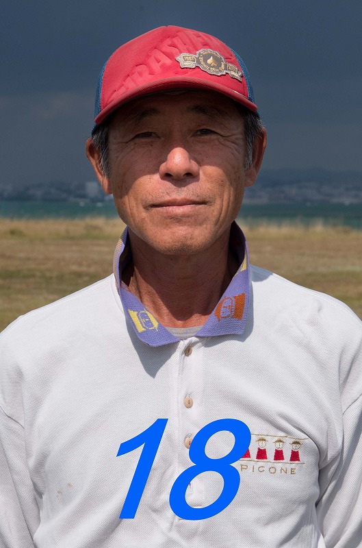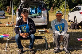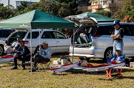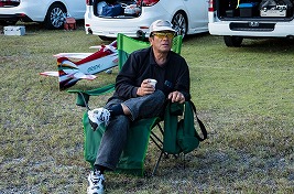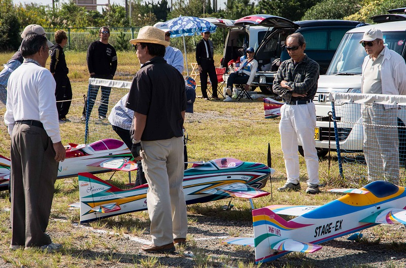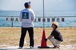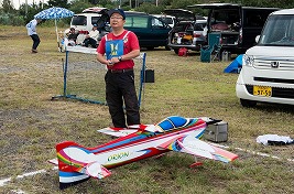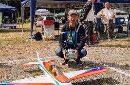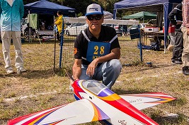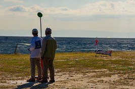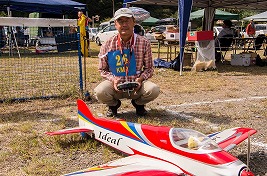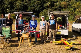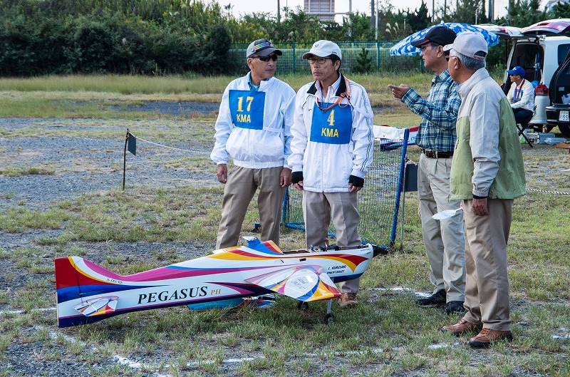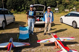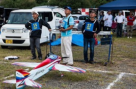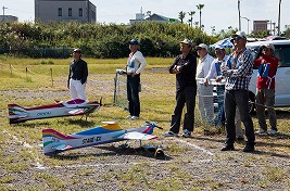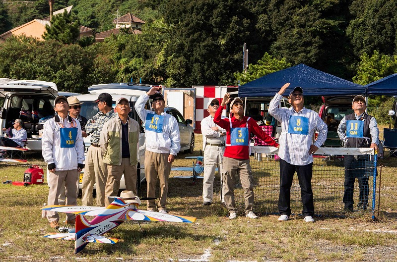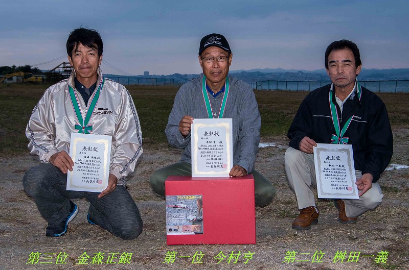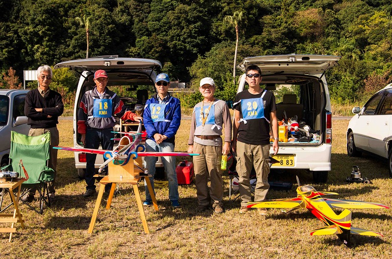 30分の昼休憩をはさみ、かなり風が強くなってきた13時30分からKMA F3A-70曲技大会の開始です。フライト順はくじ引きで、ジャッジは4名にて演技ごとの上下カット、1点刻みの採点です。選手権予選と同じで、かなりきびしい減点がなされているようでした。後からの強い風と乱流に翻弄され、苦心されていました。優勝候補の中四国の70神様といわれる八塚さんが演技を間違えるというハプニングもあり、誰が優勝するのか、レベルはかなりアップしており、混戦模様でした。優勝は演技に切れが戻って調子が良い今村さん、続いて桝田さん、三位に金森さんという結果になりました。終了は16時30分過ぎで、表彰式、閉会式のあと入賞者の写真を撮るころには、うす暗くなってきていました。今回の人数が限界です。朝の検定から曲技大会までジャッジを勤めて頂きました上田さん、松田さん、中田さん、坂本さん、また運営をいただいた山原さん、藤本さん、岡田さんには御礼申し上げます。