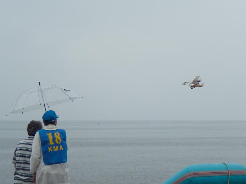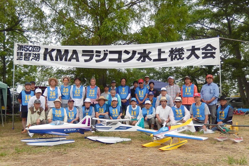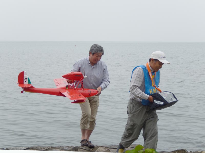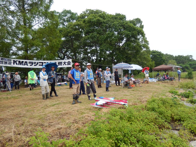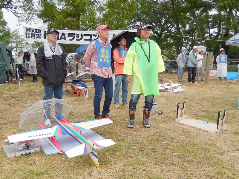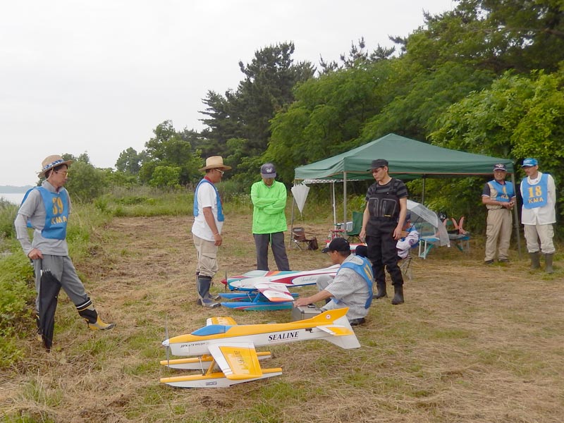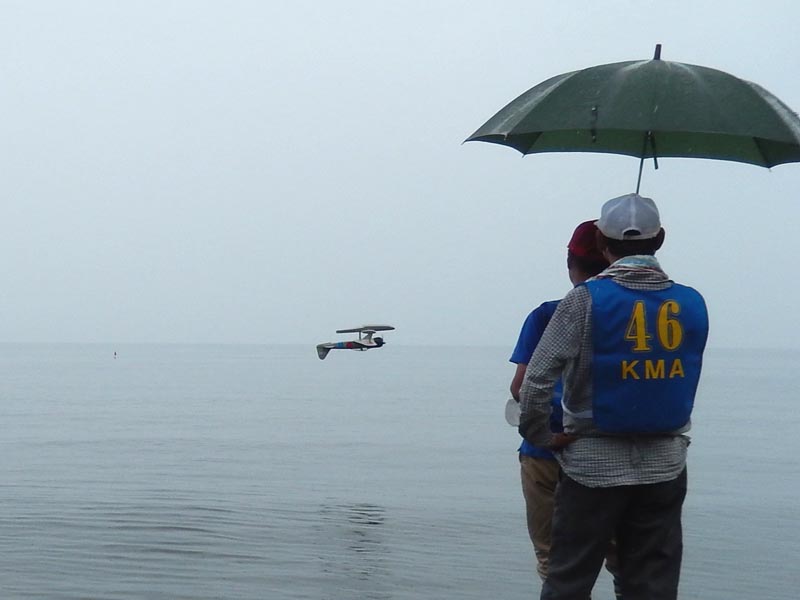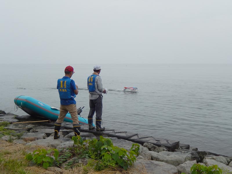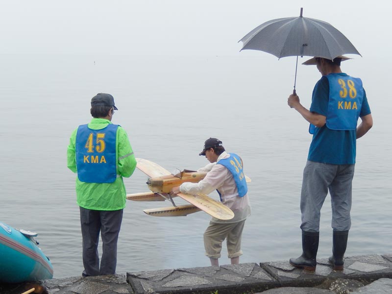 | 6月19日、恒例のKMA水上機大会が滋賀県琵琶湖西岸で開催されました。今回が第50回という節目を迎えたこの大会、参加申し込みが38名と過去最多となりました。 これまで途切れることなく開催できましたのも参加頂いた皆さん、KMA役員、そして支援頂きました会社様のお陰と深く感謝致します。 さて、いつも通り前日から会場に乗り込んだ有志の皆さんの手できれいに草刈りがされた会場には、雨天の予報にもかかわらず、朝早くから続々と選手の皆さんが集まりました。 刻々と雨雲が近づく気配の中、予定を早めて8時から開会式、続いてカシオペア加藤氏による曲技の目慣らし飛行、高度150mのデモ飛行を行ったあと、初級スタントの部から競技を開始しました。 競技開始後間もなくパラパラと小雨が降り出しましたが大した事は無く、湖面は波もなく穏やかで、皆さん次々と離水、タッチアンドゴーなど、湖面に鮮やかな波の軌跡を描いて飛行を堪能されていました。 初級の終了後、小川精機羽根田氏、OK模型高松氏によるデモフライトを実施、その後中級の競技に移りました。エントリーリストをご覧になればおわかりになるとおり、今回は参加人数も多く、ハイレベルな戦いになりました。 中級終了後は自由飛行を楽しむオープンクラスに移りました。しかしこの頃になると雨脚も少し強くなり、傘を差し掛けたり送信機にレインカバーを掛けたりと、選手の皆さんは防水対策に気を遣っておられました。 このような空模様のため、残念ながら今回は1ラウンドのみで競技終了ということとし、雨脚がやや強まる中、午後1時過ぎより閉会式、表彰式、そして協賛各社様からの景品の抽選会を行い、お開きとさせて頂きました。 最後になりましたが、ご協力頂きましたKMA委員並びに有志の皆さんがた、そして協賛頂きましたメーカー各社様に厚くお礼を申し上げます。 (文と写真:KMA 山本修造) |
