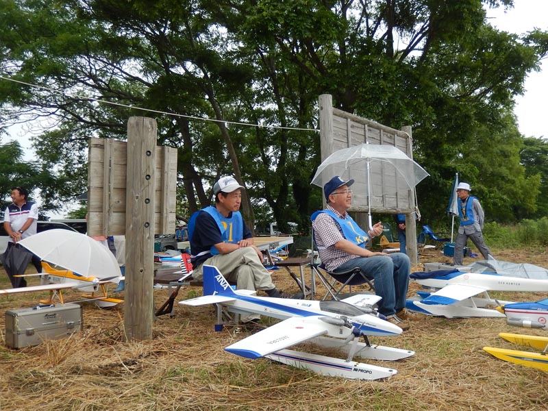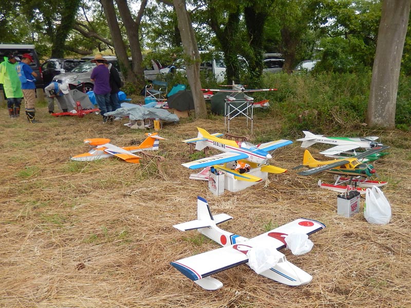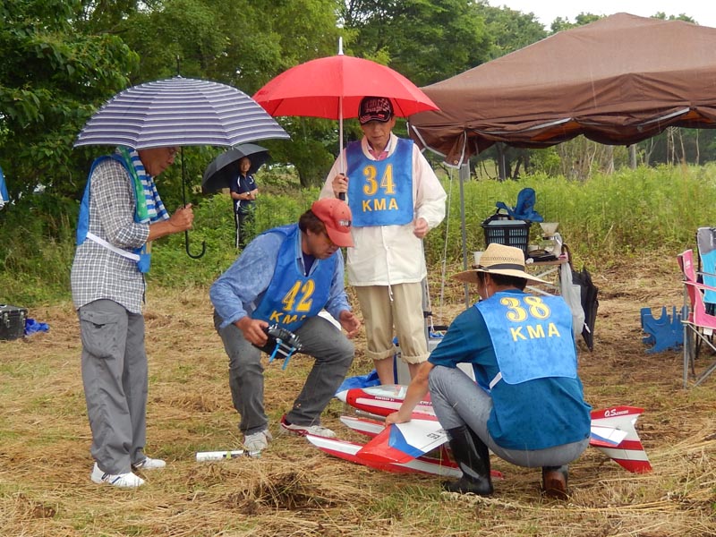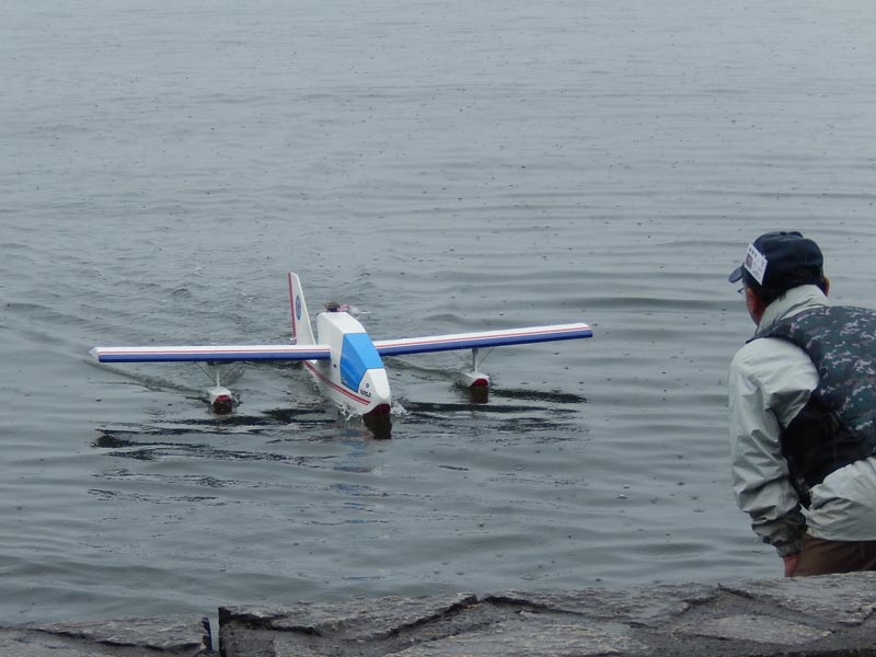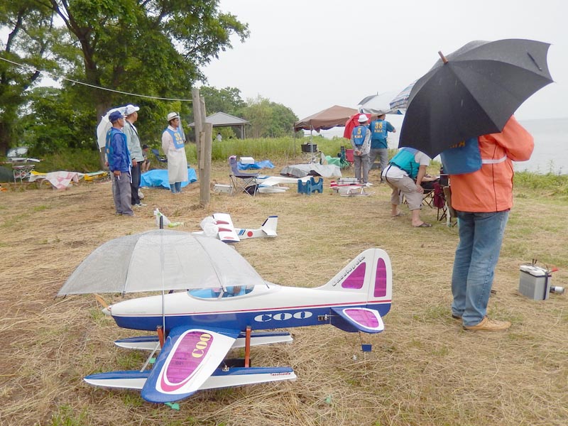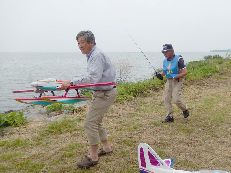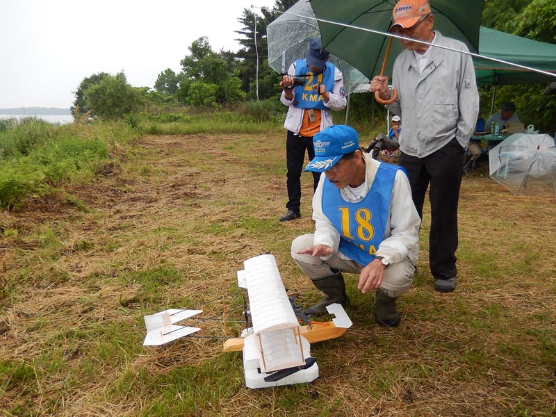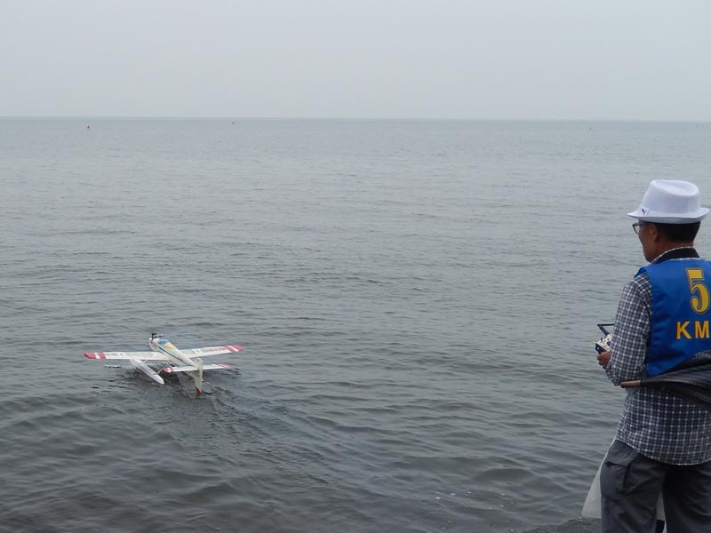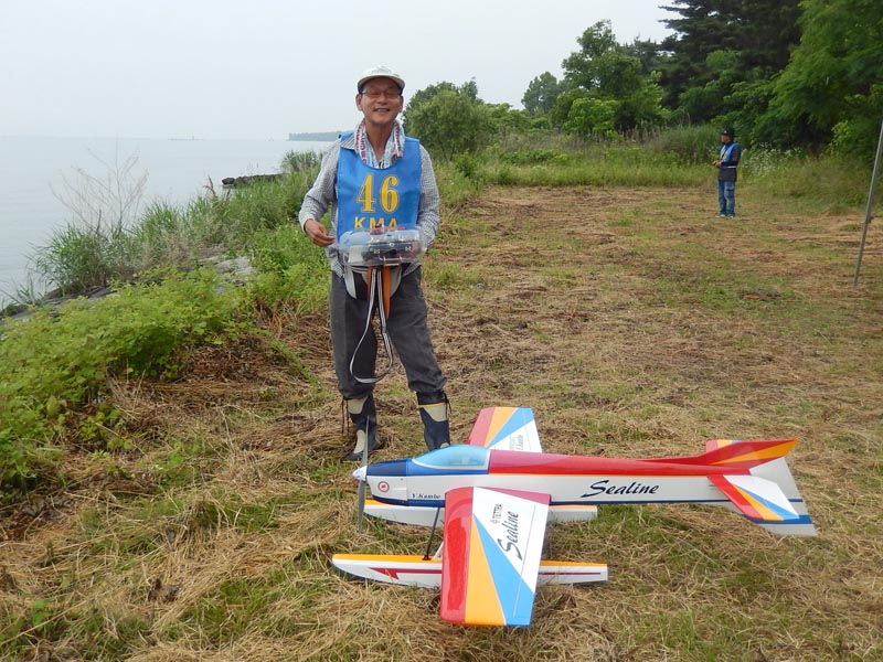 | 6月19日、恒例のKMA水上機大会が滋賀県琵琶湖西岸で開催されました。今回が第50回という節目を迎えたこの大会、参加申し込みが38名と過去最多となりました。 これまで途切れることなく開催できましたのも参加頂いた皆さん、KMA役員、そして支援頂きました会社様のお陰と深く感謝致します。 さて、いつも通り前日から会場に乗り込んだ有志の皆さんの手できれいに草刈りがされた会場には、雨天の予報にもかかわらず、朝早くから続々と選手の皆さんが集まりました。 刻々と雨雲が近づく気配の中、予定を早めて8時から開会式、続いてカシオペア加藤氏による曲技の目慣らし飛行、高度150mのデモ飛行を行ったあと、初級スタントの部から競技を開始しました。 競技開始後間もなくパラパラと小雨が降り出しましたが大した事は無く、湖面は波もなく穏やかで、皆さん次々と離水、タッチアンドゴーなど、湖面に鮮やかな波の軌跡を描いて飛行を堪能されていました。 初級の終了後、小川精機羽根田氏、OK模型高松氏によるデモフライトを実施、その後中級の競技に移りました。エントリーリストをご覧になればおわかりになるとおり、今回は参加人数も多く、ハイレベルな戦いになりました。 中級終了後は自由飛行を楽しむオープンクラスに移りました。しかしこの頃になると雨脚も少し強くなり、傘を差し掛けたり送信機にレインカバーを掛けたりと、選手の皆さんは防水対策に気を遣っておられました。 このような空模様のため、残念ながら今回は1ラウンドのみで競技終了ということとし、雨脚がやや強まる中、午後1時過ぎより閉会式、表彰式、そして協賛各社様からの景品の抽選会を行い、お開きとさせて頂きました。 最後になりましたが、ご協力頂きましたKMA委員並びに有志の皆さんがた、そして協賛頂きましたメーカー各社様に厚くお礼を申し上げます。 (文と写真:KMA 山本修造) |
