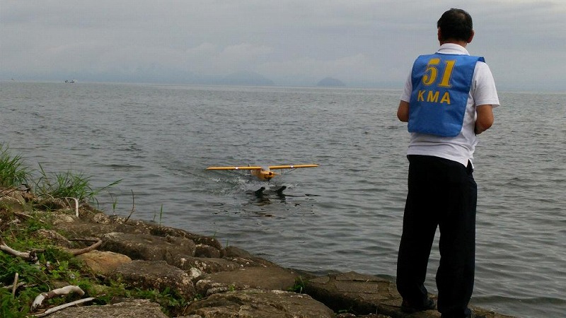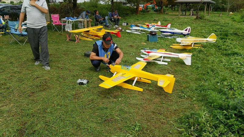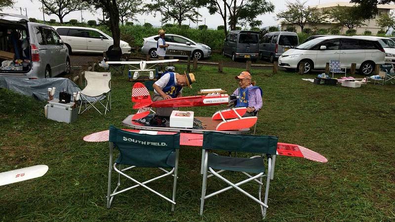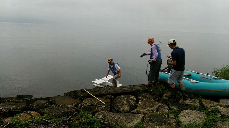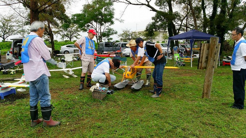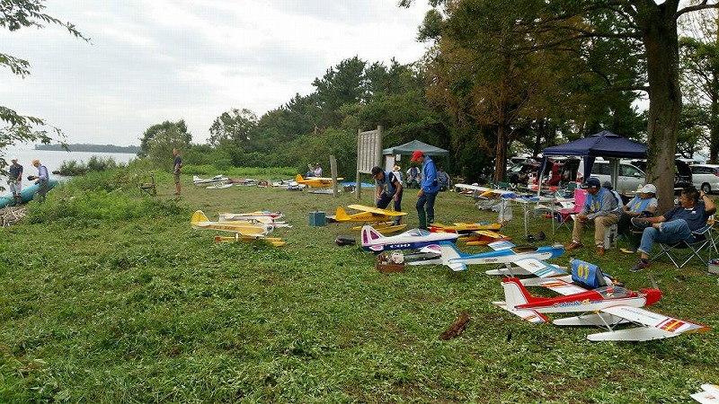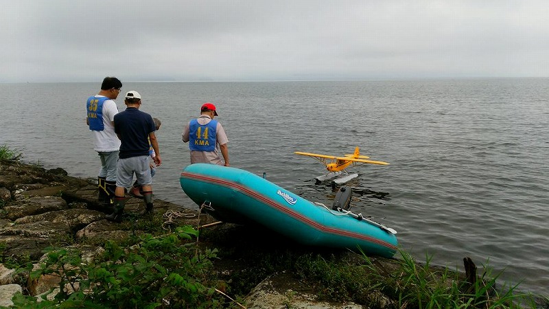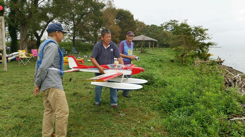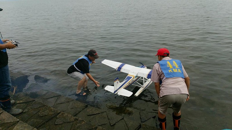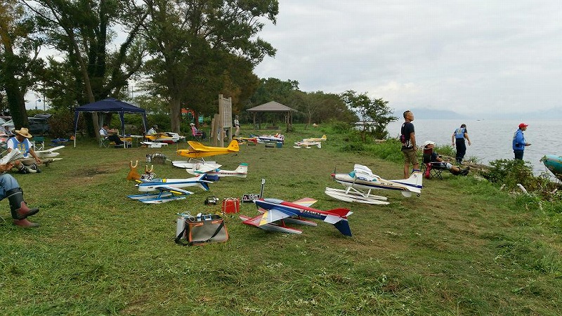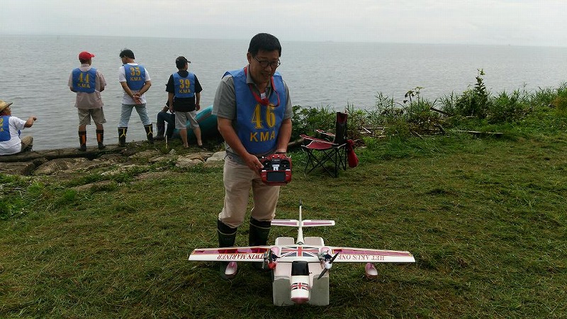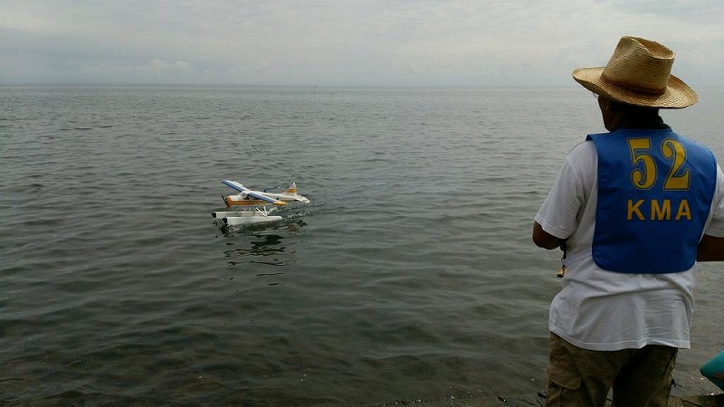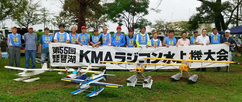 | 2018年秋の水上機大会が9月16日、恒例の滋賀県琵琶湖西岸で開催されました。 9月4日に近畿に上陸した台風の影響が、関空を始め、大阪市・西宮市など各地に大変な被害を、もたらしました。ここ琵琶湖の会場も大木が倒れる被害にあい、駐車場を塞いでしまいました。高島市にお願いしましたが、他にも多くの被害があり、手が回らないとのこと。そこで有志により大会前々日に、こまめに切断して駐車場の外に運び出し、何とか開催できました。 大会当日の9月16日は、秋雨前線の影響が心配されましたが、何とか曇り空で、空が鳴くのを堪えてくれてるようです。7時過ぎには参加者が集まり始めたため、例年より早く、7時半から受付を開始し、8時前には9割方エントリーを受付、開会式を行うことができました。 島田委員長の挨拶で大会がスタート、まず、記念撮影です、今回は25名もの参加があり、盛り上がった大会となりました。天気は曇りですが、湖面はなぎに近い状態で、離水、着水が存分に楽しめそうです。8時15分過ぎに、一番機が離水、綺麗な水しぶきを残して上昇していきました。上空は低い雲が垂れ込めており、機体は非常に見にくい状況です。フライヤーはあまり遠くに放さず、近場で旋回して自由に飛ばしています。 10時半ごろに一ラウンドが終了、5分ほどの休憩をはさんで、二ラウンド目がスタートしました。競技ではないので、各フライヤーは冗談を交えながら、本当に自由に飛行を楽しみました。雨の心配があるため、食事休憩を取らずに、そのまま二ラウンド目の飛行を続行、午後1時半ごろに二ラウンド目も終了しました。 ここから、大会役員のデータ整理と協賛品の振り分けのため、30分ほど、希望者の自由フライトとしました。この後、午後2時前に準備も終わり、協賛各社様からの景品の抽選会を行い、お開きとさせて頂きました。最後まで心配された雨も降らずに、湖面もほぼ穏やかで、楽しい大会で一日が終わることができました。 最後になりましたが、前々日の雨の中、駐車場に横たわる大木の処理と片付けを行って頂いた有志の方々、そして前日に草刈りをして頂いた有志の方々、さらに当日運営にご協力頂きましたKMA委員の皆様、雨天が予想されたにもかかわらずご参加頂いた選手の皆さん、そして協賛頂きましたメーカー各社様に厚くお礼を申し上げます。(注)倒木処理は高島市に連絡、了承のもとで行いました。 (文と写真:KMA 橋本 実) |