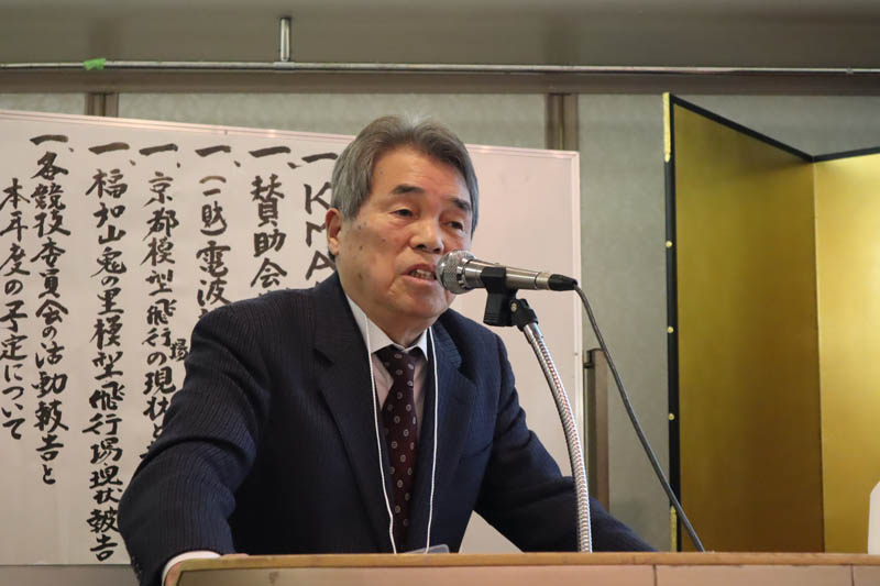 15時から開かれた事業説明会では、一般社団法人 関西模型クラブ連合会理事長 橋本善之の挨拶から始まり、賛助会を代表して株式会社テトラの山原利一氏の挨拶、一般財団法人 日本ラジコン電波安全協会の神林喜彦専務理事によるラジコン模型電波の安全運用に関する周知と現状報告、その後は各競技委員会・KMA賛助会員メーカー及び団体の代表者による昨年度のイベント報告や今年のスケジュール発表、KMA理事によるKMA飛行場の現状報告などが行われました。