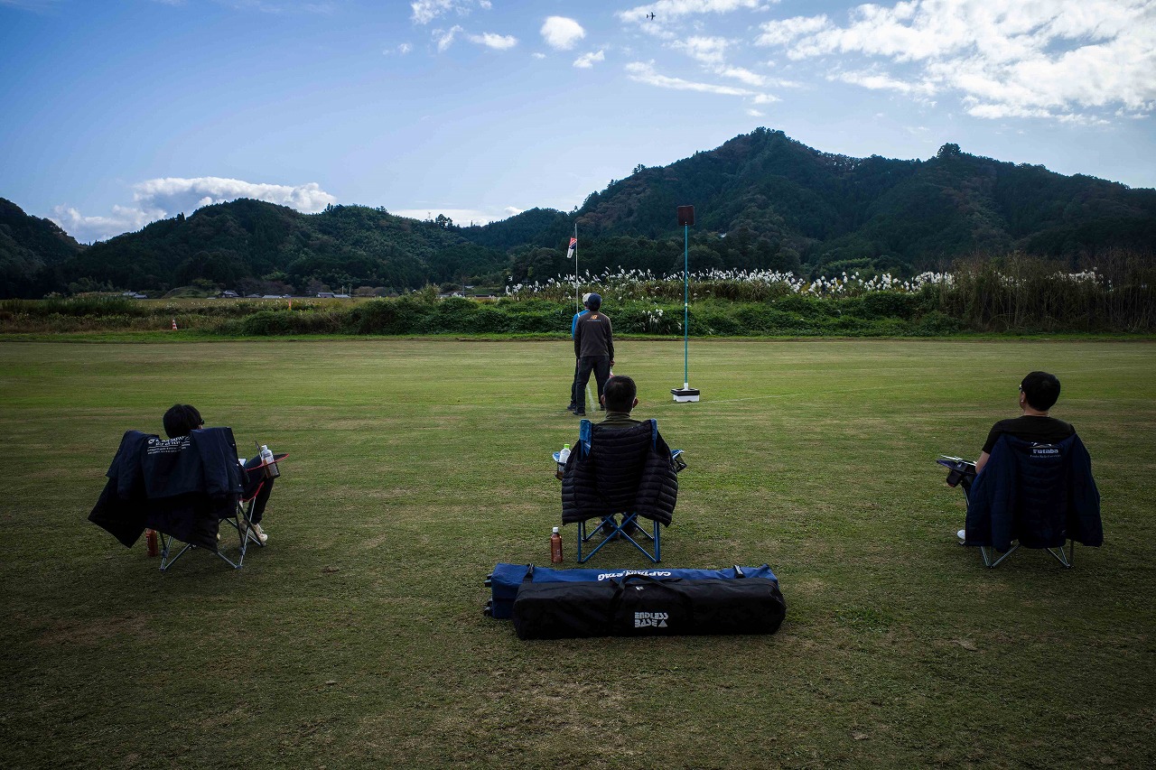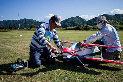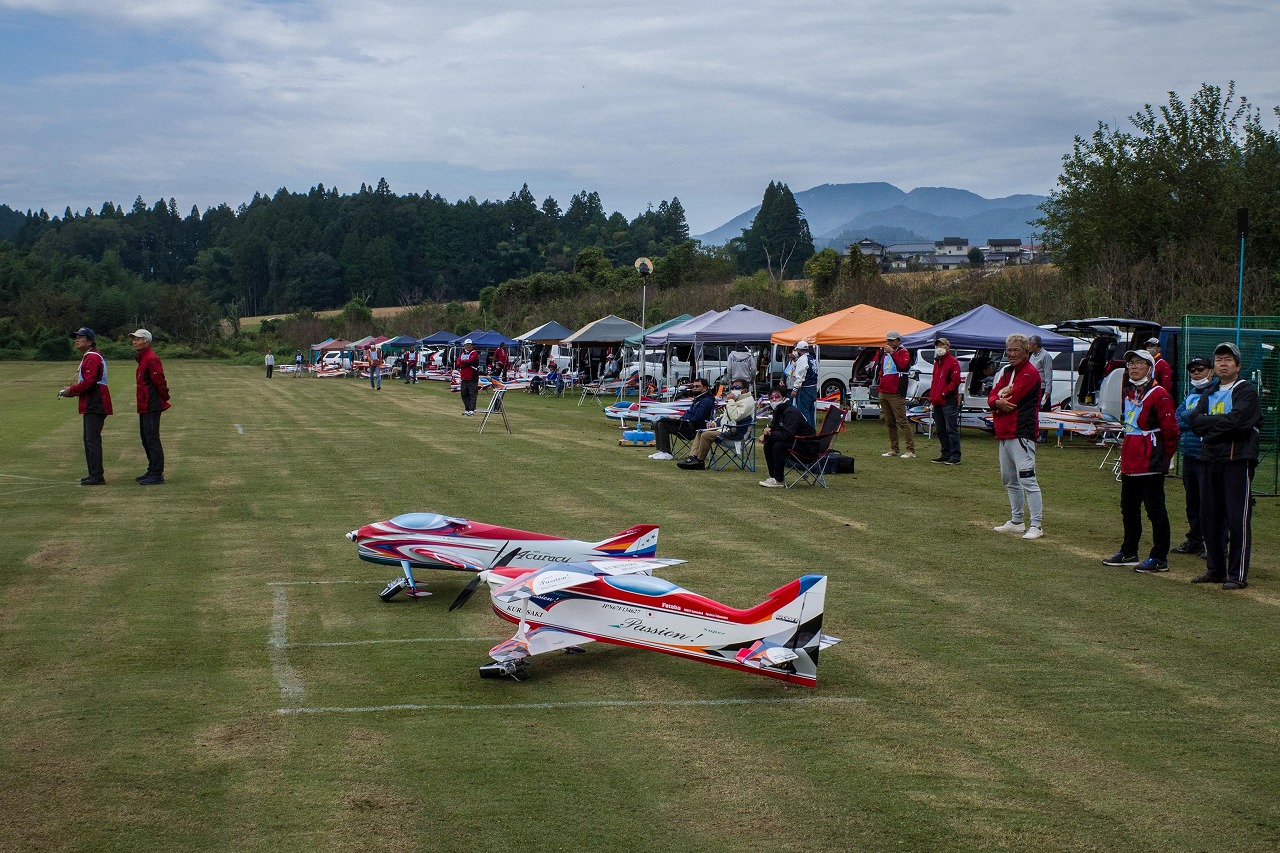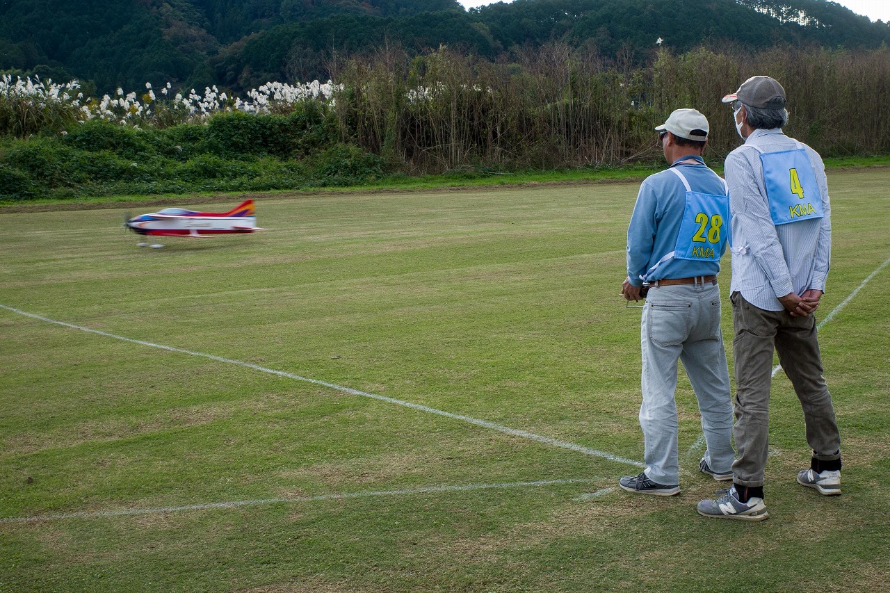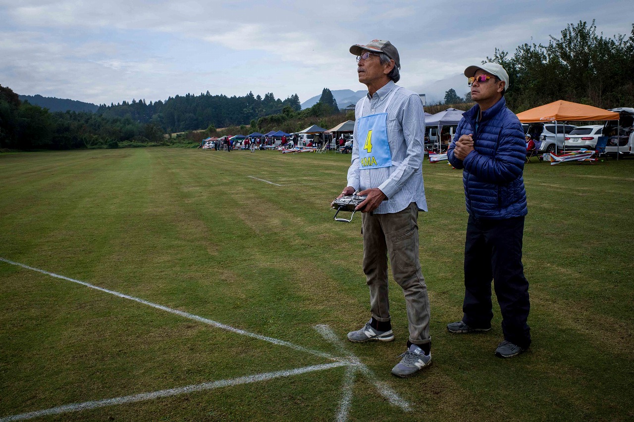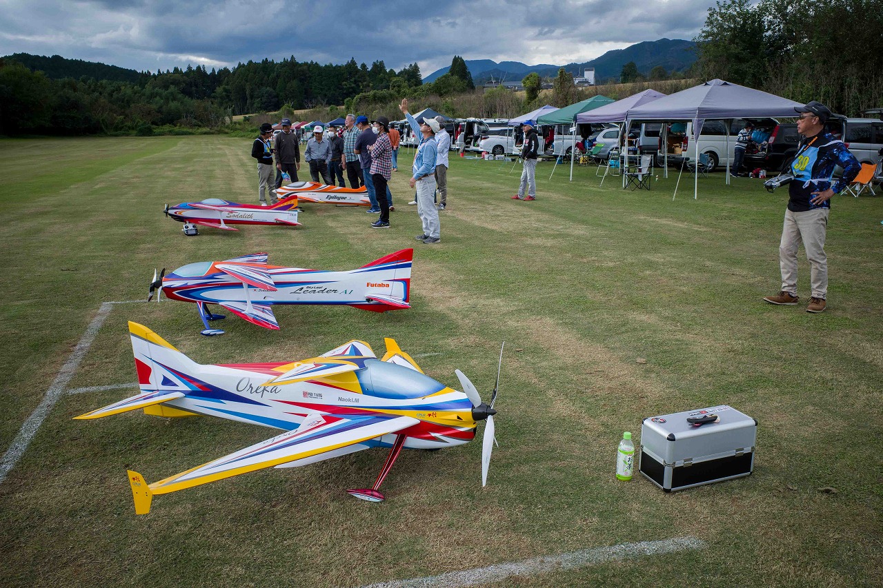| 今年は8チームの参加をいただきました。コロナ禍の影響を受けて、飛ばせない状況もあり、参加を辞退されるチームもありました。それでも中四国や中部方面からの参加をいただき、楽しい大会を開催できましたことを感謝いたします。今年は中部方面からチームAMGの初参加をいただき、ありがとうございました。 選手の方々には前日の整備もお手伝をいいただきありがとうございました。また日没まで練習される様子には勝負にかける意気込みがすごいなっと。 この飛行場は朝の霧が心配でしたが、霧もなく、小雨でしょうか。でも8時過ぎには上がり、真正面の太陽も雲に隠れ、風もほとんどなく、少し空気が重いこれ以上ないくらいのフライト条件でした。第一ラウンドは全員好条件。第二ラウンドでは少し雲間から日がのぞいたりしますが、おおむね曇りでほぼ無風といい条件でした。午前中は2ラウンドまでで、午後から第三ラウンドとなりました。第二ラウンドまでは広島のテージャスが2000点でトップです。第二位はチームAMGが1934.6点。第三位は紀之國FC Aが1907.9点と続きます。1位とは差があり、今年はテージャスに持っていかれるかなと。 さて、昼からは半袖で過ごせるほど、暖かくなり、空には雲がなくなってしまいました。太陽がかなりまぶしくなっています。フライト順で、太陽の位置による運もあります。どのチームに女神がほほ笑むか? 第三ラウンドはかなりまぶしい中、始まりました。飛行機を見失うフライヤもいたようです。これも実力のうちですかね。第三ラウンドの終了時点で、広島のテージャスが2947.2点でトップです。第二位はチームAMGが2905.76点。第三位は紀之國FC Aが2897.34点と差が小さくなってきました。 ここまでの成績を発表して、いよいよ勝負の第四ラウンドです。フライヤにプレッシャーを掛けさせていただきました。まったく見ないようにされていた方もいましたが、きっと耳には入っていたでしょうね。ここで、雲がはりだしはじめ、太陽が隠れ、このまま隠れた状態が続くと思われました。風もなくいい条件に変わりました。第一ラウンドの条件に戻ったようです。これもプレッシャーになるかもです。 そして第四ラウンドではチームAMGのM嶋選手が見事な飛びで、トップをとり、みごと逆転優勝となりました。詳細は成績表をご覧ください。チームAMGさんは初参加で、いきなり優勝をさらっていきました。来年も参加をいただきますようにお願いいたします。 一日をとおしてラウンド毎の条件はほぼ同じだったと思います。また、この飛行場にしてはこんないいフライトの天候はお目にかかったことがないくらいでした。皆さんの精進の賜物と思います。来年も予定しますので、多くのクラブの参加をお待ちしております。 最後に審査をしていただきました上田さん、鈴木さん、羽根田さん、運営にご協力をいただきました山原さん、藤本さん、加藤さんには御礼申し上げます。 文:KMA曲技委員長 神戸祥明 写真:神戸祥明 |
