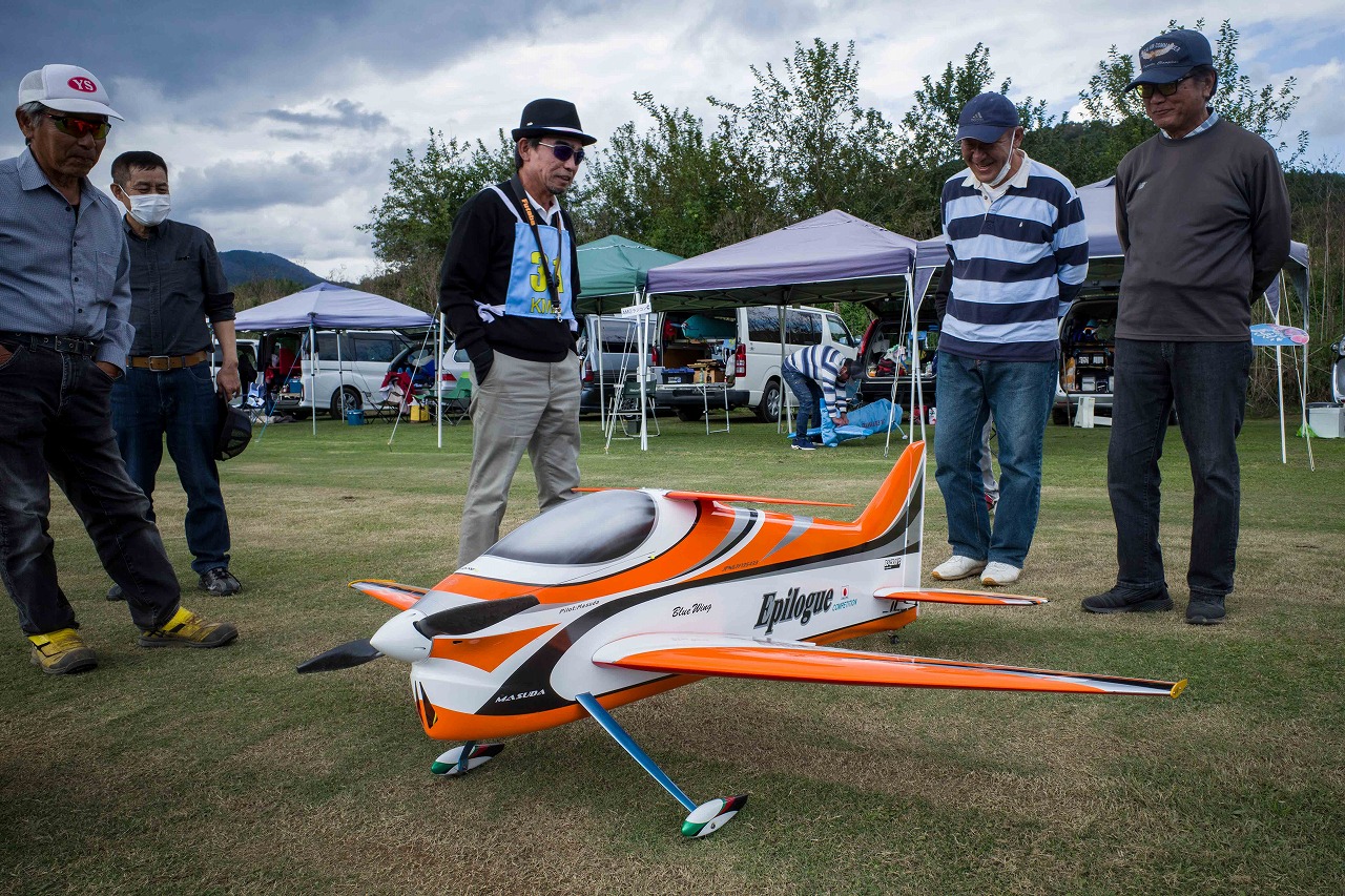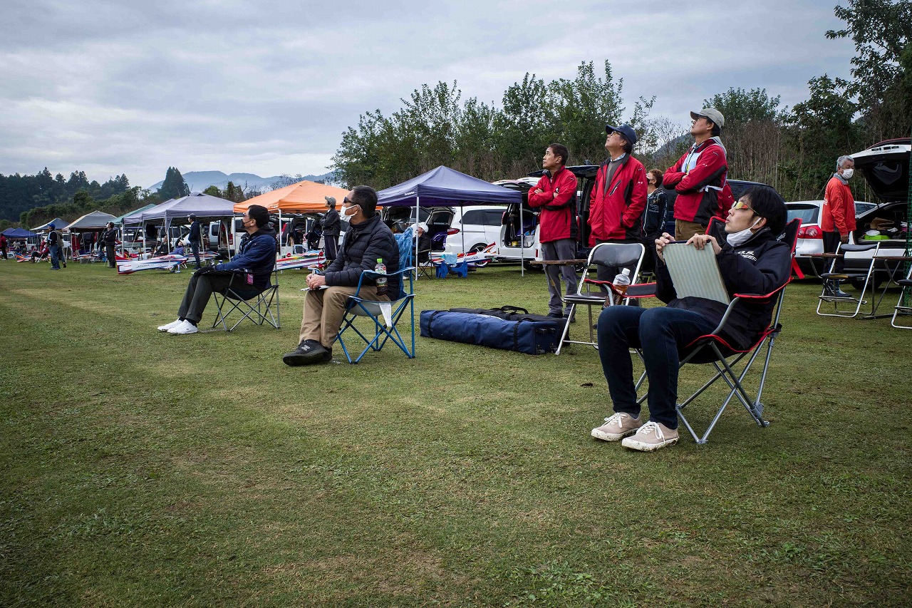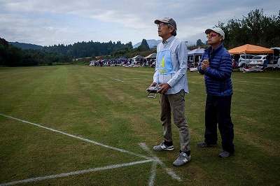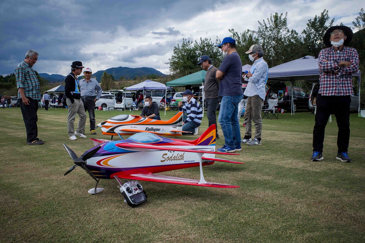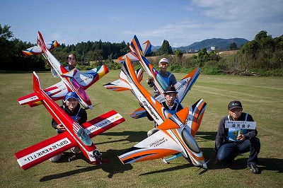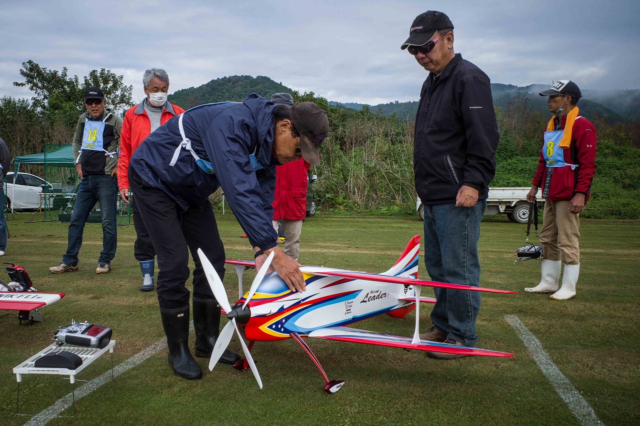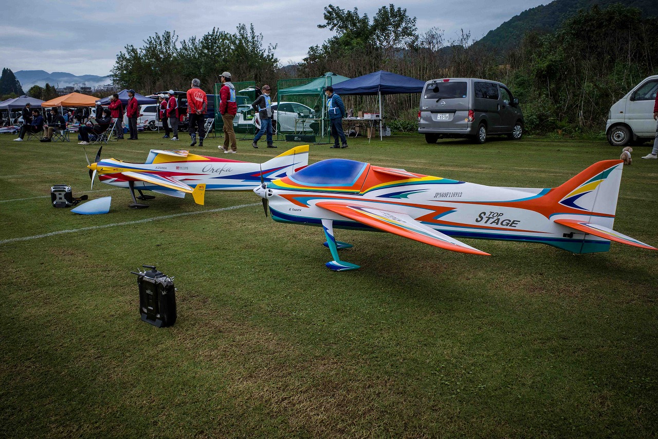 | 今年は8チームの参加をいただきました。コロナ禍の影響を受けて、飛ばせない状況もあり、参加を辞退されるチームもありました。それでも中四国や中部方面からの参加をいただき、楽しい大会を開催できましたことを感謝いたします。今年は中部方面からチームAMGの初参加をいただき、ありがとうございました。 選手の方々には前日の整備もお手伝をいいただきありがとうございました。また日没まで練習される様子には勝負にかける意気込みがすごいなっと。 この飛行場は朝の霧が心配でしたが、霧もなく、小雨でしょうか。でも8時過ぎには上がり、真正面の太陽も雲に隠れ、風もほとんどなく、少し空気が重いこれ以上ないくらいのフライト条件でした。第一ラウンドは全員好条件。第二ラウンドでは少し雲間から日がのぞいたりしますが、おおむね曇りでほぼ無風といい条件でした。午前中は2ラウンドまでで、午後から第三ラウンドとなりました。第二ラウンドまでは広島のテージャスが2000点でトップです。第二位はチームAMGが1934.6点。第三位は紀之國FC Aが1907.9点と続きます。1位とは差があり、今年はテージャスに持っていかれるかなと。 さて、昼からは半袖で過ごせるほど、暖かくなり、空には雲がなくなってしまいました。太陽がかなりまぶしくなっています。フライト順で、太陽の位置による運もあります。どのチームに女神がほほ笑むか? 第三ラウンドはかなりまぶしい中、始まりました。飛行機を見失うフライヤもいたようです。これも実力のうちですかね。第三ラウンドの終了時点で、広島のテージャスが2947.2点でトップです。第二位はチームAMGが2905.76点。第三位は紀之國FC Aが2897.34点と差が小さくなってきました。 ここまでの成績を発表して、いよいよ勝負の第四ラウンドです。フライヤにプレッシャーを掛けさせていただきました。まったく見ないようにされていた方もいましたが、きっと耳には入っていたでしょうね。ここで、雲がはりだしはじめ、太陽が隠れ、このまま隠れた状態が続くと思われました。風もなくいい条件に変わりました。第一ラウンドの条件に戻ったようです。これもプレッシャーになるかもです。 そして第四ラウンドではチームAMGのM嶋選手が見事な飛びで、トップをとり、みごと逆転優勝となりました。詳細は成績表をご覧ください。チームAMGさんは初参加で、いきなり優勝をさらっていきました。来年も参加をいただきますようにお願いいたします。 一日をとおしてラウンド毎の条件はほぼ同じだったと思います。また、この飛行場にしてはこんないいフライトの天候はお目にかかったことがないくらいでした。皆さんの精進の賜物と思います。来年も予定しますので、多くのクラブの参加をお待ちしております。 最後に審査をしていただきました上田さん、鈴木さん、羽根田さん、運営にご協力をいただきました山原さん、藤本さん、加藤さんには御礼申し上げます。 文:KMA曲技委員長 神戸祥明 写真:神戸祥明 |