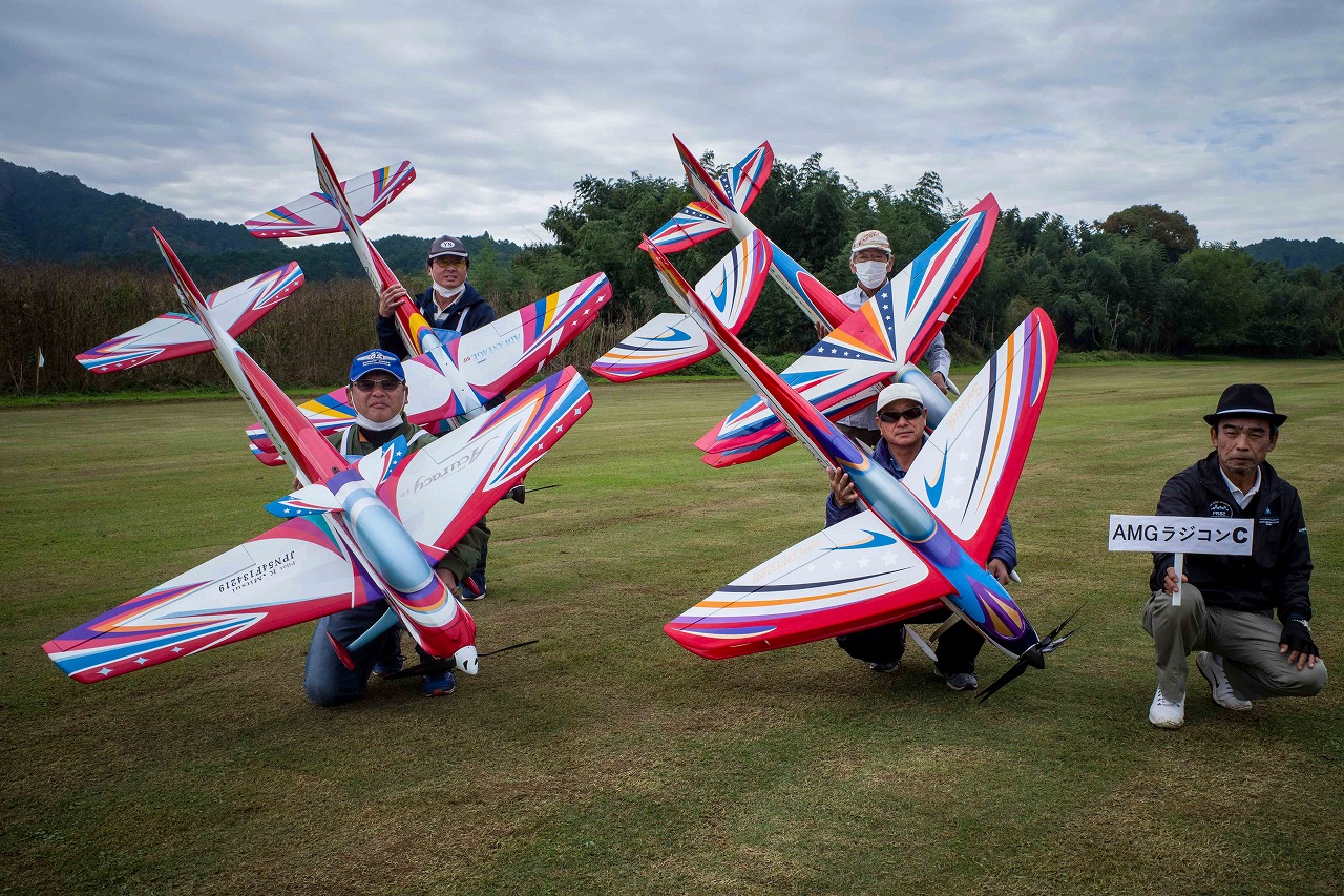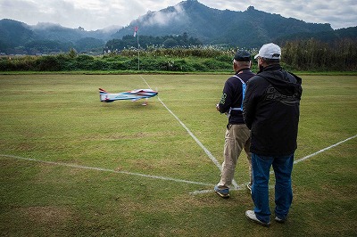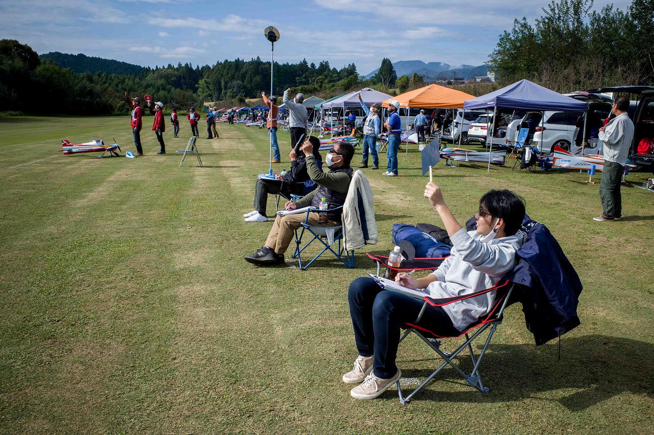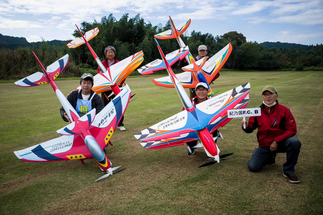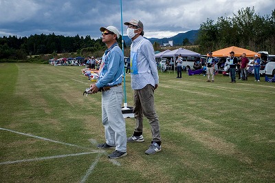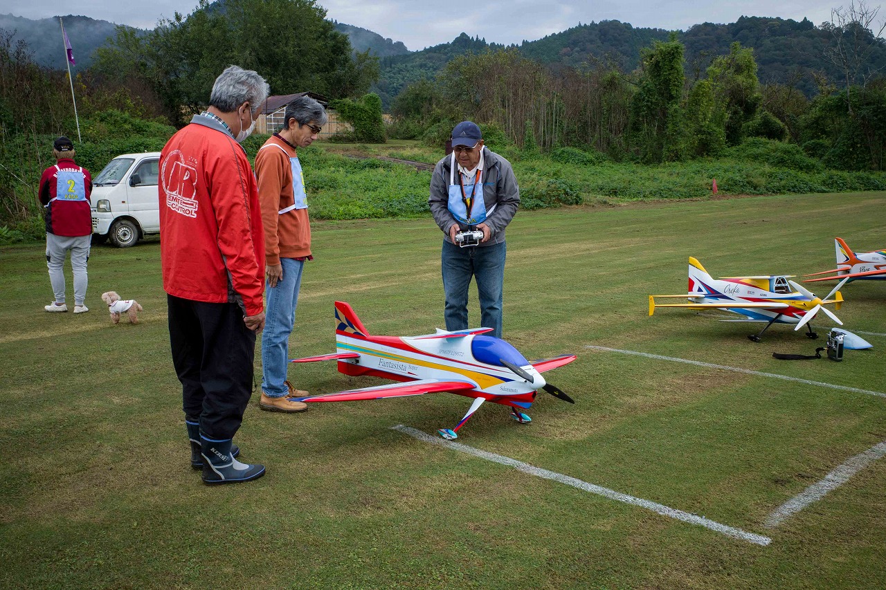 | 今年は8チームの参加をいただきました。コロナ禍の影響を受けて、飛ばせない状況もあり、参加を辞退されるチームもありました。それでも中四国や中部方面からの参加をいただき、楽しい大会を開催できましたことを感謝いたします。今年は中部方面からチームAMGの初参加をいただき、ありがとうございました。 選手の方々には前日の整備もお手伝をいいただきありがとうございました。また日没まで練習される様子には勝負にかける意気込みがすごいなっと。 この飛行場は朝の霧が心配でしたが、霧もなく、小雨でしょうか。でも8時過ぎには上がり、真正面の太陽も雲に隠れ、風もほとんどなく、少し空気が重いこれ以上ないくらいのフライト条件でした。第一ラウンドは全員好条件。第二ラウンドでは少し雲間から日がのぞいたりしますが、おおむね曇りでほぼ無風といい条件でした。午前中は2ラウンドまでで、午後から第三ラウンドとなりました。第二ラウンドまでは広島のテージャスが2000点でトップです。第二位はチームAMGが1934.6点。第三位は紀之國FC Aが1907.9点と続きます。1位とは差があり、今年はテージャスに持っていかれるかなと。 さて、昼からは半袖で過ごせるほど、暖かくなり、空には雲がなくなってしまいました。太陽がかなりまぶしくなっています。フライト順で、太陽の位置による運もあります。どのチームに女神がほほ笑むか? 第三ラウンドはかなりまぶしい中、始まりました。飛行機を見失うフライヤもいたようです。これも実力のうちですかね。第三ラウンドの終了時点で、広島のテージャスが2947.2点でトップです。第二位はチームAMGが2905.76点。第三位は紀之國FC Aが2897.34点と差が小さくなってきました。 ここまでの成績を発表して、いよいよ勝負の第四ラウンドです。フライヤにプレッシャーを掛けさせていただきました。まったく見ないようにされていた方もいましたが、きっと耳には入っていたでしょうね。ここで、雲がはりだしはじめ、太陽が隠れ、このまま隠れた状態が続くと思われました。風もなくいい条件に変わりました。第一ラウンドの条件に戻ったようです。これもプレッシャーになるかもです。 そして第四ラウンドではチームAMGのM嶋選手が見事な飛びで、トップをとり、みごと逆転優勝となりました。詳細は成績表をご覧ください。チームAMGさんは初参加で、いきなり優勝をさらっていきました。来年も参加をいただきますようにお願いいたします。 一日をとおしてラウンド毎の条件はほぼ同じだったと思います。また、この飛行場にしてはこんないいフライトの天候はお目にかかったことがないくらいでした。皆さんの精進の賜物と思います。来年も予定しますので、多くのクラブの参加をお待ちしております。 最後に審査をしていただきました上田さん、鈴木さん、羽根田さん、運営にご協力をいただきました山原さん、藤本さん、加藤さんには御礼申し上げます。 文:KMA曲技委員長 神戸祥明 写真:神戸祥明 |