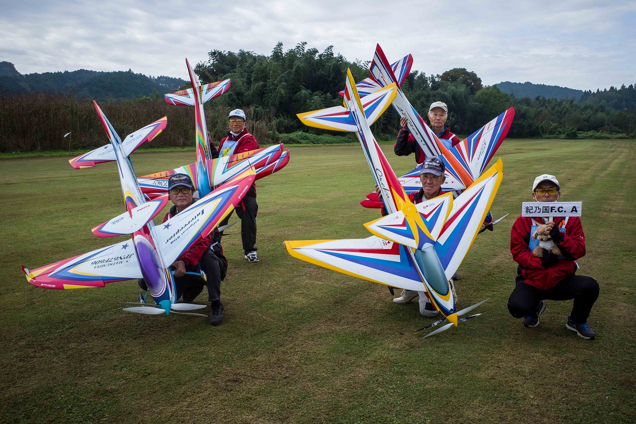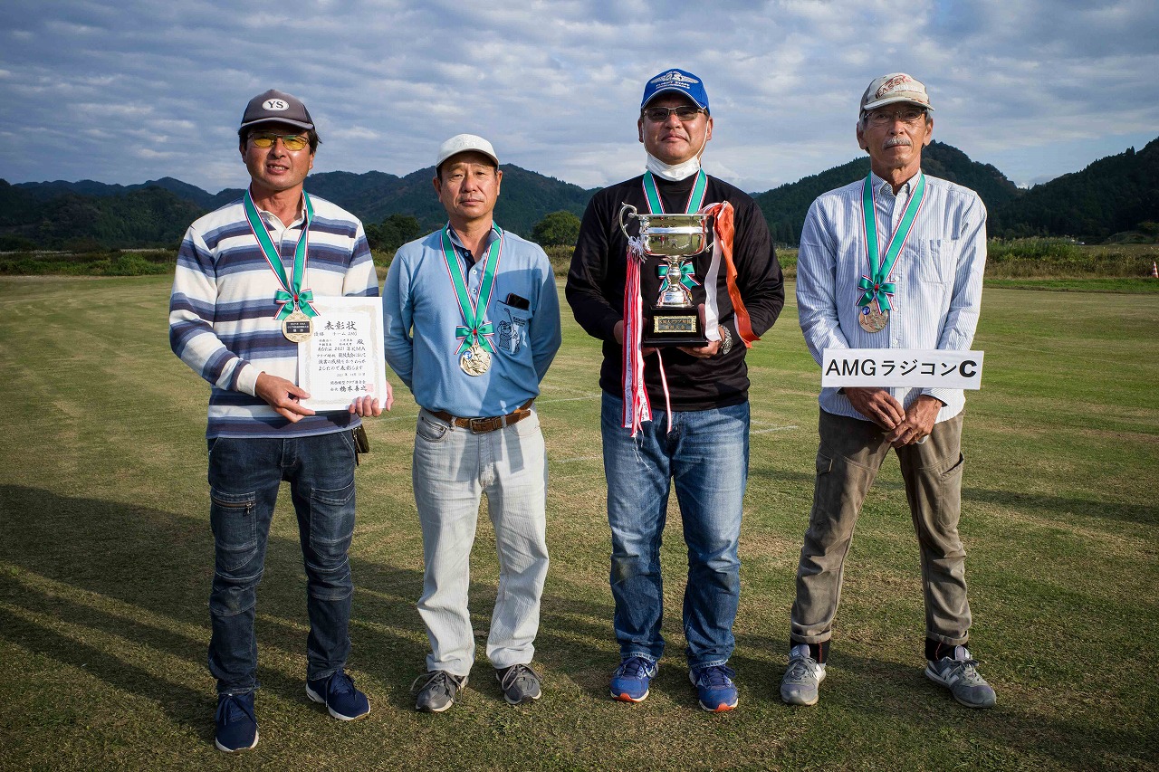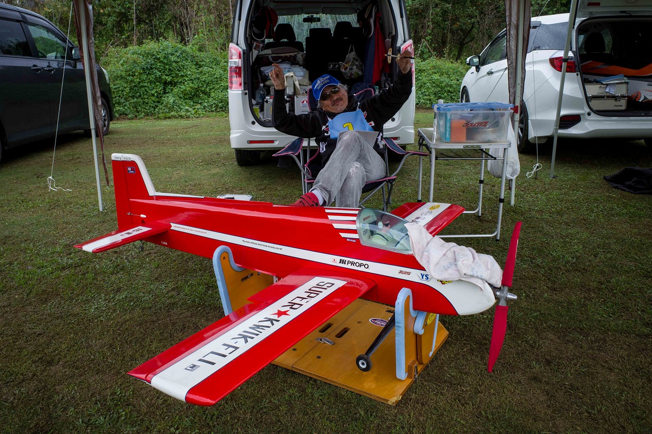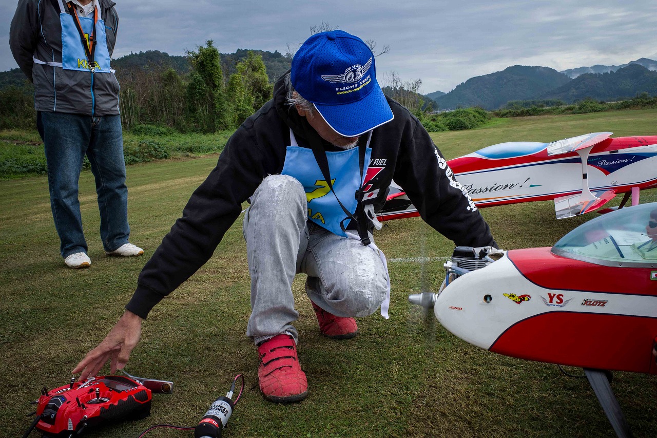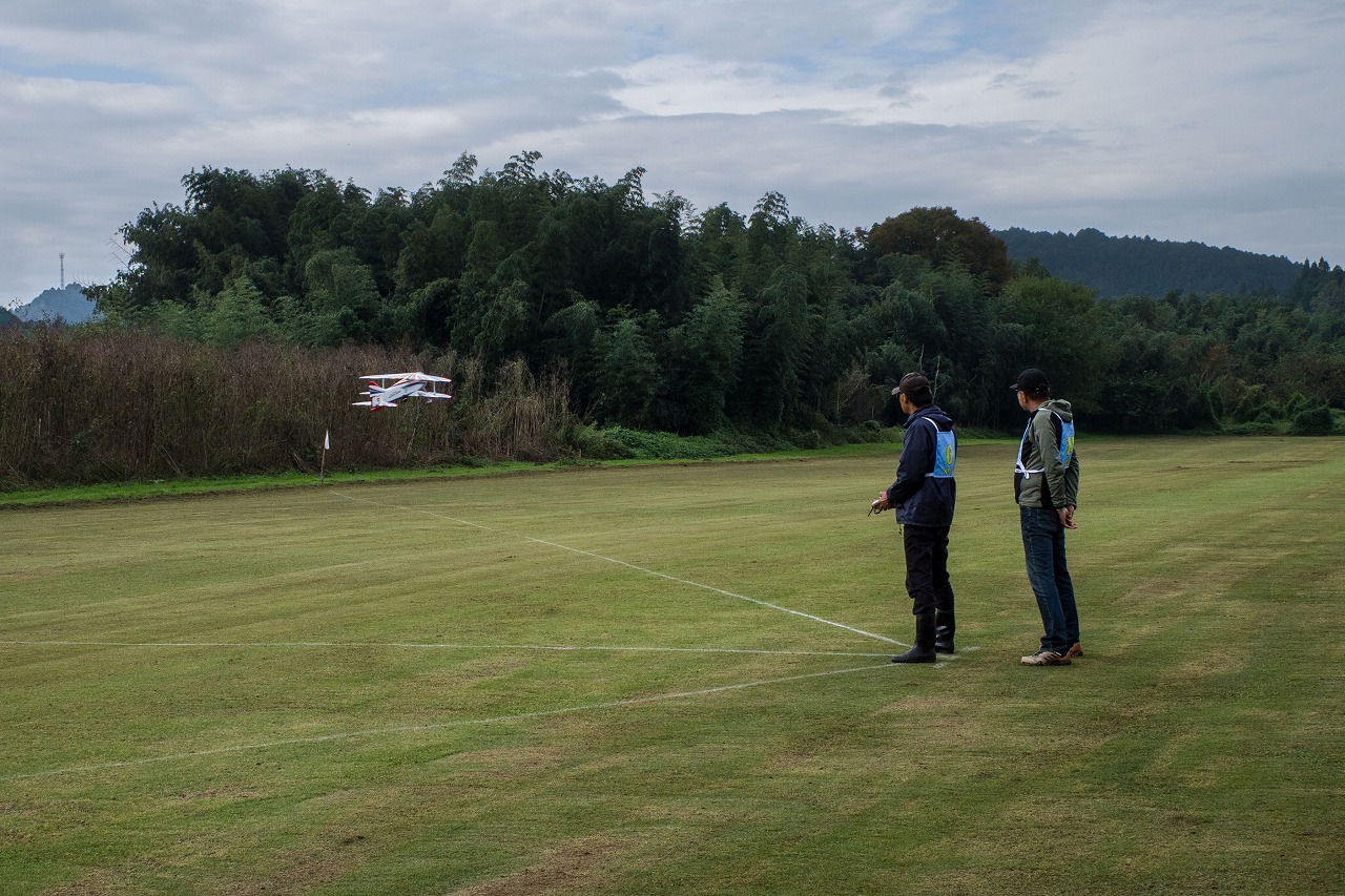 | 今年は8チームの参加をいただきました。コロナ禍の影響を受けて、飛ばせない状況もあり、参加を辞退されるチームもありました。それでも中四国や中部方面からの参加をいただき、楽しい大会を開催できましたことを感謝いたします。今年は中部方面からチームAMGの初参加をいただき、ありがとうございました。 選手の方々には前日の整備もお手伝をいいただきありがとうございました。また日没まで練習される様子には勝負にかける意気込みがすごいなっと。 この飛行場は朝の霧が心配でしたが、霧もなく、小雨でしょうか。でも8時過ぎには上がり、真正面の太陽も雲に隠れ、風もほとんどなく、少し空気が重いこれ以上ないくらいのフライト条件でした。第一ラウンドは全員好条件。第二ラウンドでは少し雲間から日がのぞいたりしますが、おおむね曇りでほぼ無風といい条件でした。午前中は2ラウンドまでで、午後から第三ラウンドとなりました。第二ラウンドまでは広島のテージャスが2000点でトップです。第二位はチームAMGが1934.6点。第三位は紀之國FC Aが1907.9点と続きます。1位とは差があり、今年はテージャスに持っていかれるかなと。 さて、昼からは半袖で過ごせるほど、暖かくなり、空には雲がなくなってしまいました。太陽がかなりまぶしくなっています。フライト順で、太陽の位置による運もあります。どのチームに女神がほほ笑むか? 第三ラウンドはかなりまぶしい中、始まりました。飛行機を見失うフライヤもいたようです。これも実力のうちですかね。第三ラウンドの終了時点で、広島のテージャスが2947.2点でトップです。第二位はチームAMGが2905.76点。第三位は紀之國FC Aが2897.34点と差が小さくなってきました。 ここまでの成績を発表して、いよいよ勝負の第四ラウンドです。フライヤにプレッシャーを掛けさせていただきました。まったく見ないようにされていた方もいましたが、きっと耳には入っていたでしょうね。ここで、雲がはりだしはじめ、太陽が隠れ、このまま隠れた状態が続くと思われました。風もなくいい条件に変わりました。第一ラウンドの条件に戻ったようです。これもプレッシャーになるかもです。 そして第四ラウンドではチームAMGのM嶋選手が見事な飛びで、トップをとり、みごと逆転優勝となりました。詳細は成績表をご覧ください。チームAMGさんは初参加で、いきなり優勝をさらっていきました。来年も参加をいただきますようにお願いいたします。 一日をとおしてラウンド毎の条件はほぼ同じだったと思います。また、この飛行場にしてはこんないいフライトの天候はお目にかかったことがないくらいでした。皆さんの精進の賜物と思います。来年も予定しますので、多くのクラブの参加をお待ちしております。 最後に審査をしていただきました上田さん、鈴木さん、羽根田さん、運営にご協力をいただきました山原さん、藤本さん、加藤さんには御礼申し上げます。 文:KMA曲技委員長 神戸祥明 写真:神戸祥明 |