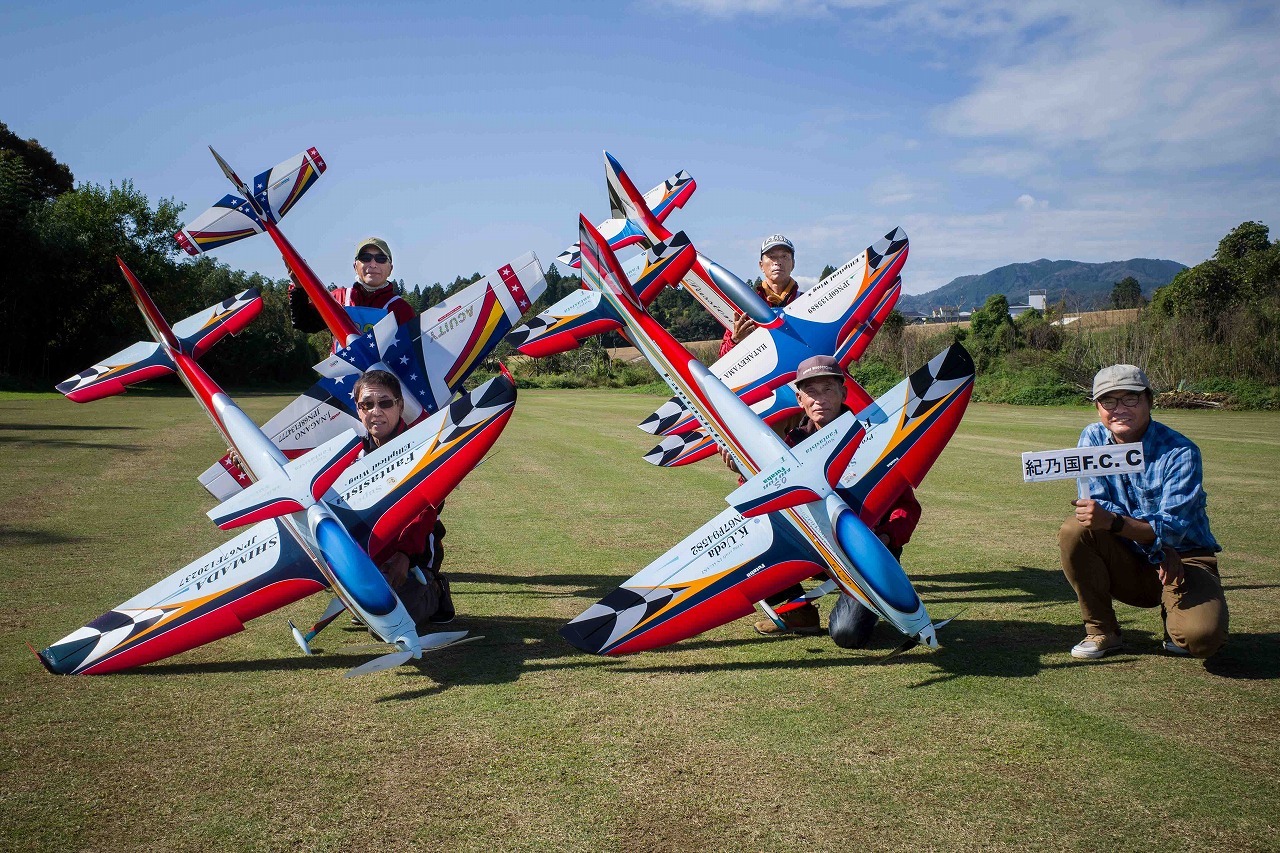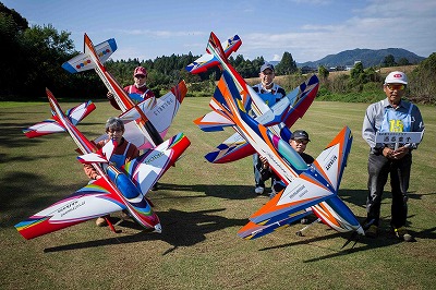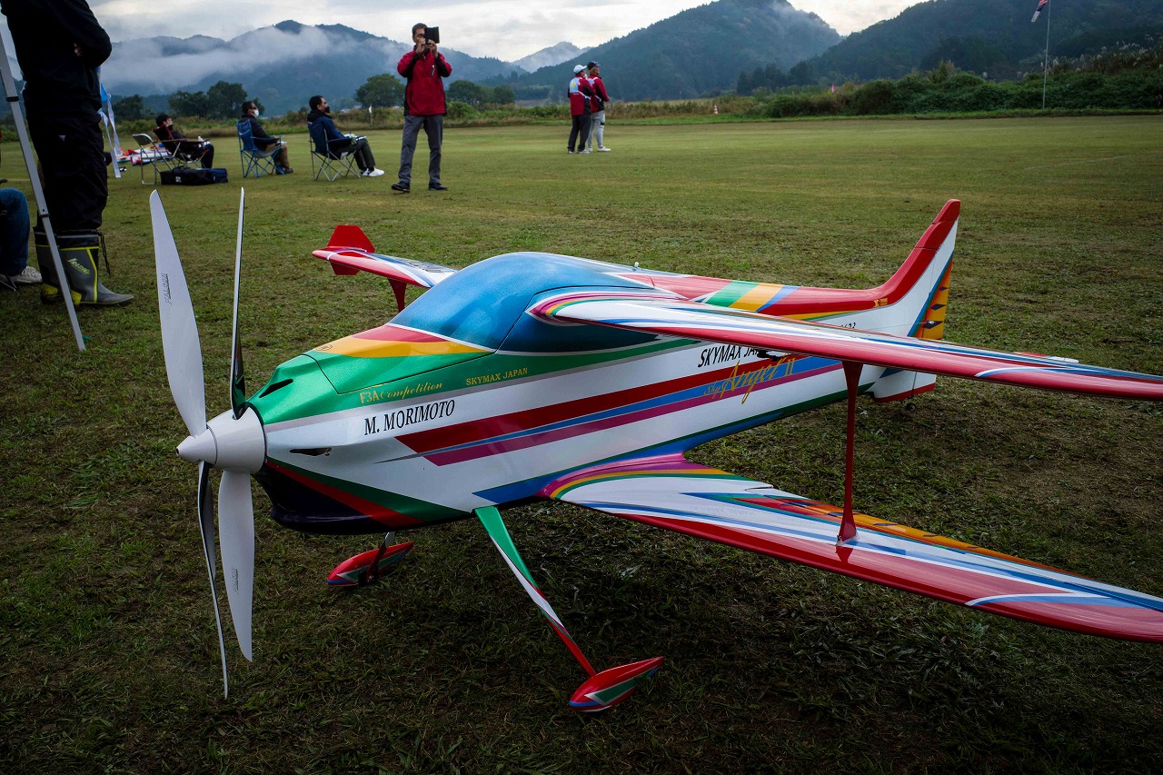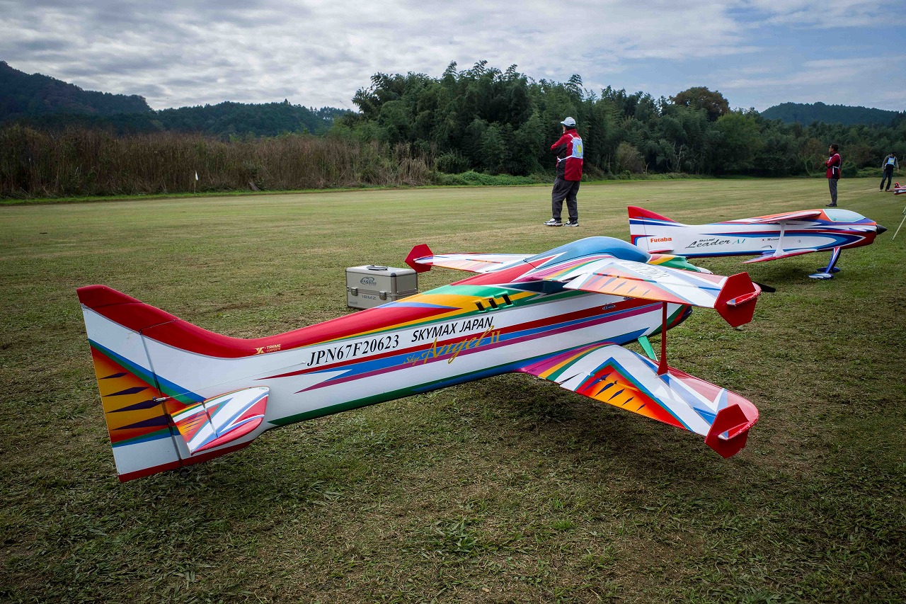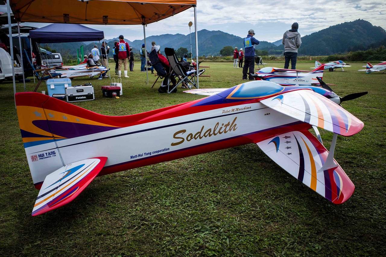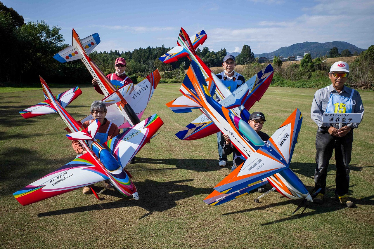 | 今年は8チームの参加をいただきました。コロナ禍の影響を受けて、飛ばせない状況もあり、参加を辞退されるチームもありました。それでも中四国や中部方面からの参加をいただき、楽しい大会を開催できましたことを感謝いたします。今年は中部方面からチームAMGの初参加をいただき、ありがとうございました。 選手の方々には前日の整備もお手伝をいいただきありがとうございました。また日没まで練習される様子には勝負にかける意気込みがすごいなっと。 この飛行場は朝の霧が心配でしたが、霧もなく、小雨でしょうか。でも8時過ぎには上がり、真正面の太陽も雲に隠れ、風もほとんどなく、少し空気が重いこれ以上ないくらいのフライト条件でした。第一ラウンドは全員好条件。第二ラウンドでは少し雲間から日がのぞいたりしますが、おおむね曇りでほぼ無風といい条件でした。午前中は2ラウンドまでで、午後から第三ラウンドとなりました。第二ラウンドまでは広島のテージャスが2000点でトップです。第二位はチームAMGが1934.6点。第三位は紀之國FC Aが1907.9点と続きます。1位とは差があり、今年はテージャスに持っていかれるかなと。 さて、昼からは半袖で過ごせるほど、暖かくなり、空には雲がなくなってしまいました。太陽がかなりまぶしくなっています。フライト順で、太陽の位置による運もあります。どのチームに女神がほほ笑むか? 第三ラウンドはかなりまぶしい中、始まりました。飛行機を見失うフライヤもいたようです。これも実力のうちですかね。第三ラウンドの終了時点で、広島のテージャスが2947.2点でトップです。第二位はチームAMGが2905.76点。第三位は紀之國FC Aが2897.34点と差が小さくなってきました。 ここまでの成績を発表して、いよいよ勝負の第四ラウンドです。フライヤにプレッシャーを掛けさせていただきました。まったく見ないようにされていた方もいましたが、きっと耳には入っていたでしょうね。ここで、雲がはりだしはじめ、太陽が隠れ、このまま隠れた状態が続くと思われました。風もなくいい条件に変わりました。第一ラウンドの条件に戻ったようです。これもプレッシャーになるかもです。 そして第四ラウンドではチームAMGのM嶋選手が見事な飛びで、トップをとり、みごと逆転優勝となりました。詳細は成績表をご覧ください。チームAMGさんは初参加で、いきなり優勝をさらっていきました。来年も参加をいただきますようにお願いいたします。 一日をとおしてラウンド毎の条件はほぼ同じだったと思います。また、この飛行場にしてはこんないいフライトの天候はお目にかかったことがないくらいでした。皆さんの精進の賜物と思います。来年も予定しますので、多くのクラブの参加をお待ちしております。 最後に審査をしていただきました上田さん、鈴木さん、羽根田さん、運営にご協力をいただきました山原さん、藤本さん、加藤さんには御礼申し上げます。 文:KMA曲技委員長 神戸祥明 写真:神戸祥明 |