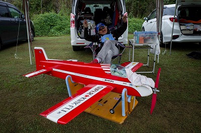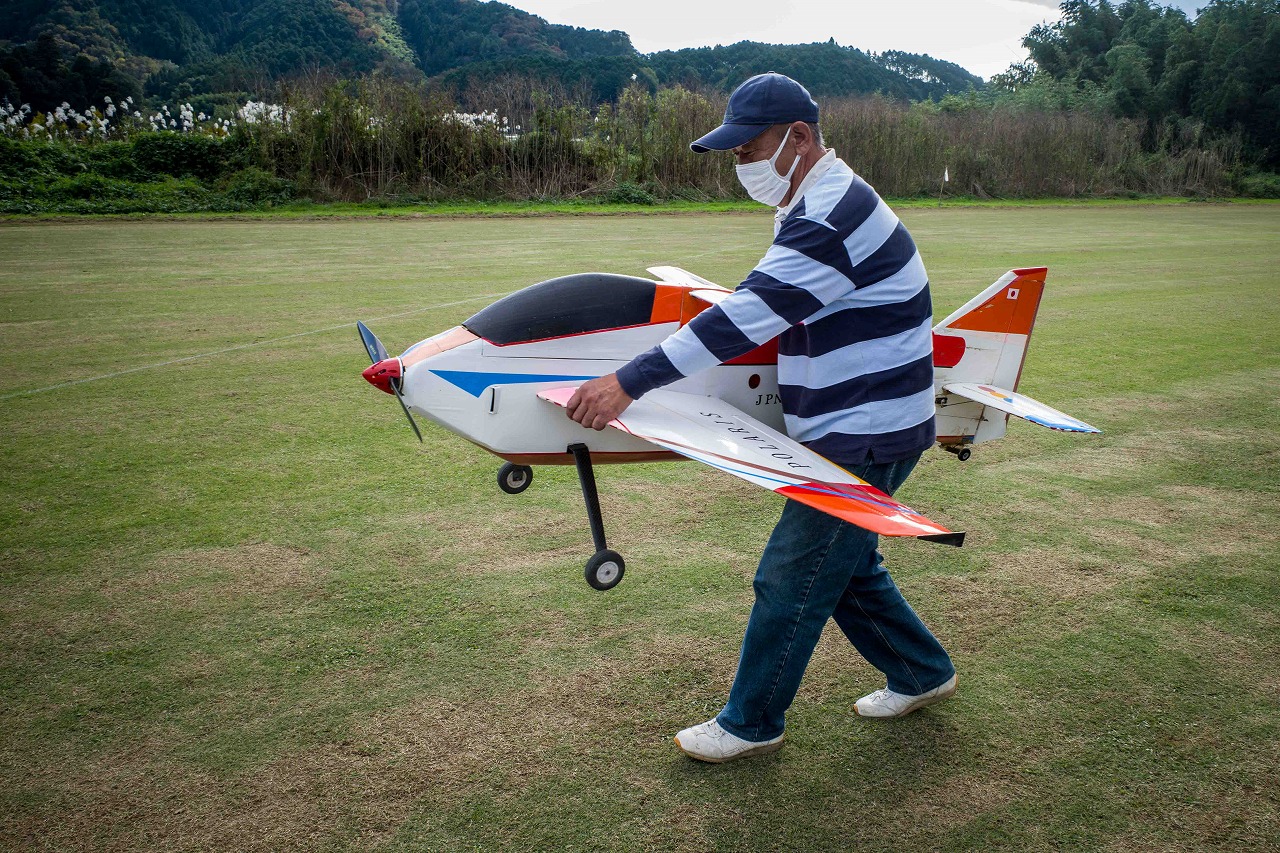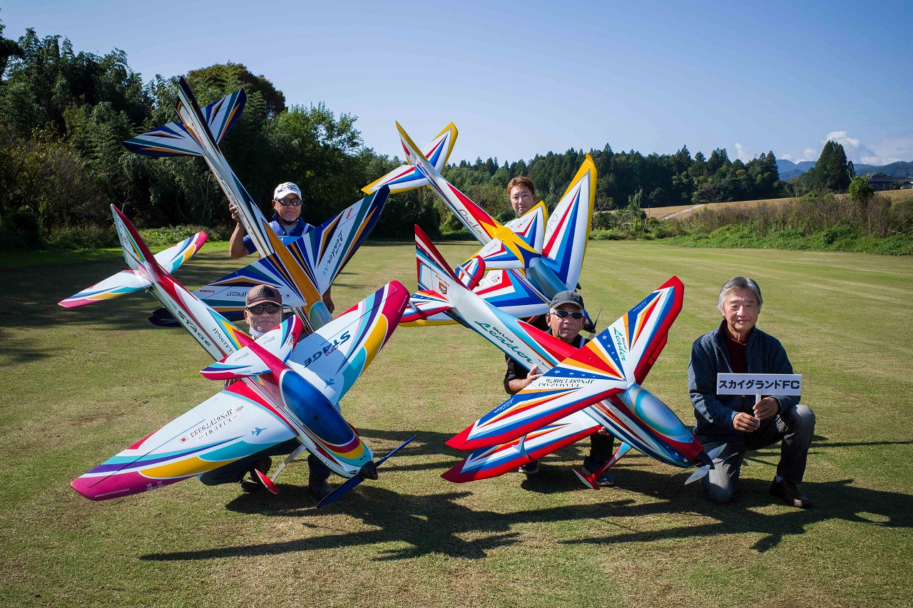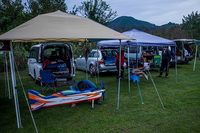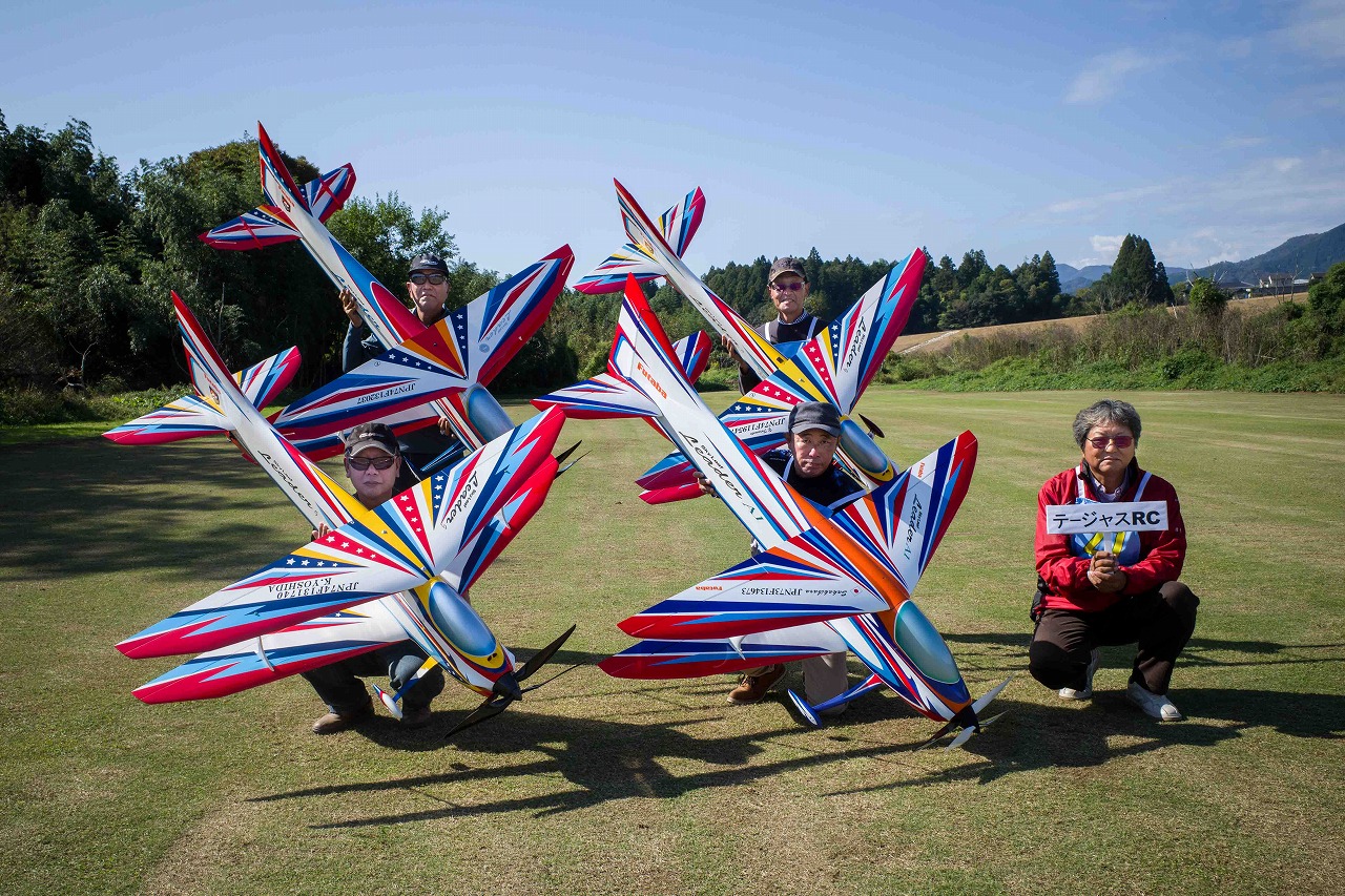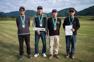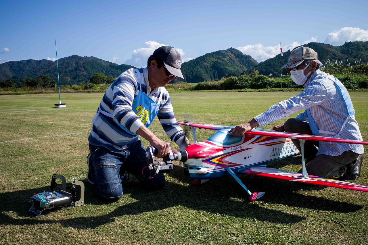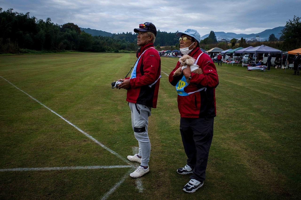 | 今年は8チームの参加をいただきました。コロナ禍の影響を受けて、飛ばせない状況もあり、参加を辞退されるチームもありました。それでも中四国や中部方面からの参加をいただき、楽しい大会を開催できましたことを感謝いたします。今年は中部方面からチームAMGの初参加をいただき、ありがとうございました。 選手の方々には前日の整備もお手伝をいいただきありがとうございました。また日没まで練習される様子には勝負にかける意気込みがすごいなっと。 この飛行場は朝の霧が心配でしたが、霧もなく、小雨でしょうか。でも8時過ぎには上がり、真正面の太陽も雲に隠れ、風もほとんどなく、少し空気が重いこれ以上ないくらいのフライト条件でした。第一ラウンドは全員好条件。第二ラウンドでは少し雲間から日がのぞいたりしますが、おおむね曇りでほぼ無風といい条件でした。午前中は2ラウンドまでで、午後から第三ラウンドとなりました。第二ラウンドまでは広島のテージャスが2000点でトップです。第二位はチームAMGが1934.6点。第三位は紀之國FC Aが1907.9点と続きます。1位とは差があり、今年はテージャスに持っていかれるかなと。 さて、昼からは半袖で過ごせるほど、暖かくなり、空には雲がなくなってしまいました。太陽がかなりまぶしくなっています。フライト順で、太陽の位置による運もあります。どのチームに女神がほほ笑むか? 第三ラウンドはかなりまぶしい中、始まりました。飛行機を見失うフライヤもいたようです。これも実力のうちですかね。第三ラウンドの終了時点で、広島のテージャスが2947.2点でトップです。第二位はチームAMGが2905.76点。第三位は紀之國FC Aが2897.34点と差が小さくなってきました。 ここまでの成績を発表して、いよいよ勝負の第四ラウンドです。フライヤにプレッシャーを掛けさせていただきました。まったく見ないようにされていた方もいましたが、きっと耳には入っていたでしょうね。ここで、雲がはりだしはじめ、太陽が隠れ、このまま隠れた状態が続くと思われました。風もなくいい条件に変わりました。第一ラウンドの条件に戻ったようです。これもプレッシャーになるかもです。 そして第四ラウンドではチームAMGのM嶋選手が見事な飛びで、トップをとり、みごと逆転優勝となりました。詳細は成績表をご覧ください。チームAMGさんは初参加で、いきなり優勝をさらっていきました。来年も参加をいただきますようにお願いいたします。 一日をとおしてラウンド毎の条件はほぼ同じだったと思います。また、この飛行場にしてはこんないいフライトの天候はお目にかかったことがないくらいでした。皆さんの精進の賜物と思います。来年も予定しますので、多くのクラブの参加をお待ちしております。 最後に審査をしていただきました上田さん、鈴木さん、羽根田さん、運営にご協力をいただきました山原さん、藤本さん、加藤さんには御礼申し上げます。 文:KMA曲技委員長 神戸祥明 写真:神戸祥明 |