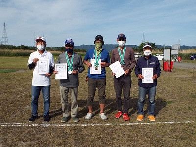 ![]() 2日目の競技 FAI F2Bオープンスタント 入賞者の皆さん 左より 4位 比気勝氏、2位 村田浩司氏、優勝 能米昭一郎氏、3位 末松茂樹氏、5位 増田昭三氏 |