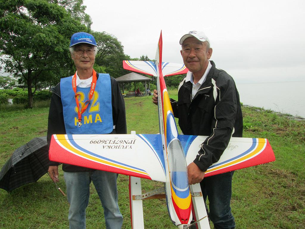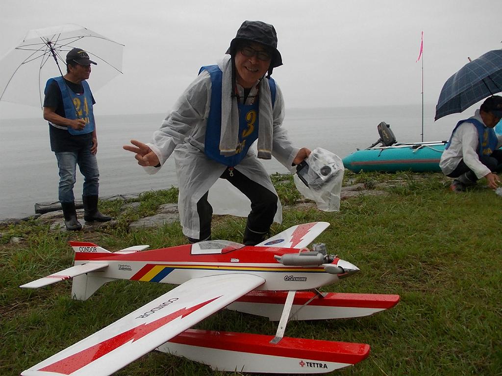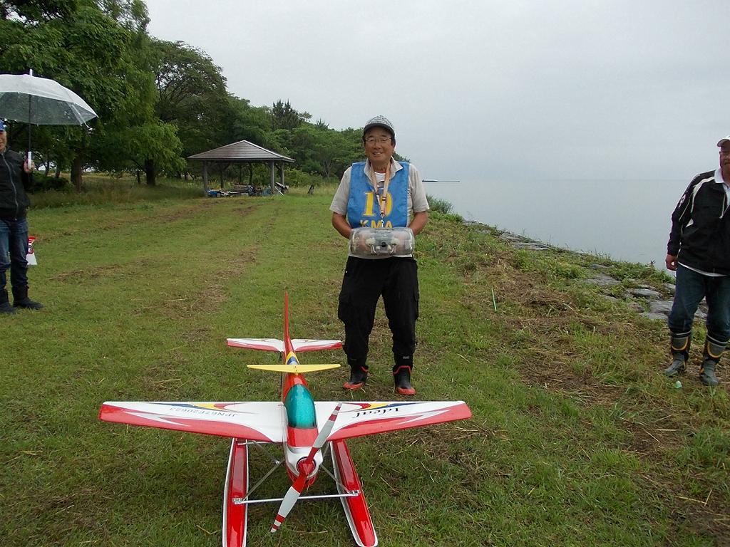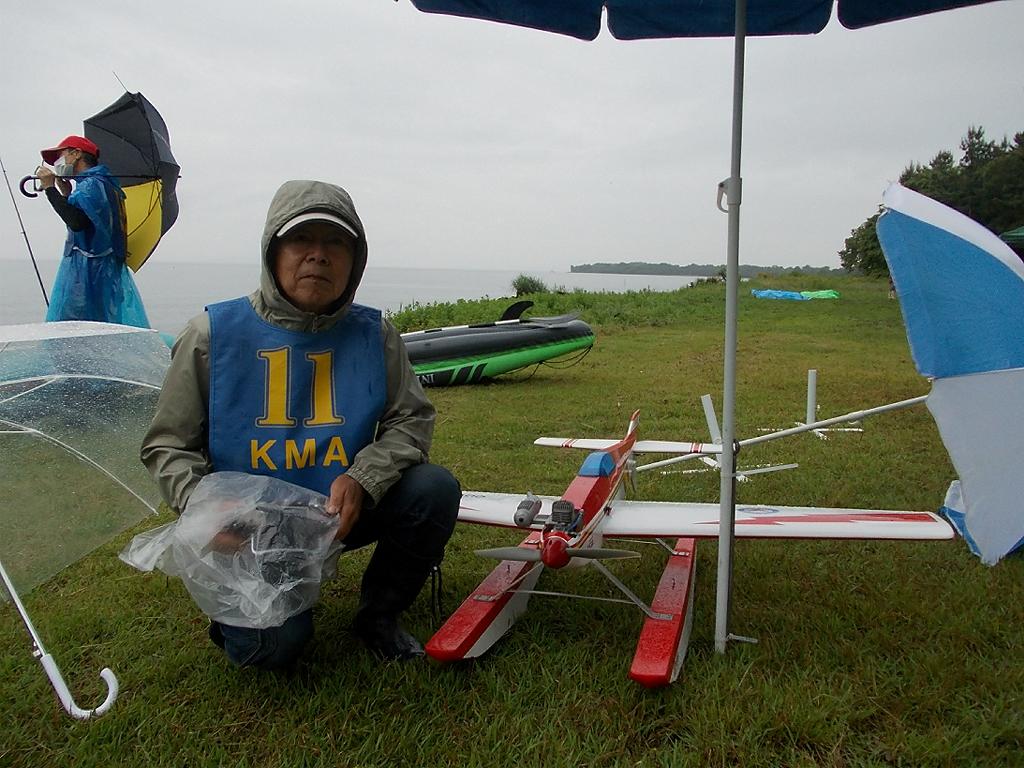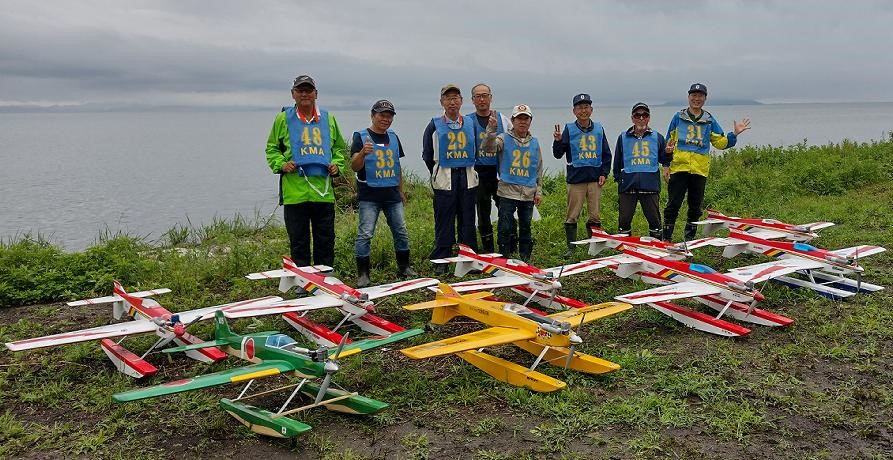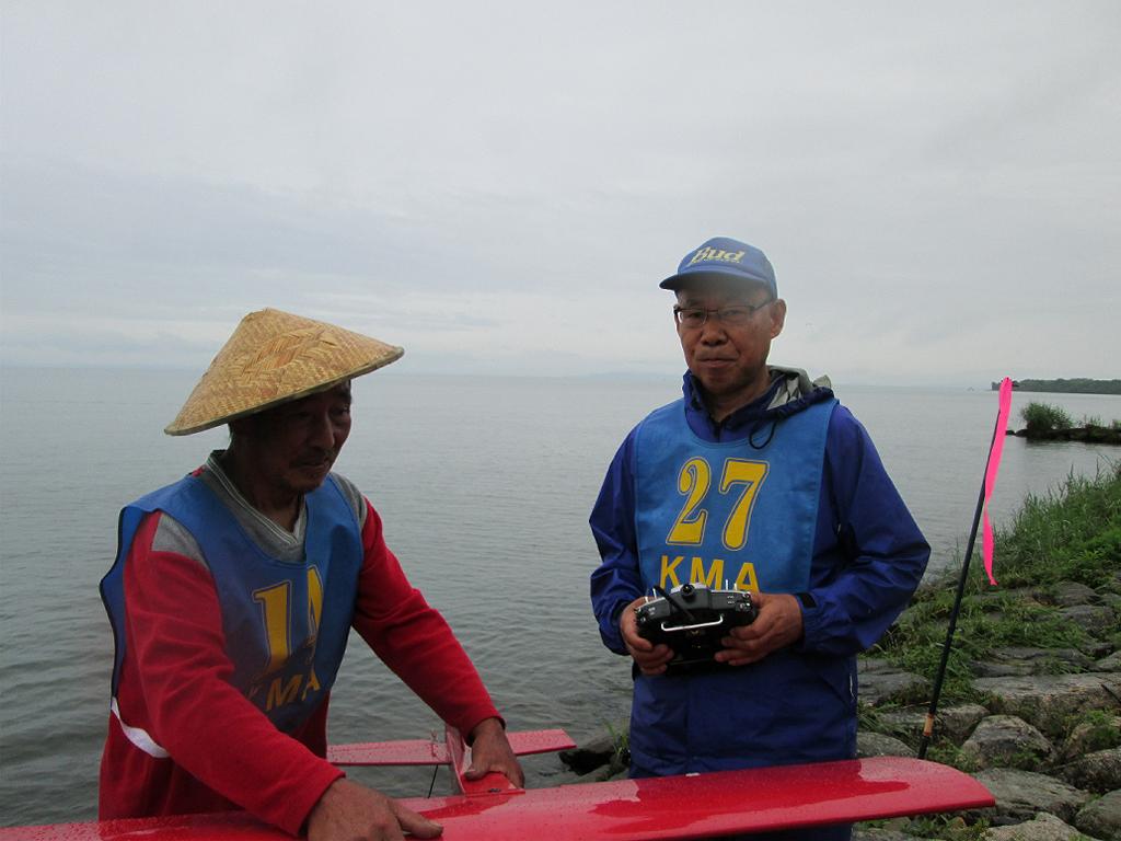 | 第64回 KMA琵琶湖水上機大会 6月11日 滋賀県高島市新旭町 今年の大会も波乱の幕開けです! 前日、土曜日の草刈り整備の後、少し靄がかかる天気でしたが波は穏やか、練習フライトには言うことなしでした。それが、日にちが変わるころからの雨、夜明けごろには梅雨らしいシトシトの雨になって、予報も今日一日中の小雨予報です。 朝、7時過ぎには委員長以下役員もそろいましたが、雨はやみそうにありません!7時半には選手もほぼそろい、この程度の雨なら送信機さえ濡れなければ、フライトに支障ないだろうとの、大方の意見で、大会は開始することに!!この時にばかりは2.4GHzの有難さを痛感しました!送信機のアンテナは短いし、受信機のアンテナも機体に収まるし、本当に機器メーカーに感謝です! 8時前に本日の大会開始を宣言し、受付を始めました。注意事項として、助手が傘をさし選手の雨よけをして、選手は送信機が濡れないように配布の袋を掛けるか濡らさない対策をとるように、との案内で進めました。 本日の参加者はこの雨天にも関わらず、最大のエントリーを頂き、感謝です。オープン級16名、初級10名、中級17名の総勢43名です。ダブルエントリーが多いので実際は31名程ですが、盛大な大会になりました。 相変わらずの小雨ですが湖面は穏やかで、フライトにはベストです。ただ、靄がかかり機体の色合いによっては、上空で見にくい機体もあるかと、心配です。なお、今回のエントリーでは国交省のリモートID搭載の事前チェックを行い、すべての機体が対象外であることを確認しております。 8時半前には受付も終わり、天気予報は午後に雨もやむ方向の様子となってきたので、競技順はオープン級・初級・中級で進め、途中雨が小降りか、止んだ時点で全員の記念撮影をすることで、スタートしました!10時頃にオープン級が終了し、ここで初級・中級の演技パターンのデモ飛行をお馴染みのメンバー、加藤氏の飛行・神戸氏の解説で実施しました。いよいよ初級競技のスタートです、やはり緊張の気配が選手の顔色に、あらわれます。さあー、頑張りましょう!今日のジャッジは初級が車田氏と栗田氏に、中級が加藤氏と三原氏に分かれ行われました。11時過ぎに初級の競技も終わり、引き続き中級の競技へと移りました。12時に弁当も届き、中級競技の途中ですが15分間ほどの食事休憩を取り、再開。14時前に競技は終了し、結果の集計と表彰の準備に移りました。この間選手には自由フライトを実施。15時前には集計も終わり発表と表彰式を、今日はKMA会長も参加して頂いているので、会長自ら選手への表彰をして戴きました。 表彰式の後、お楽しみの抽選会です!協賛メーカー様から頂いた品々を参加者数に分け、抽選でゼッケンと引き換えに協賛品を頂きます。メーカー様大感謝!最後に恒例の父の日のプレゼントとして委員長が用意したワインをじゃんけん大会で勝者が頂きます! すべてが終わり委員長による、雨の中ご協力頂いた役員・選手の皆様に感謝します。帰路お気をつけて、次回9月の大会で、また元気にお会いましょうとの挨拶で閉会しました。15時半、片付けまで終わり役員・お手伝い頂いた選手に、会長からご苦労様でしたと労いの挨拶があり、お開きになりました。 今回御協賛頂きました会社様は以下の通りです (順不動、敬称略) ㈱テトラ、㈱OK模型、ホビーショップ・トヨタ、双葉電子工業㈱、 三和電子機器㈱、小川精機㈱、 ㈱マルク、㈱斎藤製作所、カシオペア この場をお借りしまして、厚くお礼を申し上げます。 (文、写真、:KMA橋本実、 データ取りまとめ:橋本、テトラ山原さん) | ||