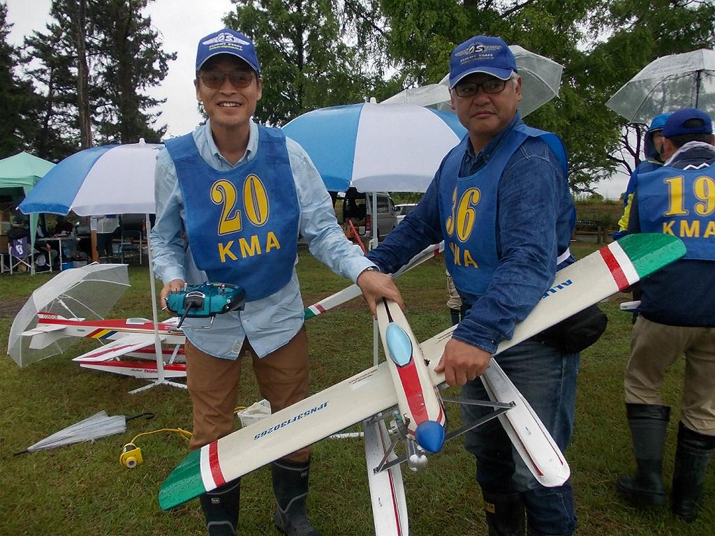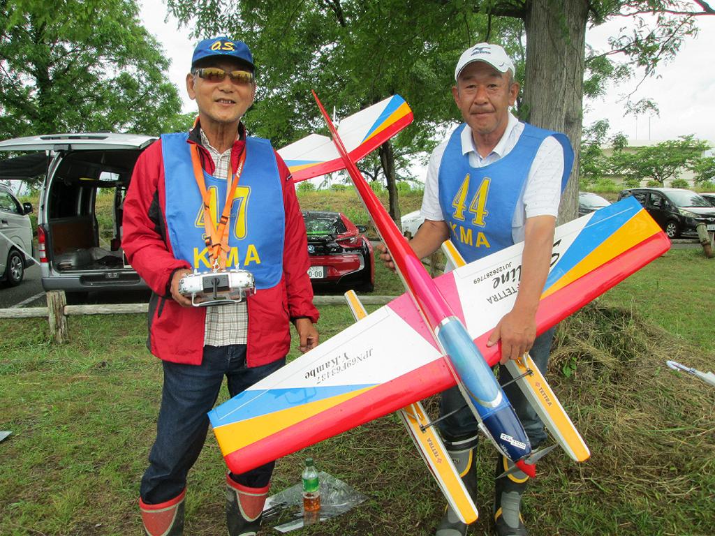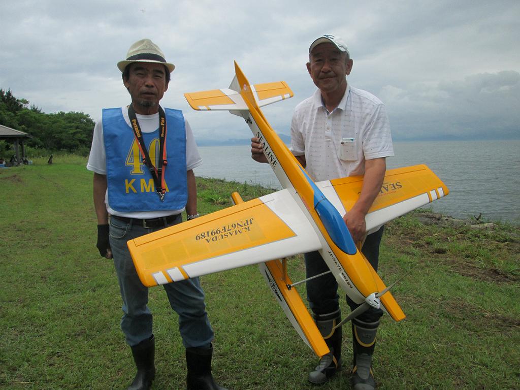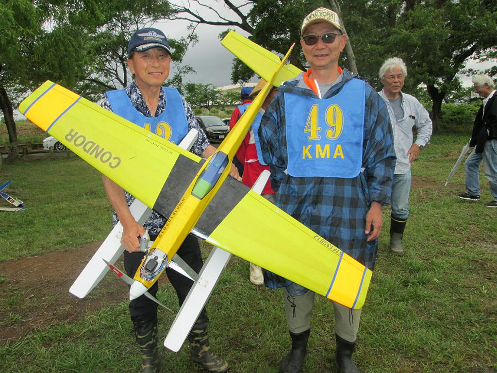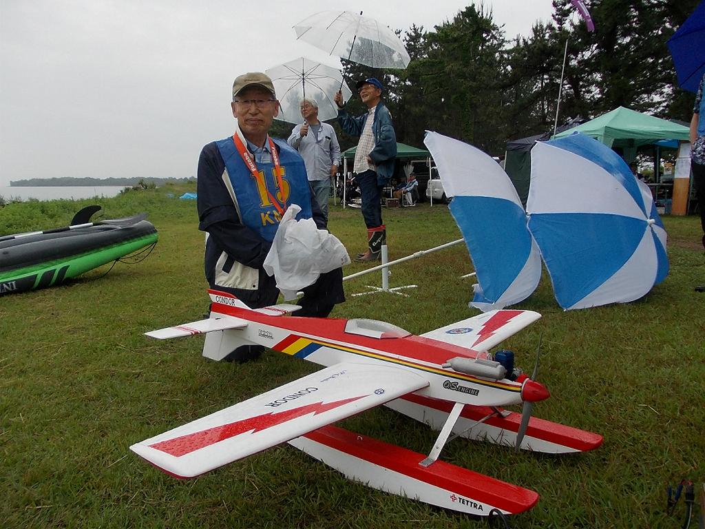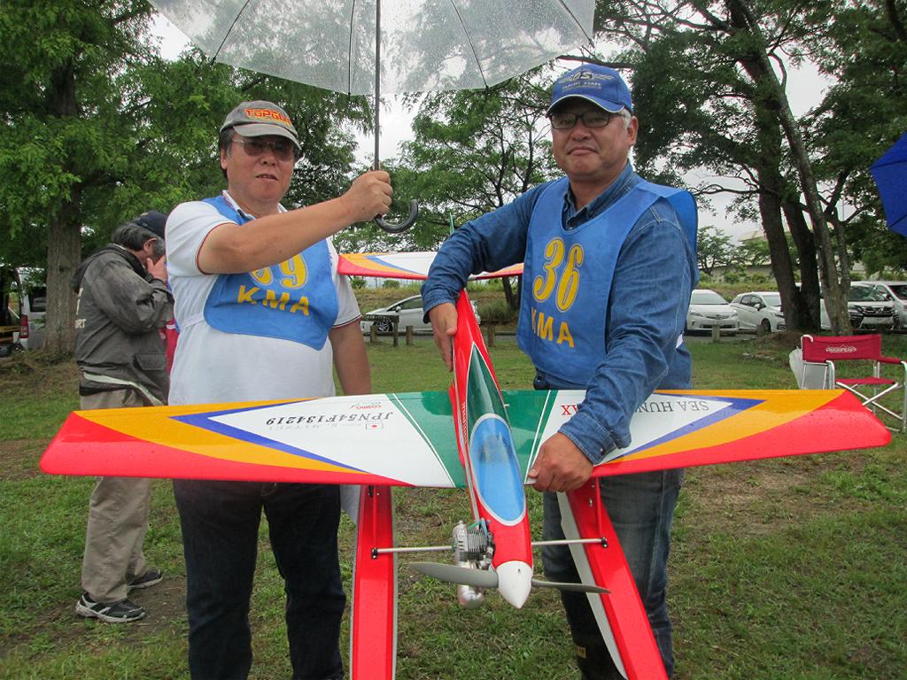 | 第64回 KMA琵琶湖水上機大会 6月11日 滋賀県高島市新旭町 今年の大会も波乱の幕開けです! 前日、土曜日の草刈り整備の後、少し靄がかかる天気でしたが波は穏やか、練習フライトには言うことなしでした。それが、日にちが変わるころからの雨、夜明けごろには梅雨らしいシトシトの雨になって、予報も今日一日中の小雨予報です。 朝、7時過ぎには委員長以下役員もそろいましたが、雨はやみそうにありません!7時半には選手もほぼそろい、この程度の雨なら送信機さえ濡れなければ、フライトに支障ないだろうとの、大方の意見で、大会は開始することに!!この時にばかりは2.4GHzの有難さを痛感しました!送信機のアンテナは短いし、受信機のアンテナも機体に収まるし、本当に機器メーカーに感謝です! 8時前に本日の大会開始を宣言し、受付を始めました。注意事項として、助手が傘をさし選手の雨よけをして、選手は送信機が濡れないように配布の袋を掛けるか濡らさない対策をとるように、との案内で進めました。 本日の参加者はこの雨天にも関わらず、最大のエントリーを頂き、感謝です。オープン級16名、初級10名、中級17名の総勢43名です。ダブルエントリーが多いので実際は31名程ですが、盛大な大会になりました。 相変わらずの小雨ですが湖面は穏やかで、フライトにはベストです。ただ、靄がかかり機体の色合いによっては、上空で見にくい機体もあるかと、心配です。なお、今回のエントリーでは国交省のリモートID搭載の事前チェックを行い、すべての機体が対象外であることを確認しております。 8時半前には受付も終わり、天気予報は午後に雨もやむ方向の様子となってきたので、競技順はオープン級・初級・中級で進め、途中雨が小降りか、止んだ時点で全員の記念撮影をすることで、スタートしました!10時頃にオープン級が終了し、ここで初級・中級の演技パターンのデモ飛行をお馴染みのメンバー、加藤氏の飛行・神戸氏の解説で実施しました。いよいよ初級競技のスタートです、やはり緊張の気配が選手の顔色に、あらわれます。さあー、頑張りましょう!今日のジャッジは初級が車田氏と栗田氏に、中級が加藤氏と三原氏に分かれ行われました。11時過ぎに初級の競技も終わり、引き続き中級の競技へと移りました。12時に弁当も届き、中級競技の途中ですが15分間ほどの食事休憩を取り、再開。14時前に競技は終了し、結果の集計と表彰の準備に移りました。この間選手には自由フライトを実施。15時前には集計も終わり発表と表彰式を、今日はKMA会長も参加して頂いているので、会長自ら選手への表彰をして戴きました。 表彰式の後、お楽しみの抽選会です!協賛メーカー様から頂いた品々を参加者数に分け、抽選でゼッケンと引き換えに協賛品を頂きます。メーカー様大感謝!最後に恒例の父の日のプレゼントとして委員長が用意したワインをじゃんけん大会で勝者が頂きます! すべてが終わり委員長による、雨の中ご協力頂いた役員・選手の皆様に感謝します。帰路お気をつけて、次回9月の大会で、また元気にお会いましょうとの挨拶で閉会しました。15時半、片付けまで終わり役員・お手伝い頂いた選手に、会長からご苦労様でしたと労いの挨拶があり、お開きになりました。 今回御協賛頂きました会社様は以下の通りです (順不動、敬称略) ㈱テトラ、㈱OK模型、ホビーショップ・トヨタ、双葉電子工業㈱、 三和電子機器㈱、小川精機㈱、 ㈱マルク、㈱斎藤製作所、カシオペア この場をお借りしまして、厚くお礼を申し上げます。 (文、写真、:KMA橋本実、 データ取りまとめ:橋本、テトラ山原さん) | ||