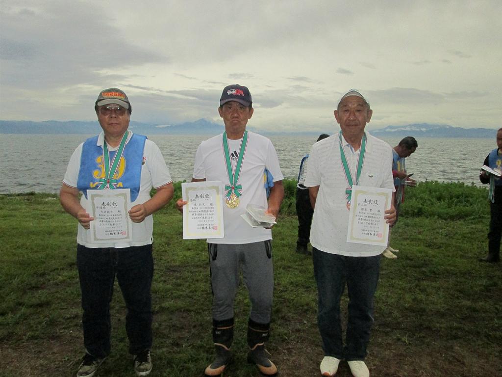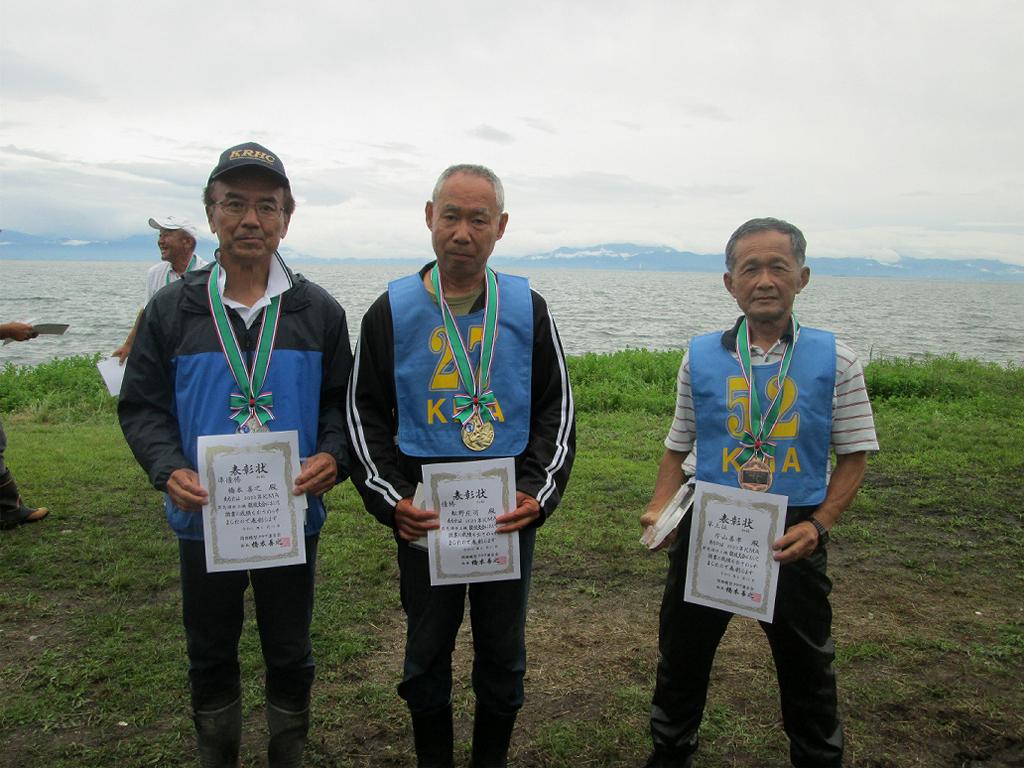![]() 33.初級入賞者-優勝 舩野さん(中央)、準優勝 橋本会長(左)、3位 片山さん(右) |