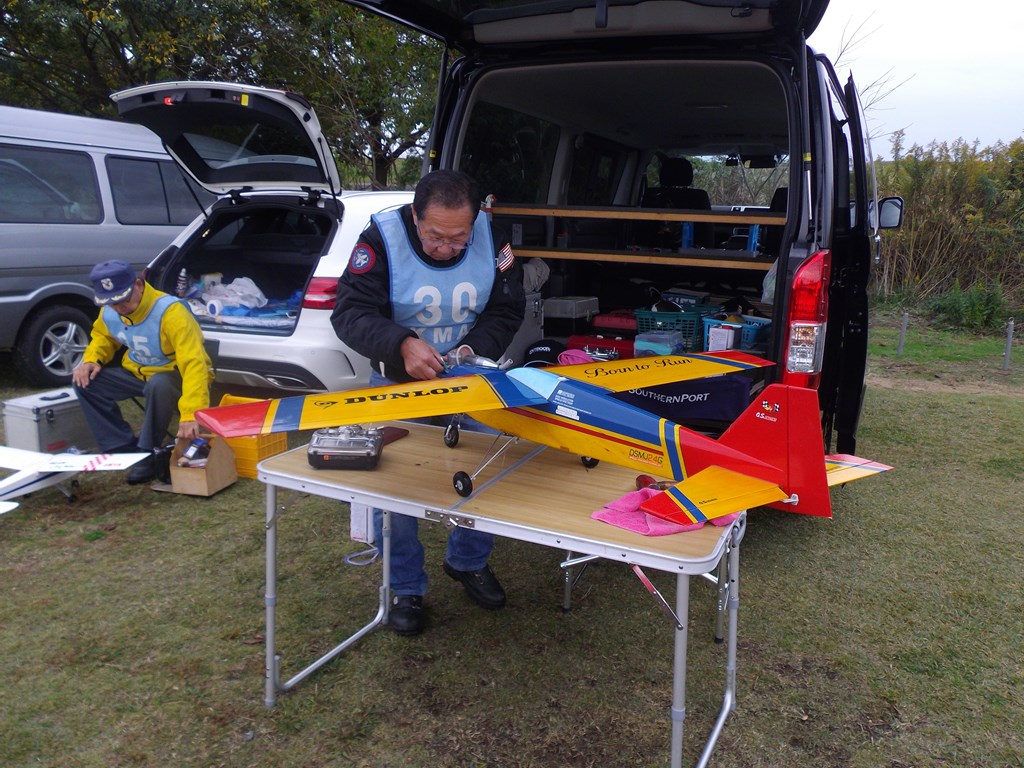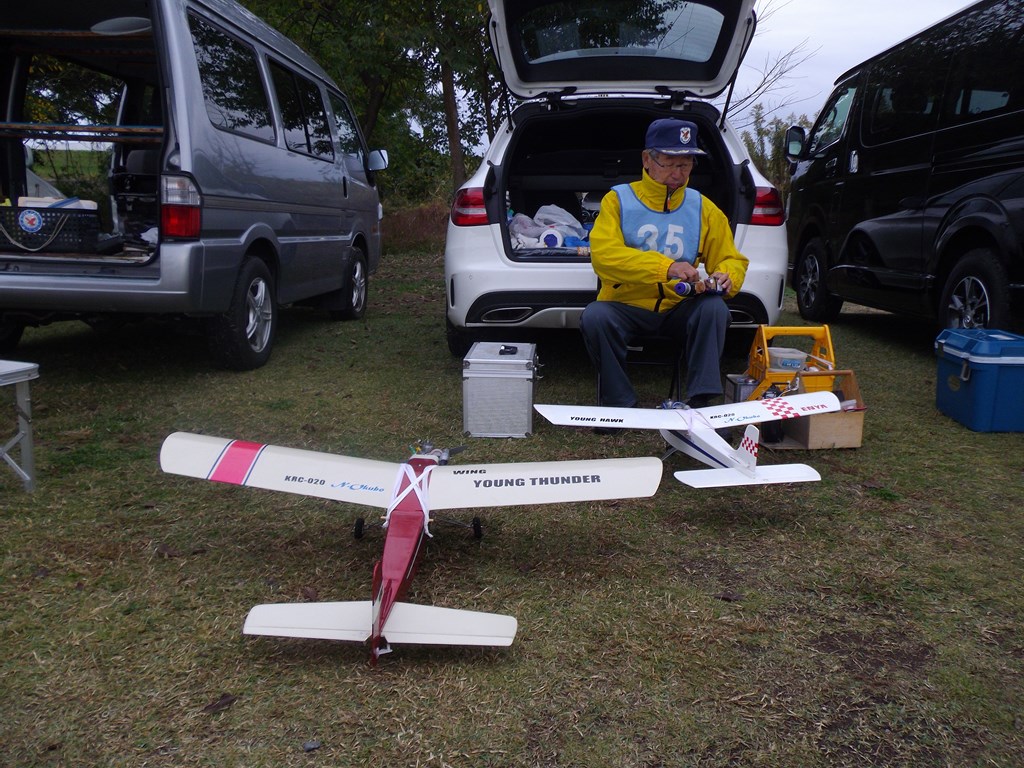 16.兵庫の岡本修平さんは車のトランクを作業場にしてバッテリー充電中。当日は競技よりも100gアンダーのグライダーの飛行に熱中、次回は新作機を準備しての参加を楽しみにしてますよ。 |