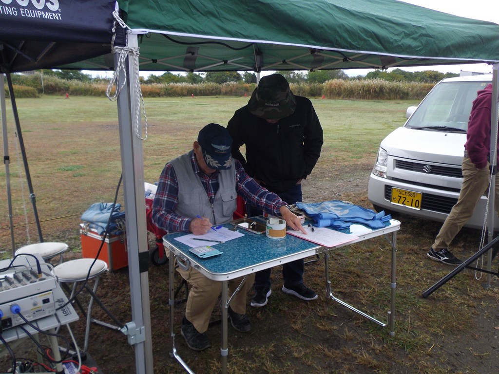 2.伊藤隆浩委員が受付の準備を進める。準備が整ったら受付では参加費集金とゼッケンの配布、参加者の確認がなされて終了する。参加者はこの間に機体の組立準備に忙しい。 |