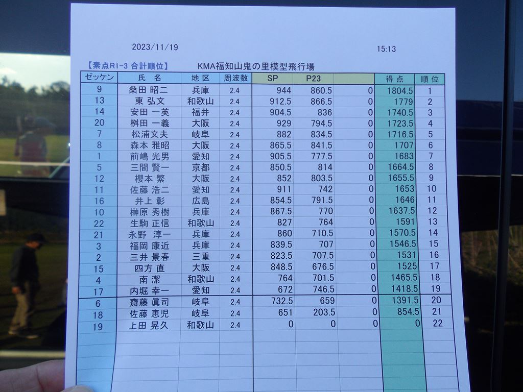 P23は今年最後の競技の為か、皆さん上手くこなしているようですが、スポーツマンは大きなばらつきが見られました。特に離着陸は普段の練習が無いのか、一定で直線の高度変化、正確な90度旋回、翼を揺らさないなどの挑戦を見たいところでした。特に電動コントラなど、トラクションが大きく掛かった機体の滑空テクニックが課題に見られました。また、70サイズの機体の位置取りや演技の大きさ、面の構成の研究も課題に見られました。