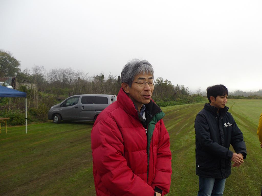 17.昼休みに林田卓氏によるP25デモ飛行を解説する 羽根田氏、今日は手ぶらで来たようだ! |