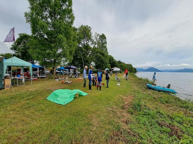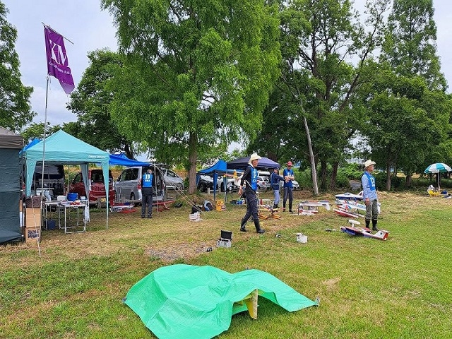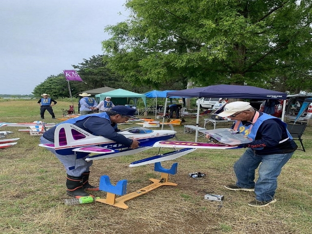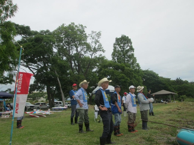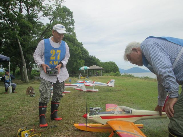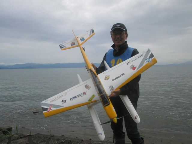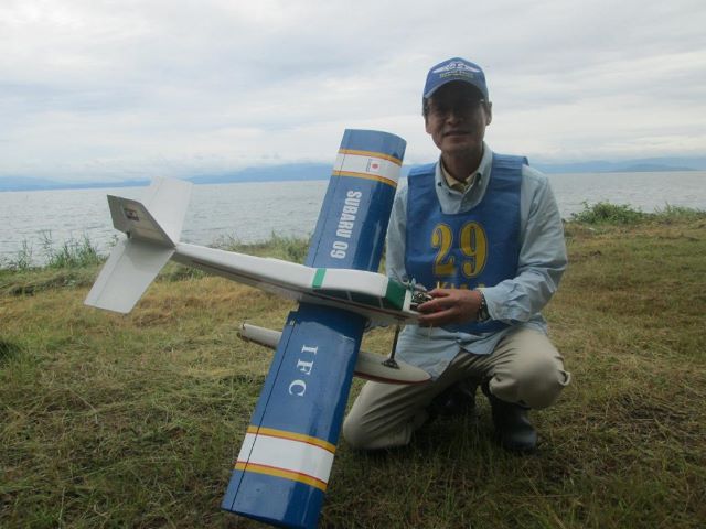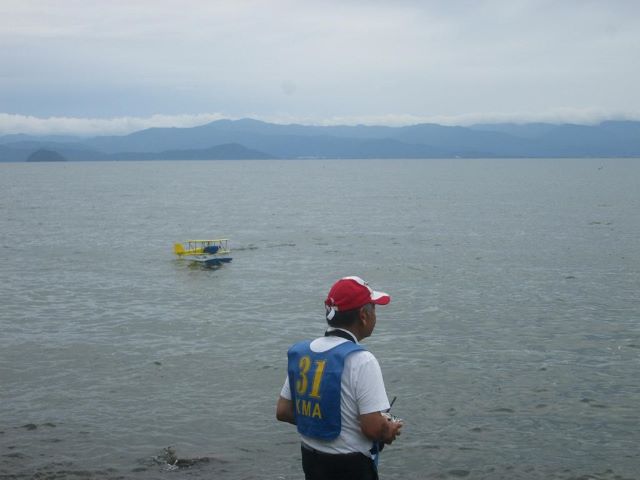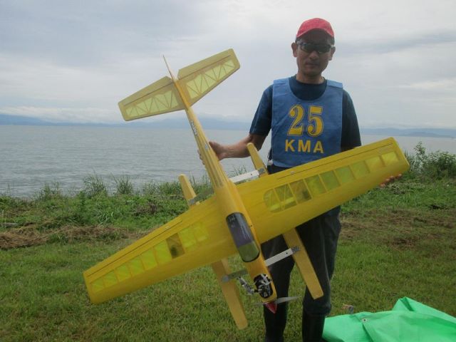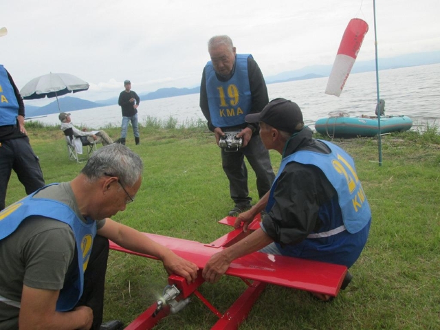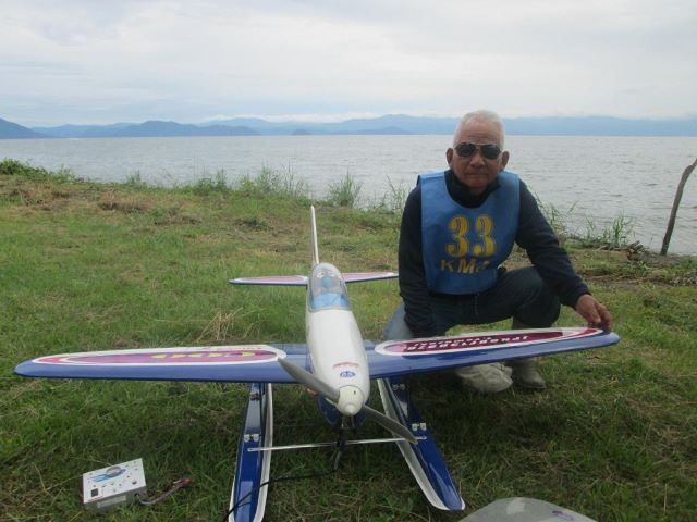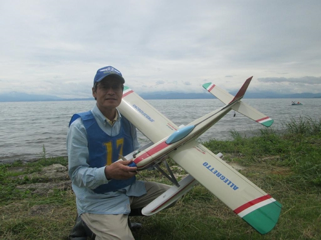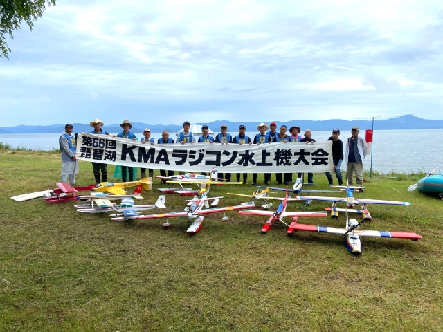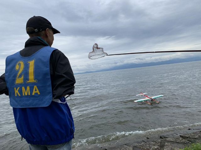 | 第66回 KMA琵琶湖水上機大会 6月9日 滋賀県高島市新旭町琵琶湖湖岸 大会前日の草刈りで整備された会場は気持ちの良い、緑の絨毯です!水上機委員の皆さん、暑い中での草刈り本当にご苦労様でした! さて、会場の天気は昨夜から降り始めた雨がまだやみません!しかし、レーダー観測によるとこの先止むようなので、委員長判断で大会は決行。時間が少し繰り下がりましたが、大急ぎで準備開始、8時過ぎに受付開始となりました。 本日の競技と参加者はA~タイムトライアル(タッチアンドゴー1回含む)の種目と、B~オープン級(フライイン)の2種目です。参加者はA種目が14名、B種目が9名の総数23名の参加です。 委員長の挨拶、選手として参加のKMA橋本会長からもご挨拶頂き、副委員長の競技・注意事項の説明、その後、全員での記念撮影、そして三原委員による150m高度をデモ飛行で確認し、その高度以下での飛行を参加者にお願いして大会がスタートしました。 天気の都合上、小雨降る中、B種目オープン級から飛行開始。送信機カバーを持参した人もいましたが、なくても支障ない程度の雨です。風は穏やかなのですが、波が少し高く、エンジン機はスタート時に波をかぶりエンストする機体もあり苦戦してました。 今回オープン級にもメダルを用意し、役員の投票で上位3名にメダルと表彰状が授与されます。ポイントは水上機として好感度、飛行姿勢、観客へのアピール度などです。結果は、遠路東京から参加の後藤さん(機体はアルバトロス電動機)が金賞、次に愛知から参加の須原さん(機体はスバル09エンジン機)が銀賞を、銅賞は東大阪から参加の辻本さん(機体はデカスロン60電動機)に決まりました。 10時前にはA種目のタイムトライアルとタッチアンドゴー(T&G)が開始されました。幸い雨も上がり熱い戦いのスタートです、マックス4分のタイムに挑戦、途中タッチアンドゴーをコールして行い、これを島田委員長自ら採点し、最高点はマックスタイム240点とT&Gの50点が加えられ290点が最高点です。4分を超えると1秒ごとに-2点を掛けて引かれますので、4分をオーバーすると減点が大きくなり、いかに4分に近づけるかが上位へ入賞のコツです。 結果は、車田晴夫さんが最高点268点で優勝です、準優勝は舩野庄司さんの265点でした、3位はKMA橋本会長さんが見事260点で入賞しました。 11時半ごろには弁当も配られ、曇天の中、各自食事をとりながら休憩せずに、第2ラウンドの飛行をゼッケン順に行いました。少し風も強くなり、波も高くなったような気がします。エンジン機のエンストが続出、救護ボートの出番が増えましたが、大きなトラブルもなく、時折降る雨の悪天候の中、皆さん水上機飛行を堪能されたことと思います。 13時半ごろには採点表・表彰状も出来上がり、表彰式に移りました。そのあと、恒例の参加賞の抽選会、父の日のプレゼントも兼ねた安曇川産ワインをじゃんけん大会でゲットする賑やかな声が響き、最後に島田委員長の閉会の挨拶でお開きとなりました。 最後に、お手伝い頂いた選手の皆様、水上機委員の皆様、本当に有難うございました。 今回御協賛頂きました会社様は以下の通りです(順不動、敬称略) 株式会社テトラ、双葉電子工業株式会社、株式会社OK模型、株式会社マルク、プラネット模型 この場をお借りしまして厚くお礼を申し上げます。 また、今回、能登半島地震により被災された方々への支援募金を参加者にお願いしました!趣旨にご賛同いただき、たくさんの支援金を頂き感謝します。早速、11日に京都新聞社に集まった支援金をお届けし、被災者への支援金に加えて頂くようお願いしました。改めてご協力頂いた皆様に、KMAとして心から感謝いたします。有難う御座いました。 (文、写真、:KMA橋本実) | ||