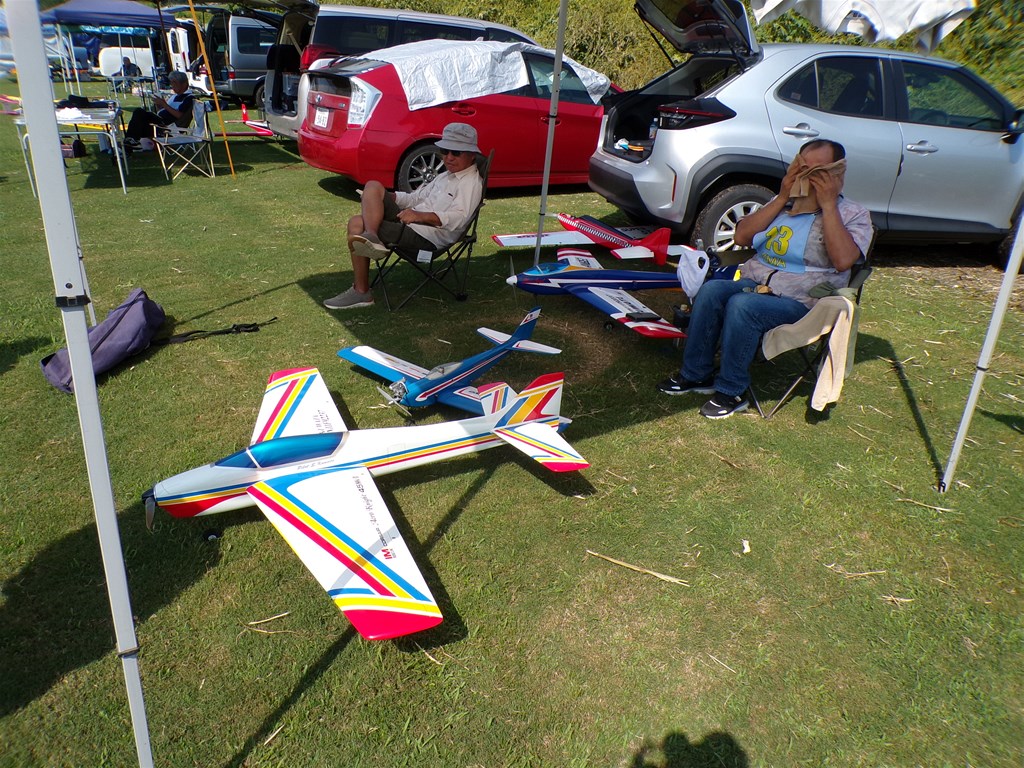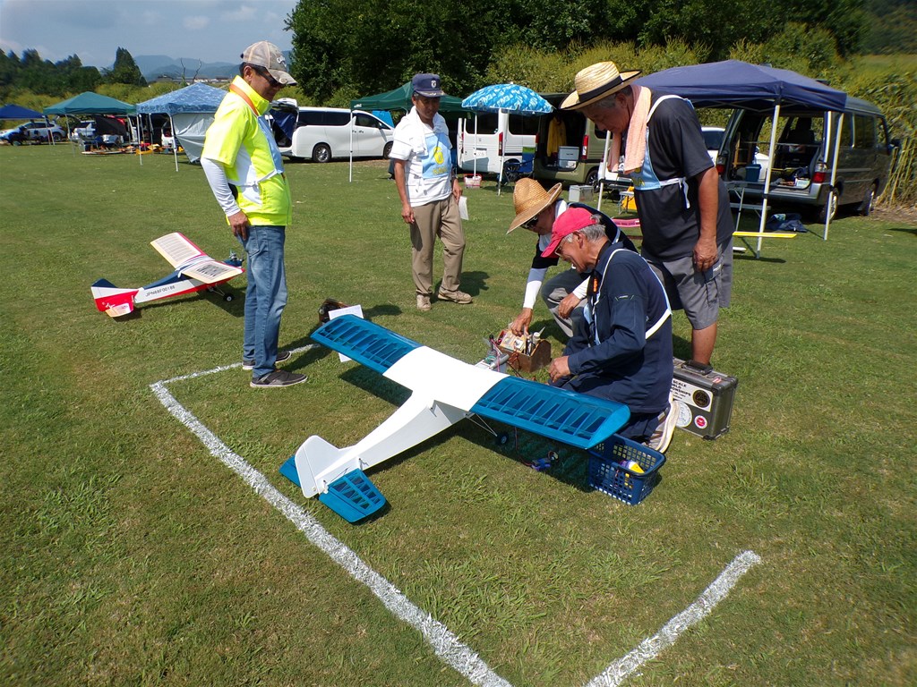 11.右側はクラスⅡ初参加の舩野庄司選手(福井)と 同じく初参加で助手の車田晴夫選手(大阪)。 車田選手はF4Hスケール機分野のベテラン、 共にプレーリー号で出場。 |