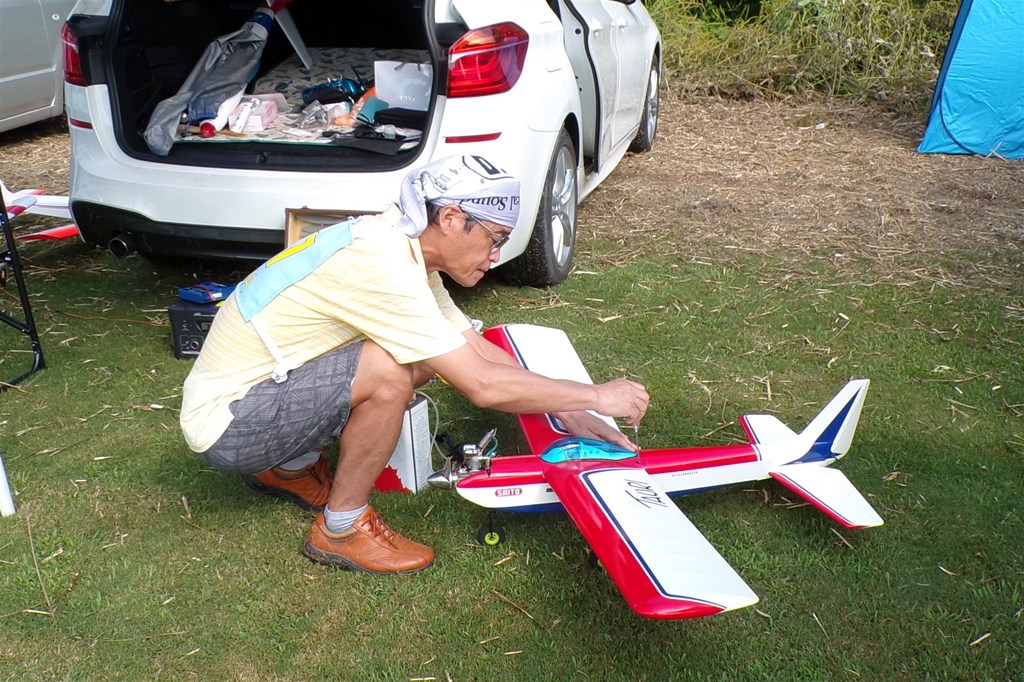 4.クラスⅠの出場準備をする八塚康史選手(広島)。普段はF3A選手でもあるが、シングル機の魅力にはまり研究に励んでいるようだ。 |