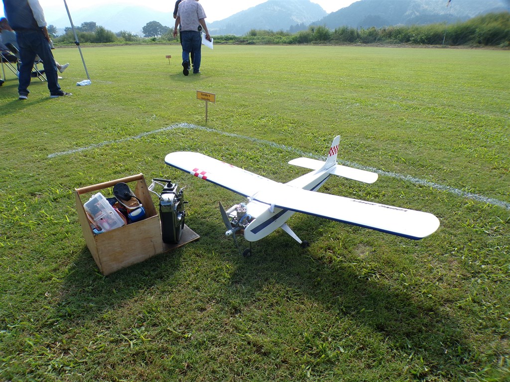 8.クラスⅠとⅡの共通機、ジェントルサンダーで 出場する中條延幸選手(東京)。設計図から エレベーターを装備して製作、もう5年以上 飛ばし続けているお気に入りの機体である。 |