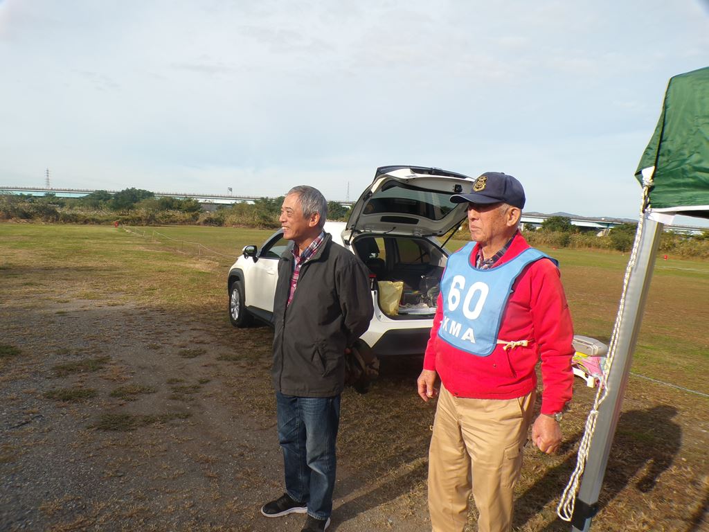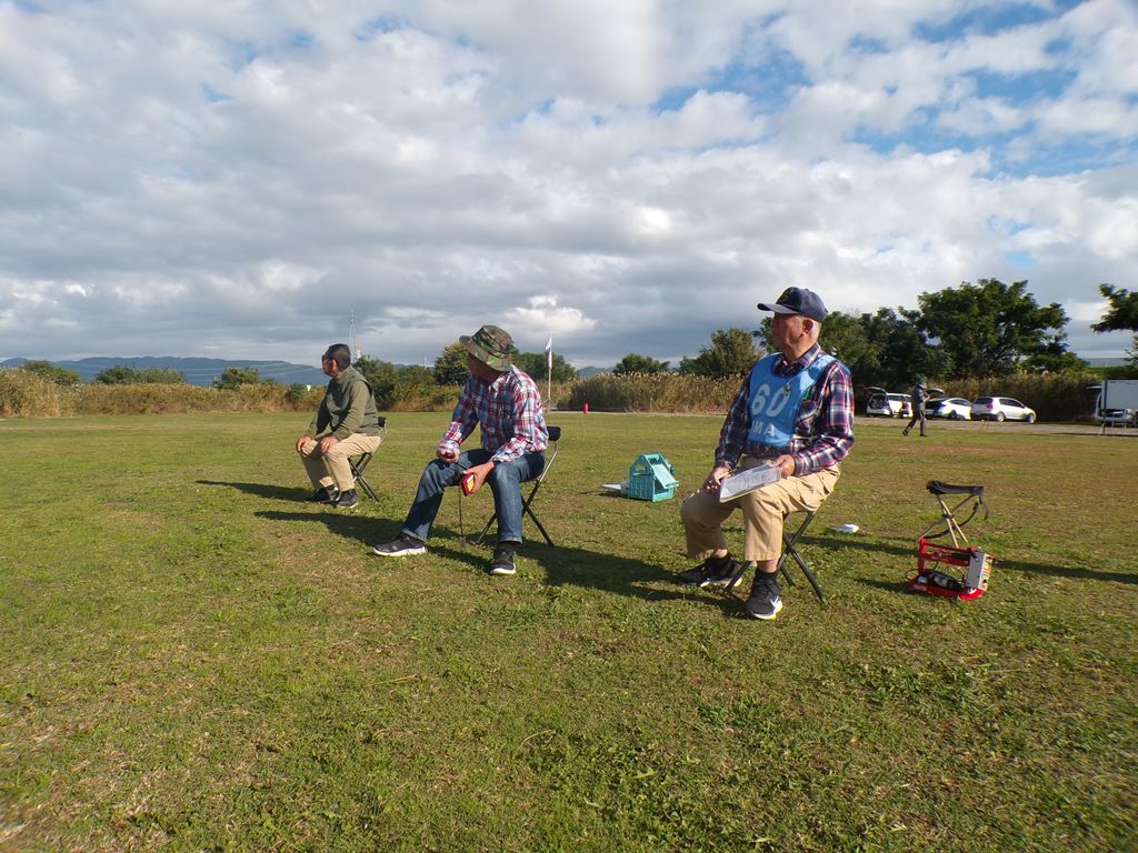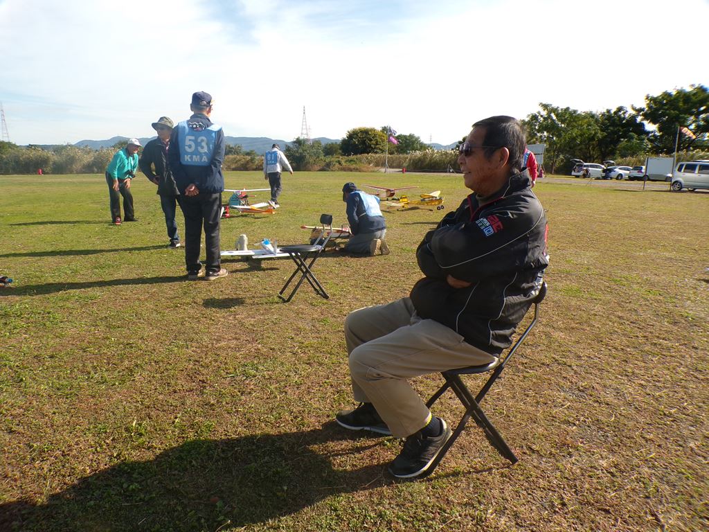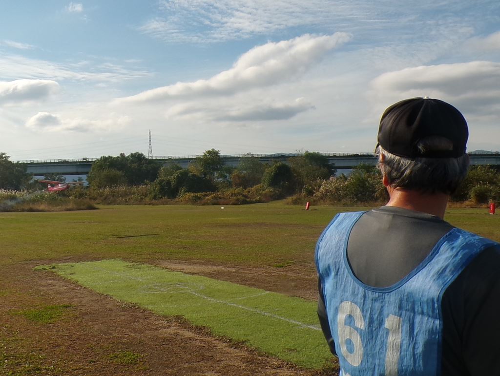 6.F3AやF3Cの選手権ジャッジの上田委員が安全飛行の監視をおこなっているが、この日はのんびりムード。 当然助手を付けて飛行をおこないます。 |