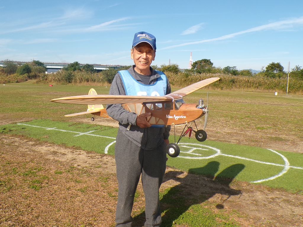 20.電動仕様のミスアメリカJrを手にご満悦な 本田さん。飛行機製作はプロの腕前。 |