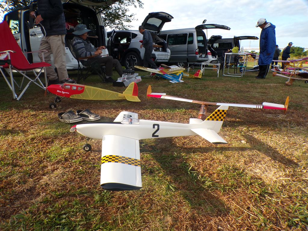 参加者のほとんどは、2~5機を準備してきます。午前中は自由フライトの時間で参加者順次持ち寄った力作機を空に上げていきました。昼休みを挟んで午後からはタッチ&ゴー競技です。準備ができた選手からスタートします。これもあせることなく安全飛行の運営スタイルと言えそうです。競技が終わるとまた自由飛行の時間になります。その間ピットでは飛行に疲れた参加者は、模型飛行機談議で楽しんだようでした。 今回は競技表彰とは別に、ベストモデラー賞、ベストフレンド賞を設けて、ラジコン普及の期待を込めた賞が与えられました。