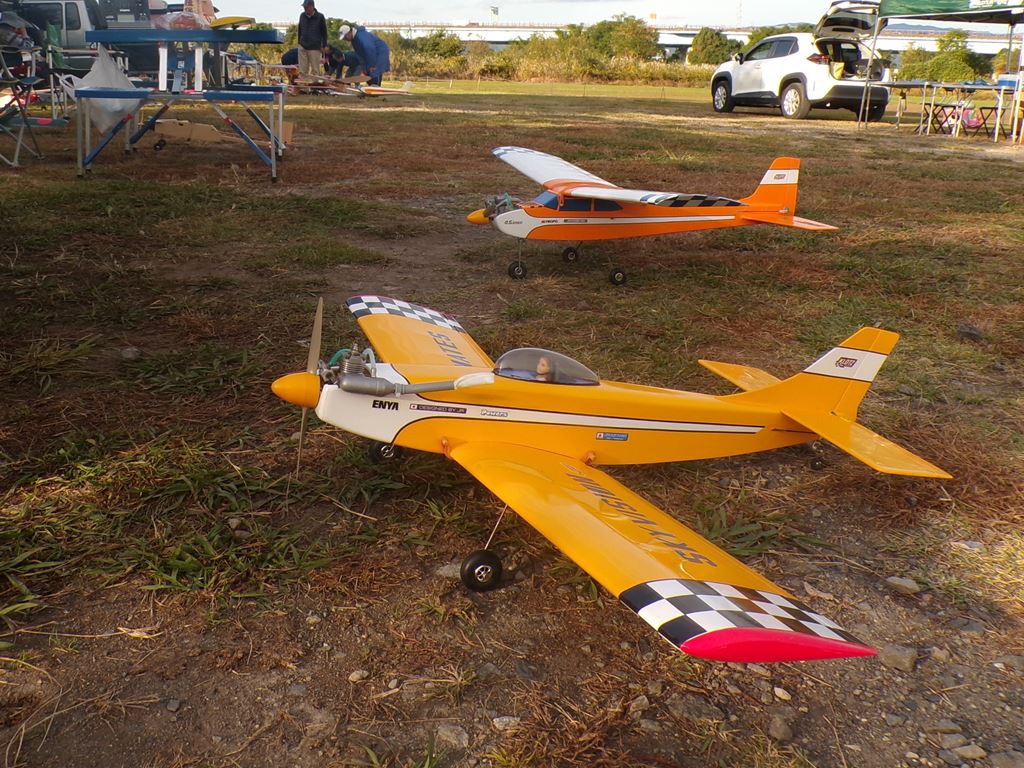 26.手前はスカイビジョンメイツ、ENYA09ⅢTVと、日の出スカイビーム15にOS-MAX15ⅢRC搭載したラダーシングル機。エレベーターの無い飛行はこれだけであった。 |