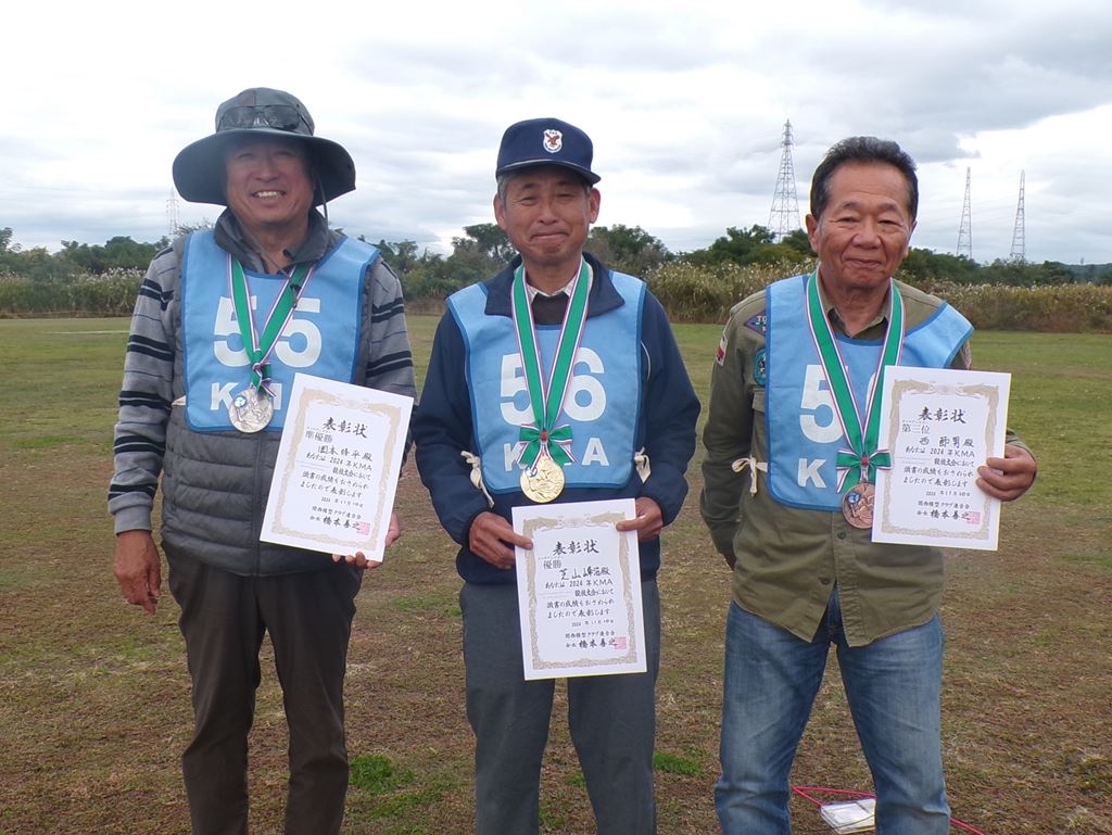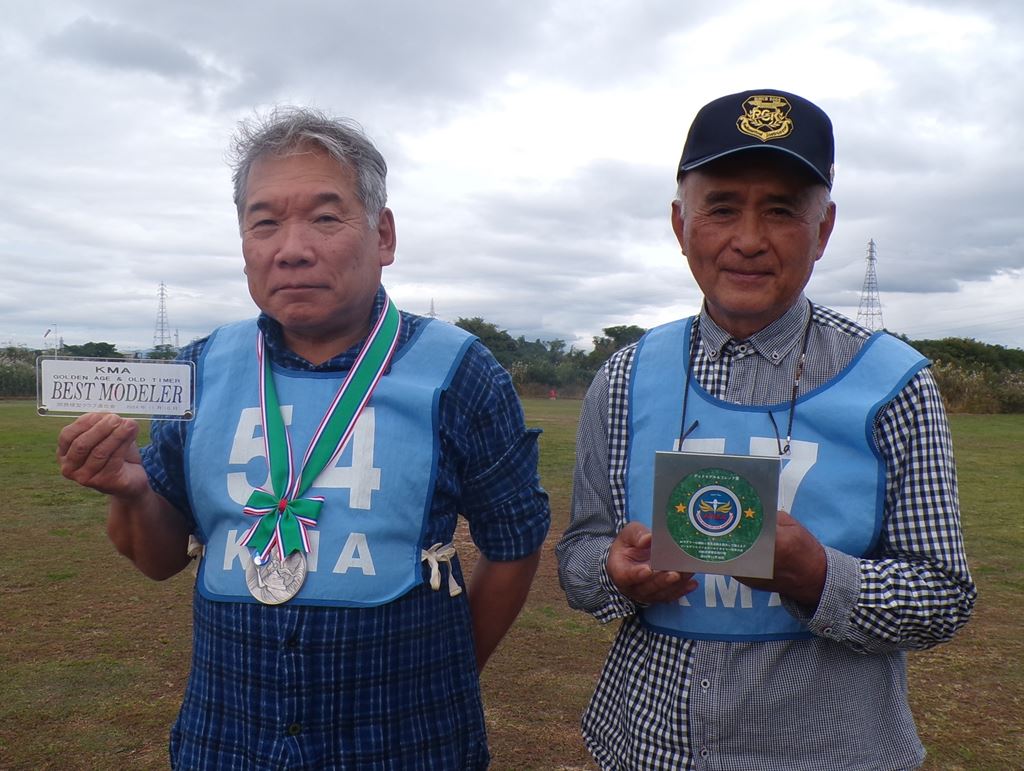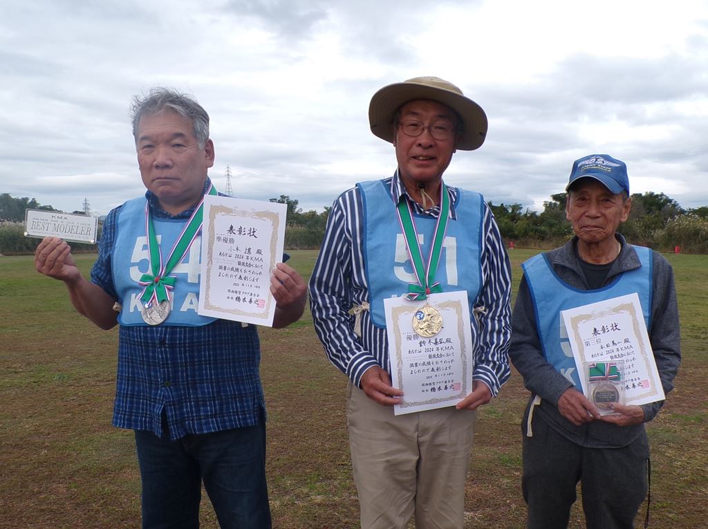 30.ゴールデンエイジ部門のタッチ&ゴー競技入賞者、左から2位の岡本順一さん、1位の芝山峰治さん、3位の西節男 さんに賞状とKMA記念メダルが渡されました。 |