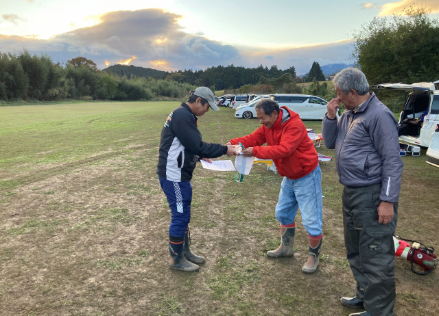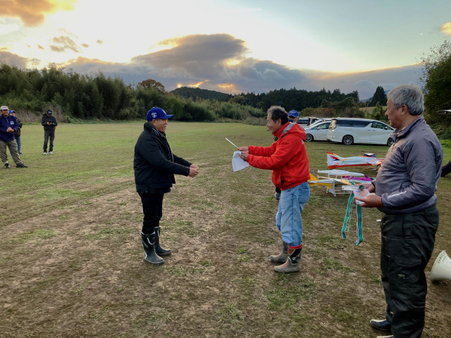 | 2024年 第9回 KMA70クラス曲技飛行競技大会 11月24日 KMA 福知山鬼の里模型飛行場 今年の最後になる大会です。日の入りも一年で一番早くなる時期(16時半に山に隠れる)ですから、できるだけ早く終了しないといけません。加えて南向きの飛行場で太陽が低くなるので、太陽が顔を出すと、飛行機が見えないくらいまぶしい条件でのフライトになります。雲が多ったですが、時折顔をだす太陽は特に眩しく、翻弄された一日でした。出番も実力のうちともいわれますが、ほんとそのとおりでした。皆さんサングラスや流鏑馬の活用で皆さん頑張ってくれました。 今年は25名の申し込みがありました。今年は高知から来場いただき、中部や福井からも毎年ありがとうございます。しかし、当日の急用や体調不良で2名が不参加になり、23名での戦いになりました。競技内容は午前中はF3A(P25)を行い、午後からはJRAのスポーツマン演技です。飛行技術の基本から応用までのトータルで競い合いました。F3Aでは2人ジャッジで1220点満点。スポーツマン演技ではジャッジ一人の満点が250点ですので、5人のジャッジとして、1250点満点と同等のウエイトとしました。そして2023年、2024年の選手権出場者は演技を背面飛行で行うルールとしました。狙いはスポーツマンでの逆転があれば面白いなあーと、委員長の企みでした。 スタートから終了まで、太陽が雲に隠れたり、顔を出したりと、これはくじ運次第でしたね。何度も飛行機を見失った方もあったような。風も時折、乱流もあったりで。結果、優勝は東選手、準優勝は安田選手、第三位が津田選手でした。東選手はP25でトップ、2位は津田選手、3位が安田選手でしたが、スポーツマン演技で安田選手が逆転しました。スポーツマンでは八倉選手がトップで12位から順位を上げましたが、10点及ばず4位でした。スポーツマンでは離着陸も採点されるため、普段、着陸を丁寧にしてしない癖があるのか、着陸で点が伸びない方もおられました。また選手権出場者には背面で演技していただきましたが、委員長の期待を裏切らない方がいました。見事にゼロ点を取ってくれました。やったー!スポーツマンの着陸でもありましたね。スポーツマン演技は波乱を呼びますね。 でも皆さん、基本となるスポーツマン演技が上手で、思ったより高得点になり、スポーツマン演技のウエイトが結果として高くなってしまいました。スポーツマンで順位の入れ替わりが結構あり、面白いので、来年もこのままいこうかな。 ジャッジの講評の中で、飛行機が小さいので、飛行距離や速度の注意や、調整が甘い機体、舵打ちが荒いなどが見受けられるとの指摘もありました。反省ですね。 大会の運営に協力をいただきました林田審査員、加藤審査員、羽根田審査員、林田(卓)審査員、並びに集計などを担当いただきました山原役員、藤本役員には御礼申し上げます。 KMA RC曲技委員長 神戸 | ||