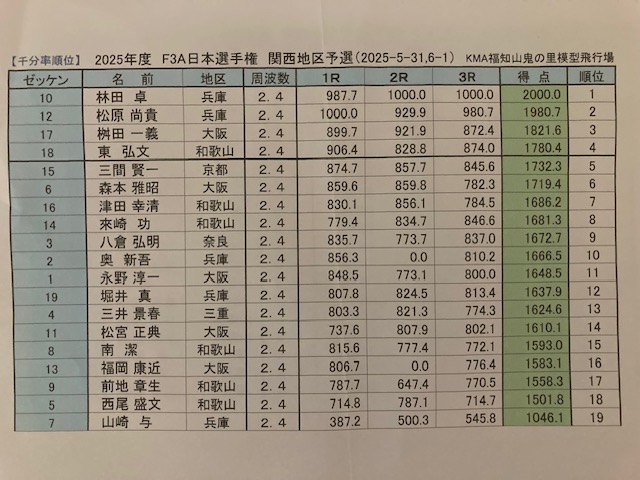 | 2025年度F3A日本選手権&オールジャパン関西地区予選 5月31日~6月1日 KMA福知山鬼の里模型飛行場 今年度は関西F3Aフライヤーから19名のエントリーをいただきました。日本選手権は4名とオールジャパンは7名の予選通過の椅子を争っての試合となりました。 週間天気予報でも不安定な天候との予報で、2日間の大会運営が心配されましたが、当日、大会会場に到着すると雨は降っておらず予選を開始することができました。ただ、風が強くなるとの予報で出番によっては風の状況に左右されるので運も味方につけないといけません。全3ラウンドで演技事の上下カットの千分率の良いほうの2ラウンド合計で勝敗を決めていきます。 まずは、機体検査からスタートして検査が終了したのち、中村さんによる目慣らし飛行と、フレーム確認飛行を実施していただきました。 さて、いよいよ1ラウンド目の開始です。初日1番バッターを引き当てたのは、ベテランフライヤーの永野選手でした。2番目には唯一エンジン機での参加の奥選手と続きます。この辺りから風が強くなりだしました。お昼くらいに、1ラウンドが終了し、トップは松原選手。2位に林田選手、3位に東選手、4位に桝田選手、5位に三間選手と続きます。松原選手は、去年林田選手が2ラウンドトップで2000点獲得し、3ラウンド目を辞退した時にラウンドトップを獲得していますが、フルメンバー参加選手権予選でのラウンドトップは、初めてで、2ラウンド目に向けての気合を感じました。そして、お楽しみのランチタイム。毎回美味しいお弁当を届けていただきありがとうございます。 そして、午後より2ラウンド目のスタートです。相変わらず風は強く選手の皆さんは大変苦労されています。2ラウンド目のトップバッターは、山崎 與選手、次に南選手と続きます。2ラウンド目の結果は、トップが林田選手、2位が松原選手、3位が桝田選手、4位が森本選手、5位が三間選手と続きます。 2ラウンド総合での3位から5位の東選手、桝田選手、森本選手、三間選手が四つ巴の戦いになっています。 2日目も中村さんの目慣らしとフレーム確認飛行後、3ラウンド目最終ラウンドのスタートです。トップバッターは、来崎選手です。昨日の風より大分ましになっていますが、上空ではまだ風の悪いところが有るようです。2番手に三間選手、3番手に津田選手と続きます。 3ラウンド目の結果は、1位が林田選手、2位が松原選手、3位が東選手、4位が桝田選手、5位が来崎選手、6位が三間選手となりました。 総合順位としては、1位が林田選手、2位が松原選手、3位が桝田選手、4位が東選手、5位が三間選手、6位が森本選手になりました。 日本選手権予選通過者は、林田・松原・桝田・東選手で補欠が三間・森本選手となりました。 オールジャパン予選通過者は、三間・森本・津田・奥・永野・三井・松宮選手となりました。 日本選手権の会場は、今年も去年と同じ高知県での開催になり、比較的近い場所での開催ですので、選手の方々は最高のパフォーマンスを発揮されますことを祈っております。 最後に、審査員として上田審査員 神戸審査員 加藤審査員 計算進行などにご協力いただきました山原役員、藤本役員、中村役員にはお礼申し上げます。ありがとうございました。 文/写真:KMA 曲技委員会 林田 | ||