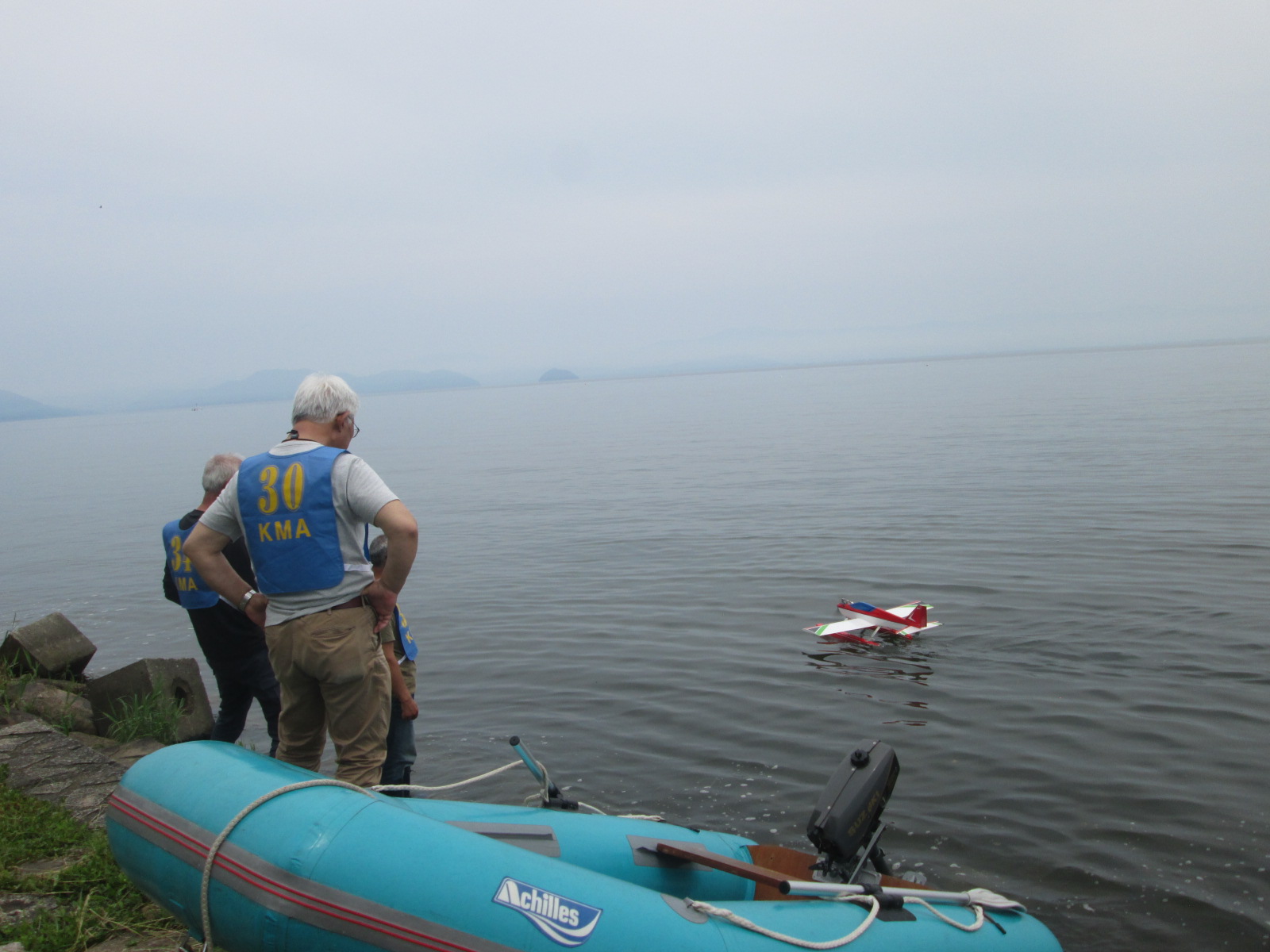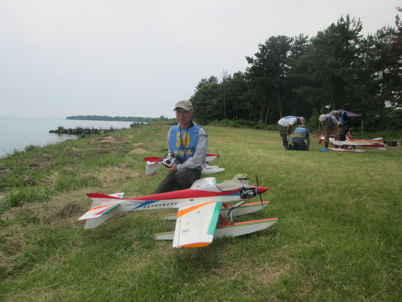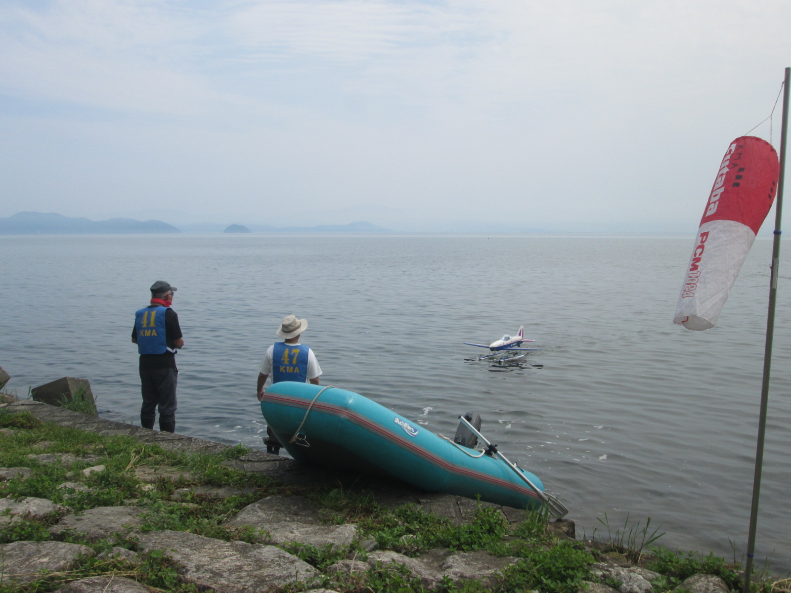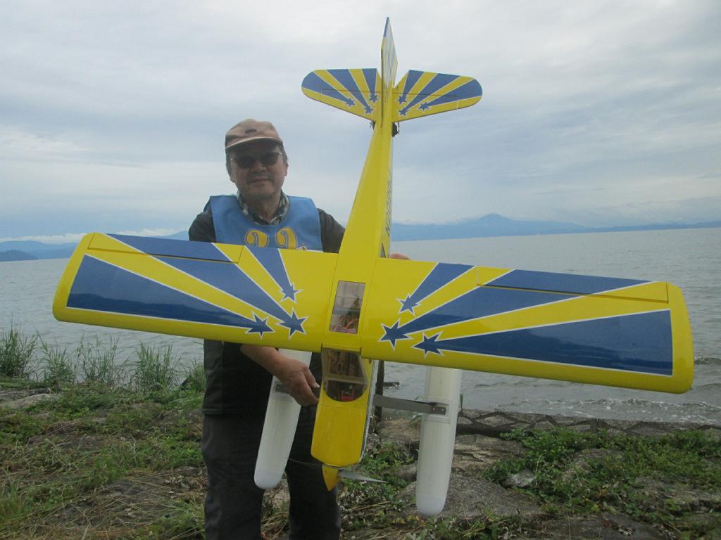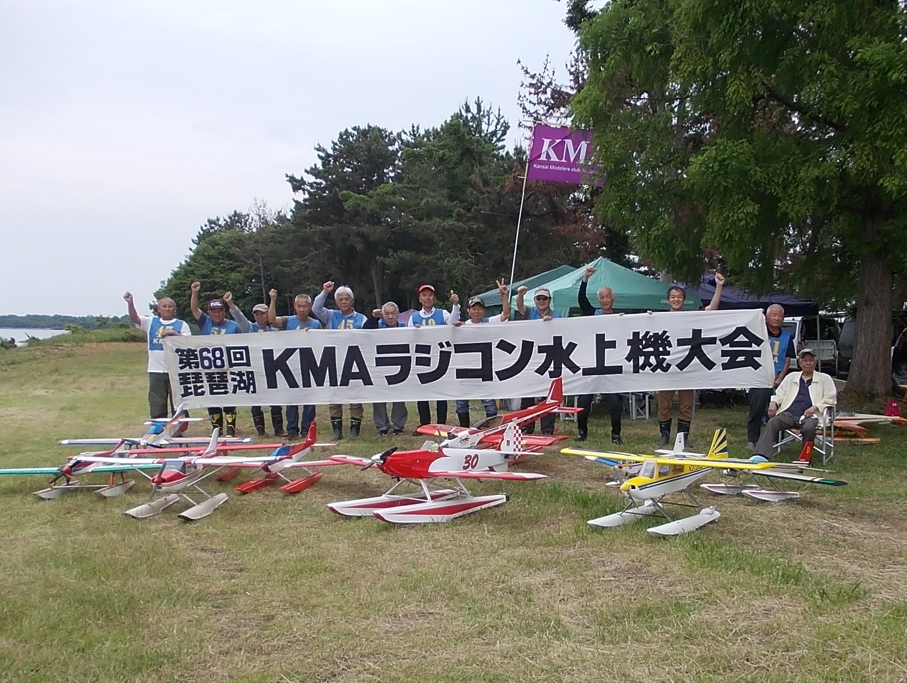 | 第68回 KMA琵琶湖R/C水上機大会 6月8日 滋賀県高島市新旭町琵琶湖湖岸 梅雨入りかと思われる天気の中の6月8日、第68回の水上機大会が行われました。幸い当日は雨も降らずに、空も波も穏やかな一日で最高の状態で進められました。新旭町琵琶湖湖岸のいつもの会場は、大会前に地元の湖岸整備グループのメンバーと一緒に広い範囲で草刈りを行いましたので、芝生のような気持ちの良い会場での競技会ができました!草刈りにご協力頂いた皆様、心から感謝申し上げます。 さて、競技はタイムトライアルとフライインの2種目です、ダブルエントリーを含め、総勢22名での競技会となりました。前日から会場設営で車中泊の役員が早朝6時から準備をはじめ、8時から受付開始となりました。いつもの島田委員長の挨拶、KMA橋本会長の挨拶に続き、参加者全員での記念撮影、150m高度確認のデモフライトを終え、いよいよ1種目目のタイムトライアル競技がスタートしました。今回もタイムトライアルは4分に挑戦、途中にタッチアンドゴーを行って、着水までの時間での順位を競います。今回は役員も参加しますが入賞は辞退、ですので一般参加者は入賞の確率が大です!結果、優勝は西宮市の山崎さん、準優勝は東大阪の車田幸治さん、3位は愛知からお越しの須原さんに決まりました。 引き続きフライインのスタートです。この競技の入賞は飛行ぶり、機体の鑑賞度、観客へのアピール度などを役員数人の投票で決定します。少し役員の好みに左右されますがご勘弁を!結果は、金賞は神戸RCの西さん(機体:カルマート91)、銀賞は京都RCヘリクラブの辻本さん(機体:デカスロン60電動)、銅賞は敦賀市からお越しの舩野さん(機体:セスナ182)のお三方に決まりました。入賞の皆さまおめでとうございました。 2種目それぞれ2ラウンドを実施し、途中食事休憩も入れて、ゆっくりと競技を進めました。天気も曇りですが、雨もなく、風も弱く、波も静かで例年にない、ベストコンディションでした。参加者も堪能されたのか、午後2時前に空に飛行機がなく、自由フライトのアナウンスにも反応がないので、少し早いのですが閉会式に移りました。 まず、競技結果の発表と表彰式です。その後、参加賞の抽選でゼッケンの返却と、一委員の遊休品エンジンと機体のオークション、さらに父の日に合わせたワインが当たるジャンケン大会などをにぎやかに行い、最後に委員長の閉会の挨拶でお開きとしました。参加者・役員の皆さんお疲れさまでした。9月秋の大会でまたお会いしましょう! 最後になりましたが今回協賛品でお世話になりました(株)テトラ様、有難う御座いました。また、最後まで片付けと撤収にご協力頂きました役員の皆様、大変有難う御座いました。この場を借りて厚く御礼申し上げます。 文と写真:KMA水上機委員 橋本 実 | ||