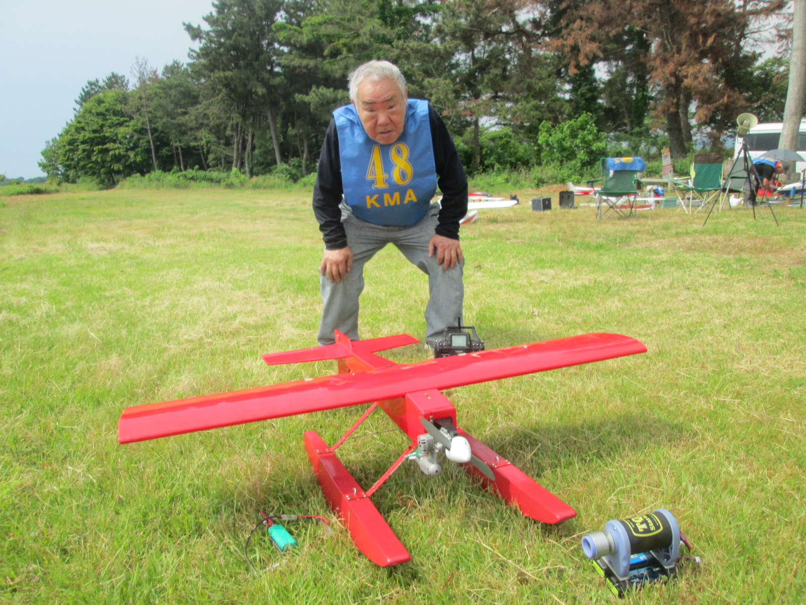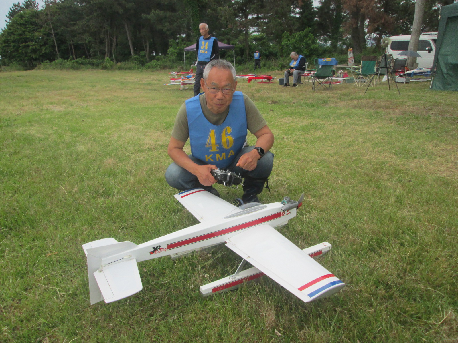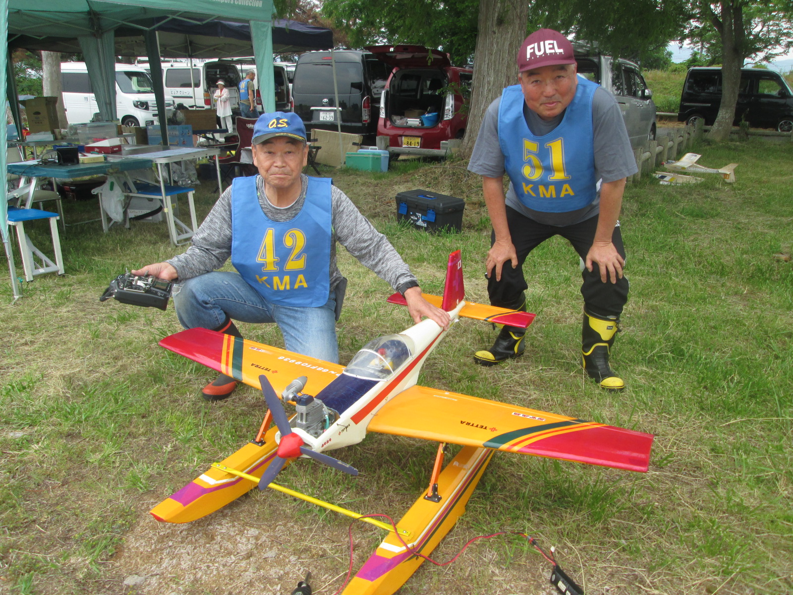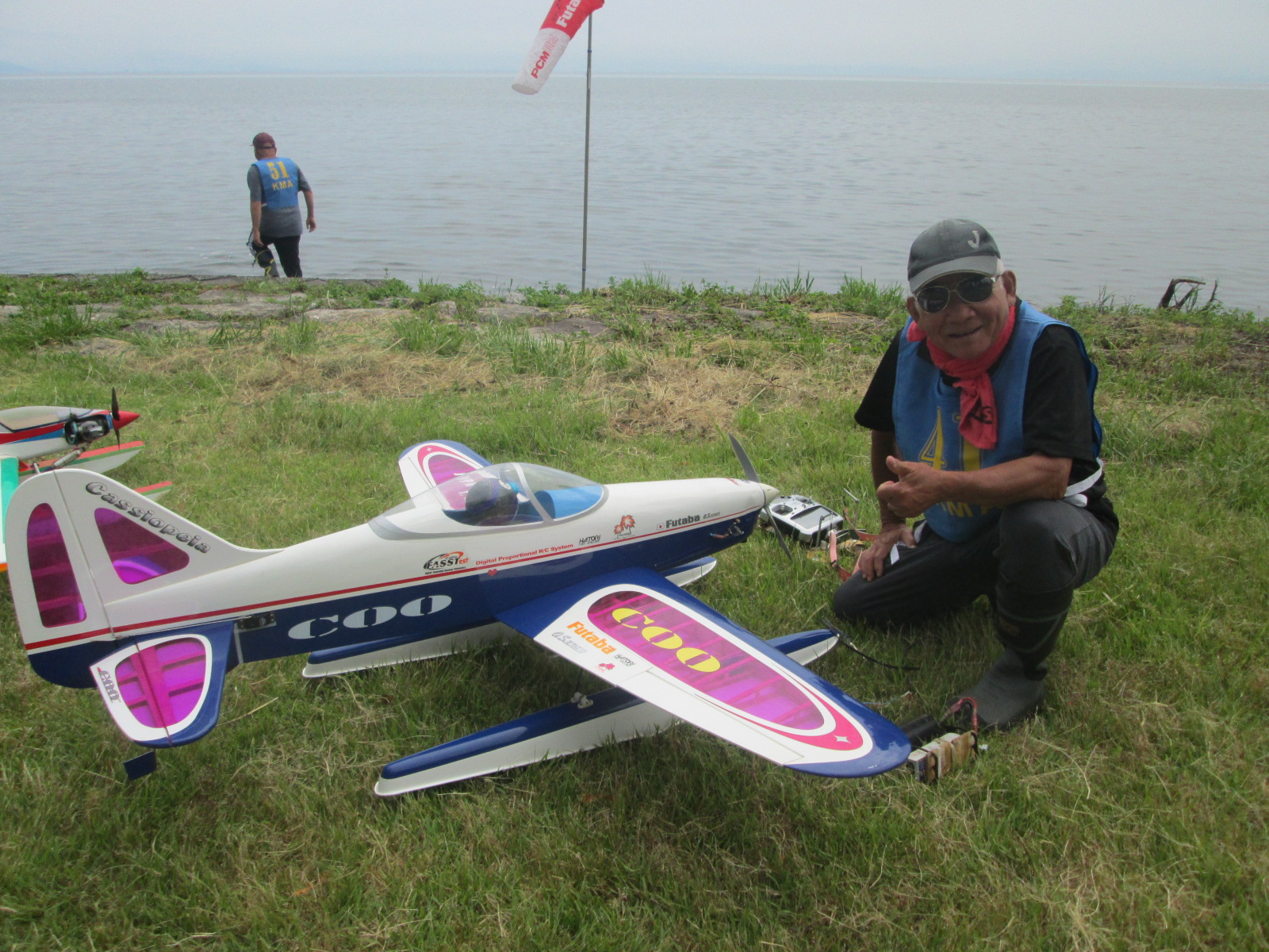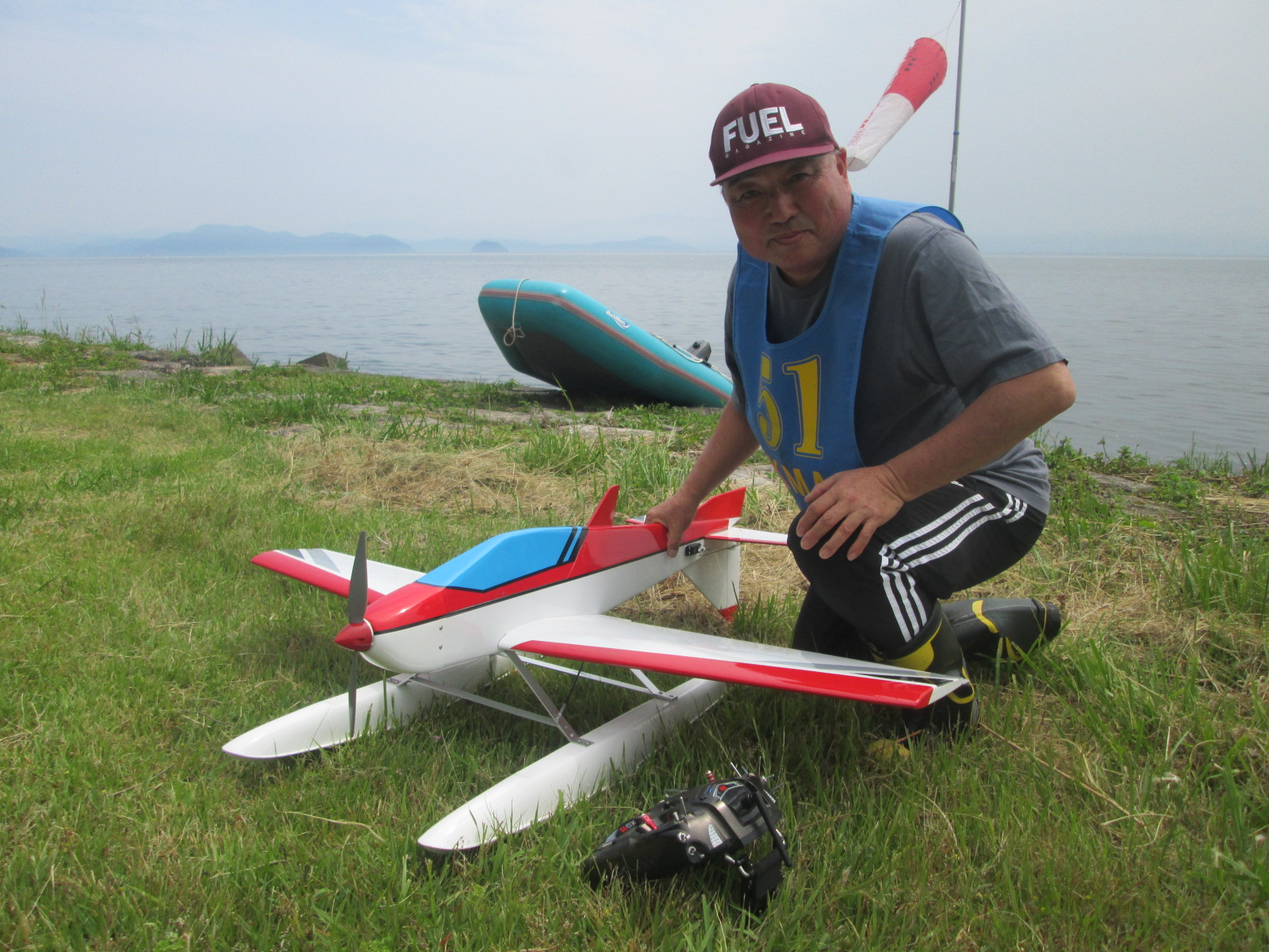 | 第68回 KMA琵琶湖R/C水上機大会 6月8日 滋賀県高島市新旭町琵琶湖湖岸 梅雨入りかと思われる天気の中の6月8日、第68回の水上機大会が行われました。幸い当日は雨も降らずに、空も波も穏やかな一日で最高の状態で進められました。新旭町琵琶湖湖岸のいつもの会場は、大会前に地元の湖岸整備グループのメンバーと一緒に広い範囲で草刈りを行いましたので、芝生のような気持ちの良い会場での競技会ができました!草刈りにご協力頂いた皆様、心から感謝申し上げます。 さて、競技はタイムトライアルとフライインの2種目です、ダブルエントリーを含め、総勢22名での競技会となりました。前日から会場設営で車中泊の役員が早朝6時から準備をはじめ、8時から受付開始となりました。いつもの島田委員長の挨拶、KMA橋本会長の挨拶に続き、参加者全員での記念撮影、150m高度確認のデモフライトを終え、いよいよ1種目目のタイムトライアル競技がスタートしました。今回もタイムトライアルは4分に挑戦、途中にタッチアンドゴーを行って、着水までの時間での順位を競います。今回は役員も参加しますが入賞は辞退、ですので一般参加者は入賞の確率が大です!結果、優勝は西宮市の山崎さん、準優勝は東大阪の車田幸治さん、3位は愛知からお越しの須原さんに決まりました。 引き続きフライインのスタートです。この競技の入賞は飛行ぶり、機体の鑑賞度、観客へのアピール度などを役員数人の投票で決定します。少し役員の好みに左右されますがご勘弁を!結果は、金賞は神戸RCの西さん(機体:カルマート91)、銀賞は京都RCヘリクラブの辻本さん(機体:デカスロン60電動)、銅賞は敦賀市からお越しの舩野さん(機体:セスナ182)のお三方に決まりました。入賞の皆さまおめでとうございました。 2種目それぞれ2ラウンドを実施し、途中食事休憩も入れて、ゆっくりと競技を進めました。天気も曇りですが、雨もなく、風も弱く、波も静かで例年にない、ベストコンディションでした。参加者も堪能されたのか、午後2時前に空に飛行機がなく、自由フライトのアナウンスにも反応がないので、少し早いのですが閉会式に移りました。 まず、競技結果の発表と表彰式です。その後、参加賞の抽選でゼッケンの返却と、一委員の遊休品エンジンと機体のオークション、さらに父の日に合わせたワインが当たるジャンケン大会などをにぎやかに行い、最後に委員長の閉会の挨拶でお開きとしました。参加者・役員の皆さんお疲れさまでした。9月秋の大会でまたお会いしましょう! 最後になりましたが今回協賛品でお世話になりました(株)テトラ様、有難う御座いました。また、最後まで片付けと撤収にご協力頂きました役員の皆様、大変有難う御座いました。この場を借りて厚く御礼申し上げます。 文と写真:KMA水上機委員 橋本 実 | ||